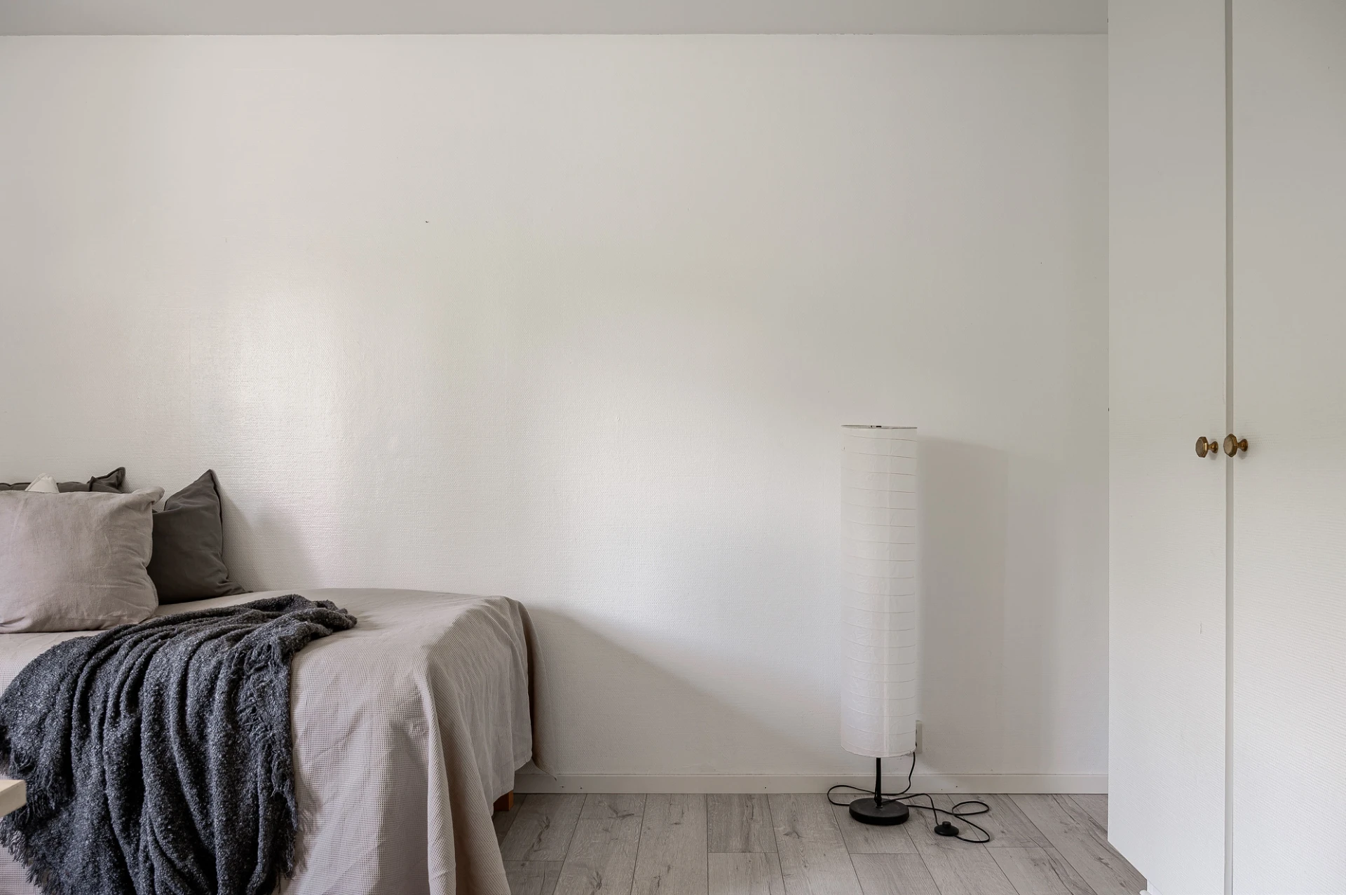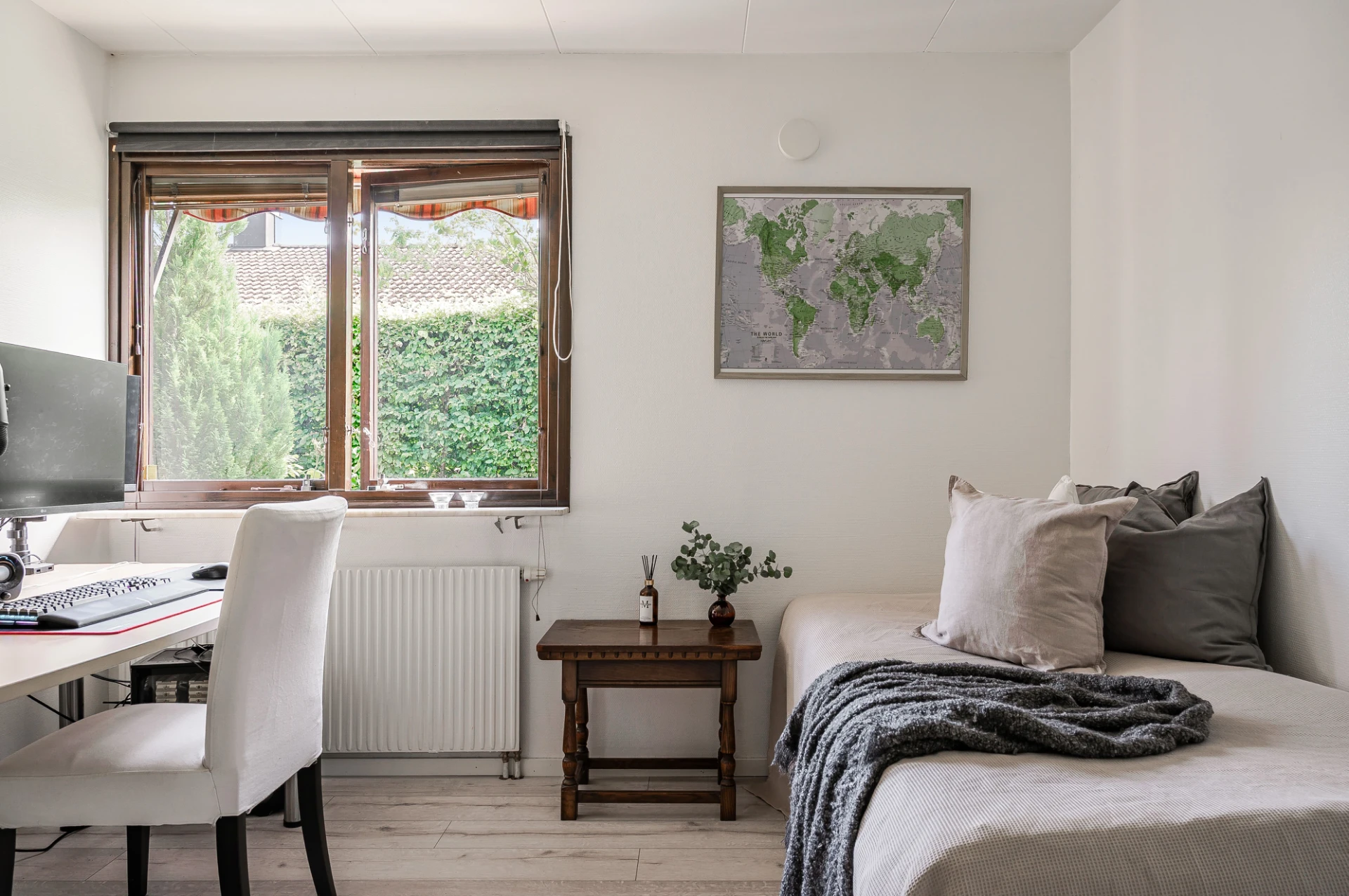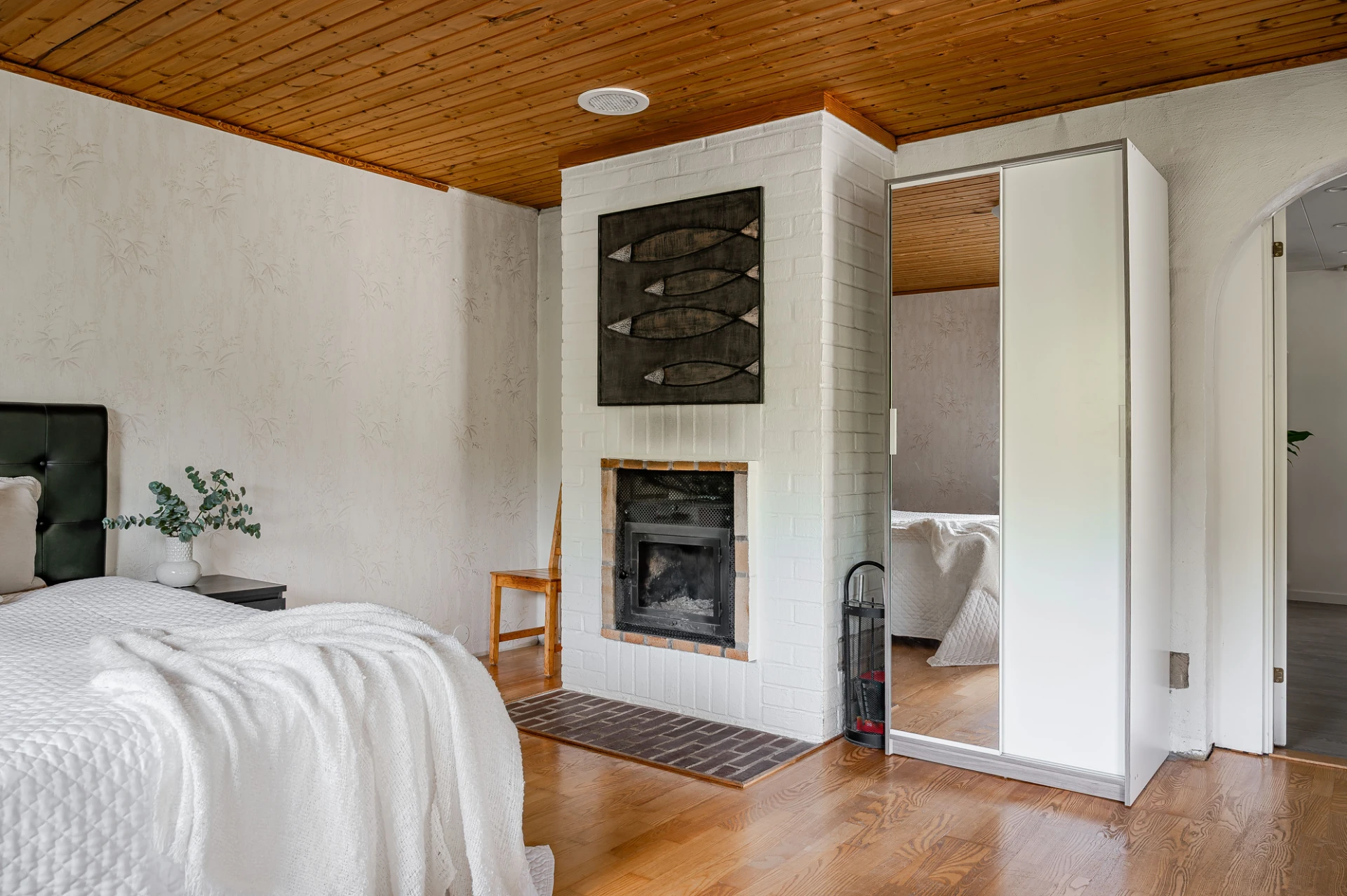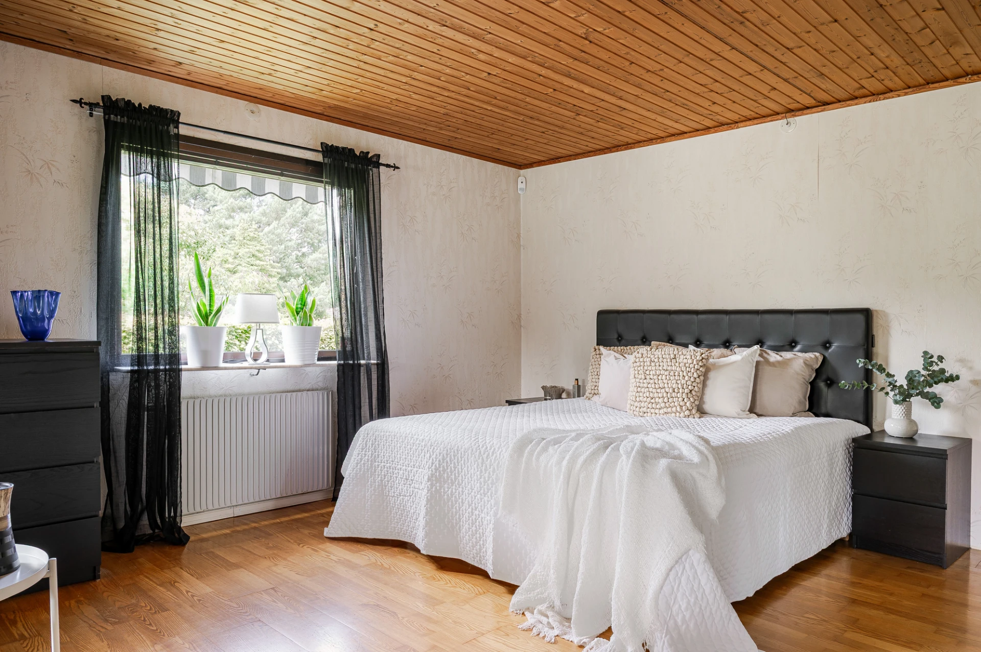 Bostaden rymmer tre sovrum av olika storlek. Ett av sovrummen har garderobsvägg med gott om förvaring, ett annat har utgång mot uteplats och det största sovrummet erbjuder både garderob och charmigt trätak som skapar en varm atmosfär.