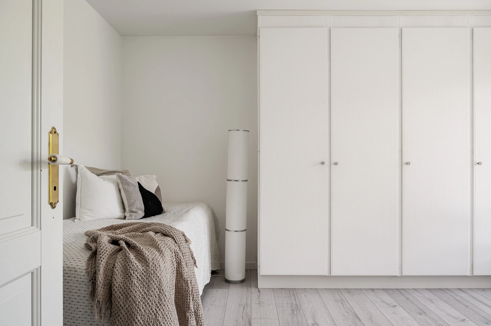 Vita väggar, ljust laminatgolv. Garderobsvägg med vita luckor.