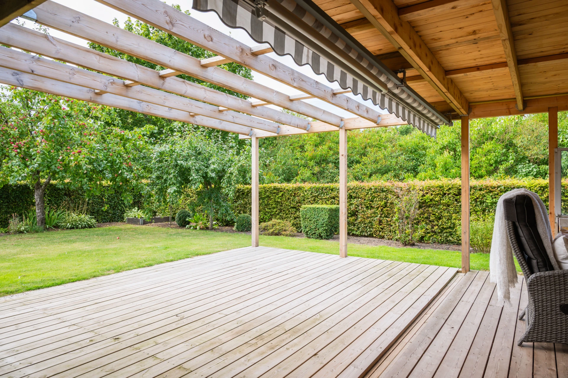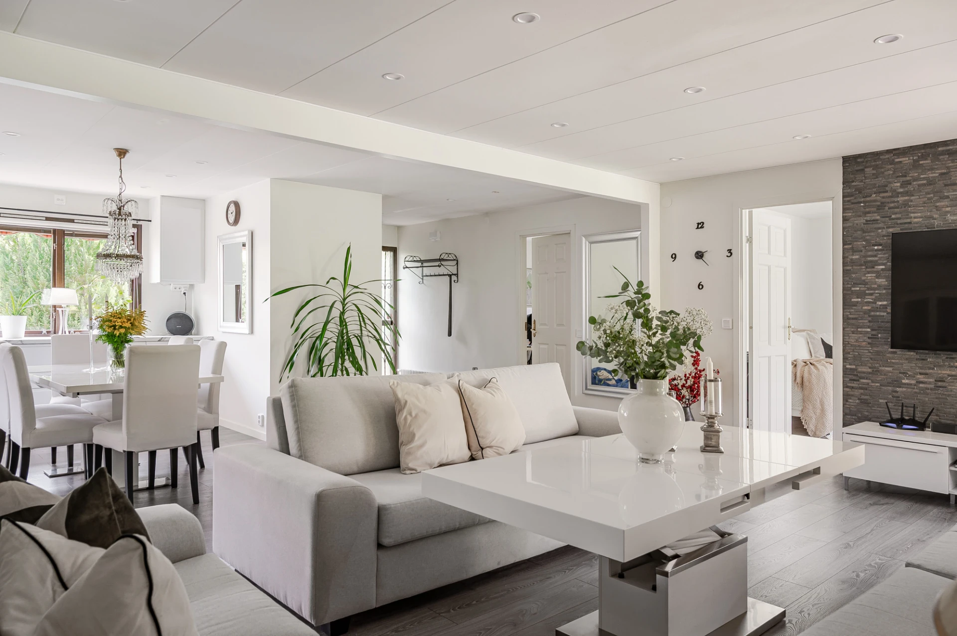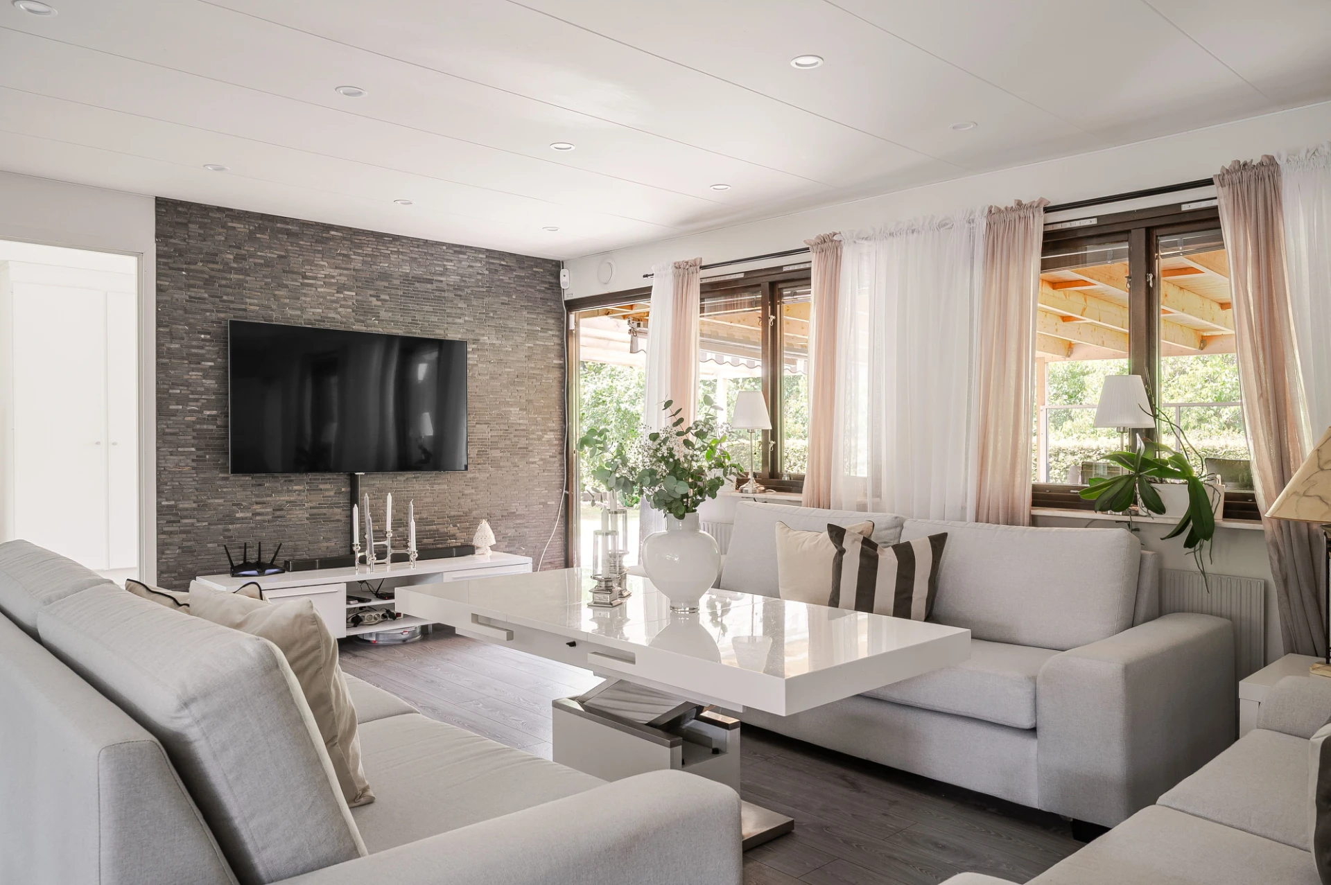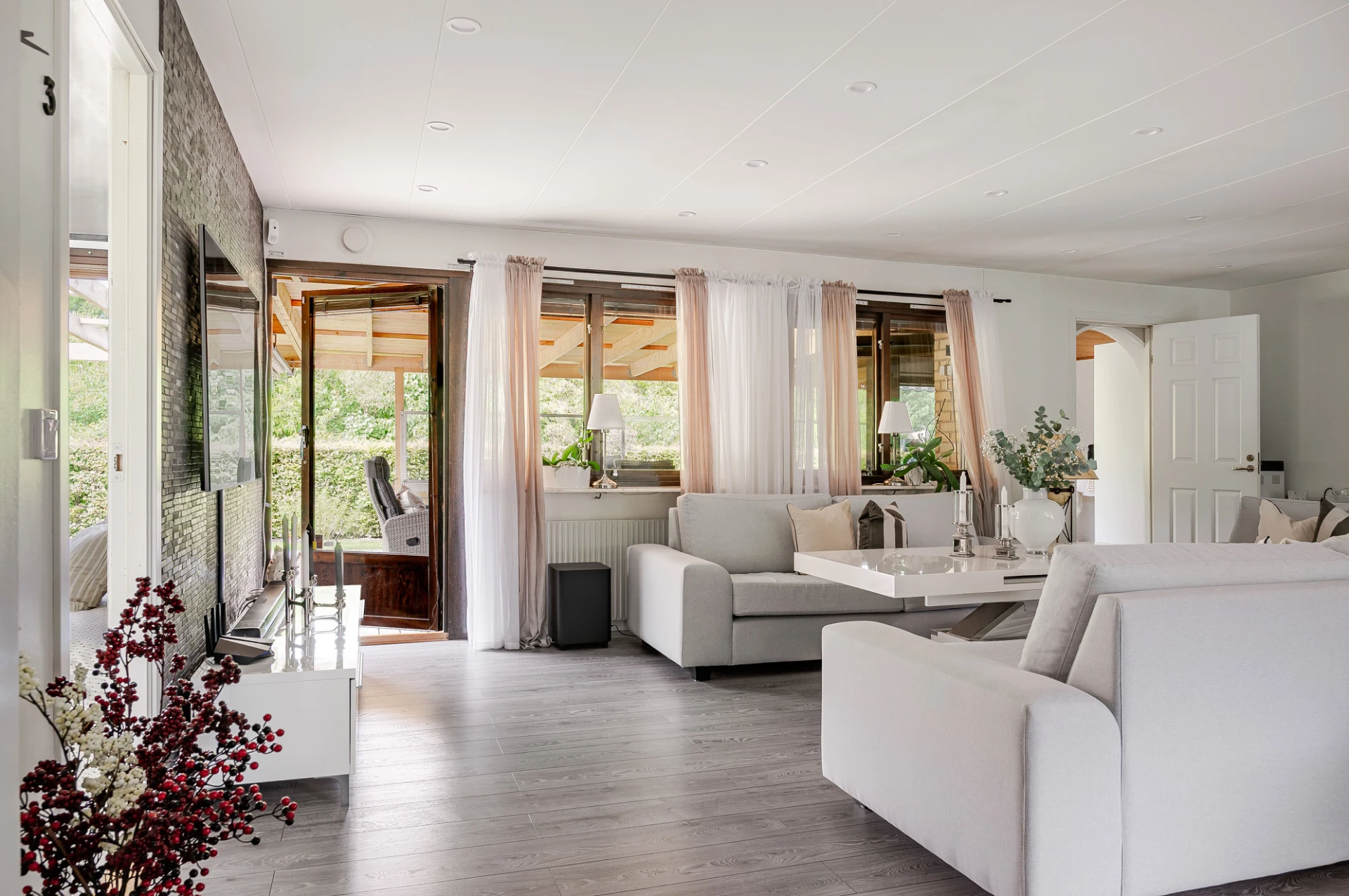 Vardagsrummet är luftigt och ljust med vitmålade väggar, grå laminatgolv och en fondvägg i stenimitation som ger rummet karaktär. Härifrån når du den stora takade altanen, en perfekt plats för umgänge året runt.