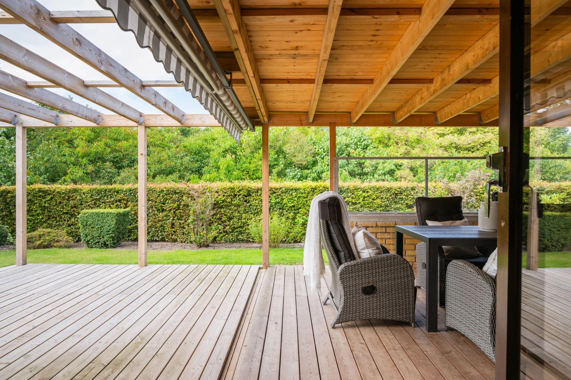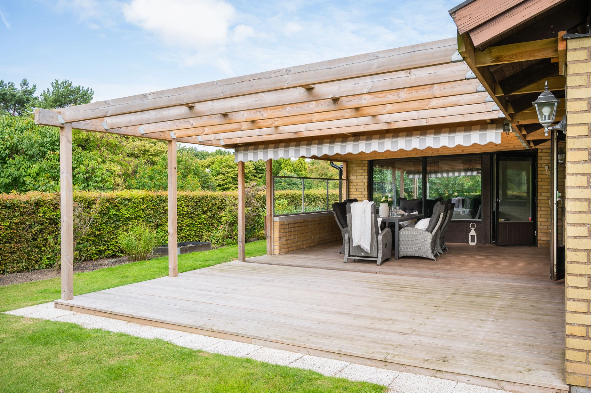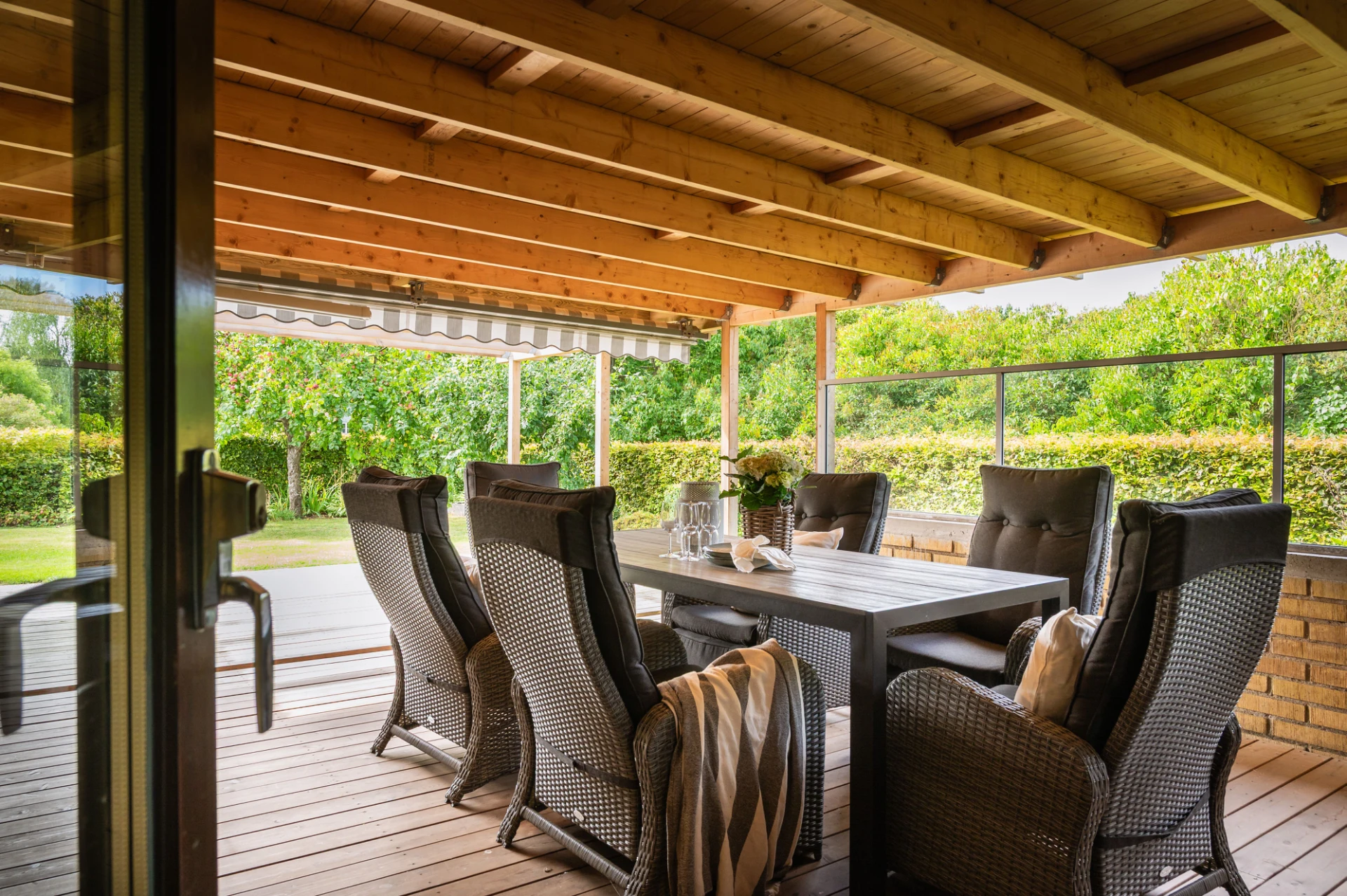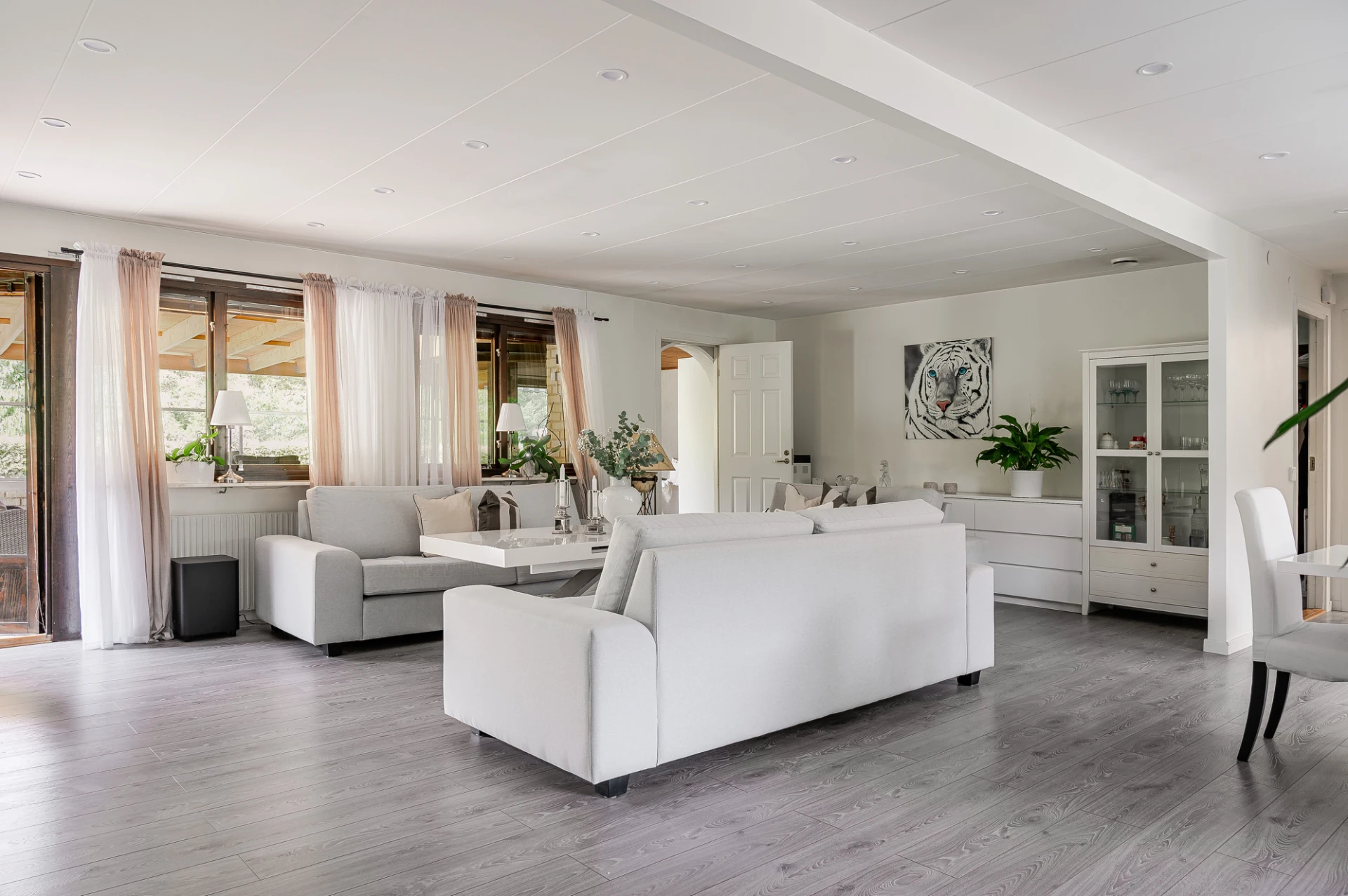 Vardagsrummet är luftigt och ljust med vitmålade väggar, grå laminatgolv och en fondvägg i stenimitation som ger rummet karaktär. Härifrån når du den stora takade altanen, en perfekt plats för umgänge året runt.
