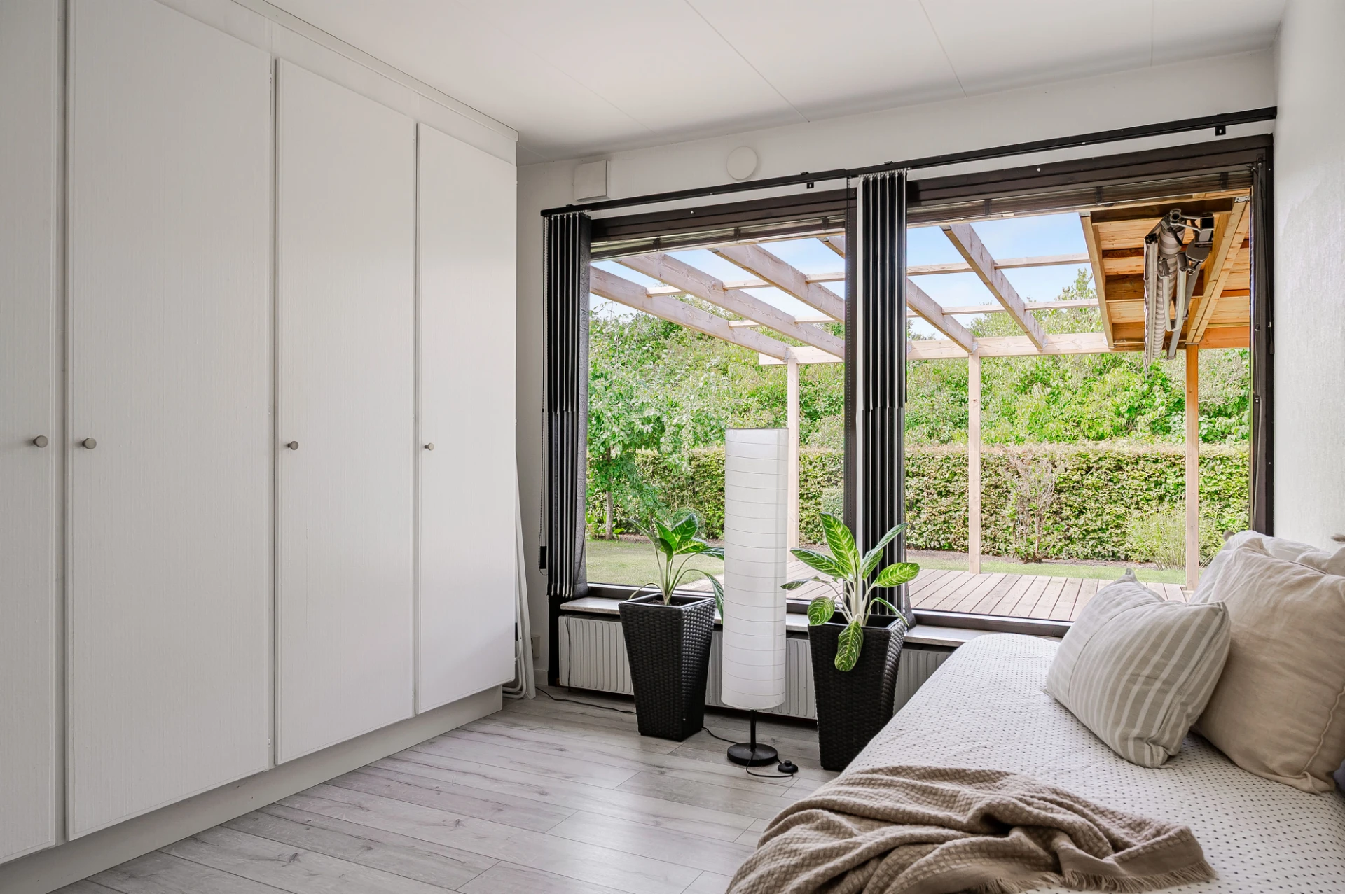 Vita väggar, ljust laminatgolv. Garderober och fönster mot uteplats/trädgård.