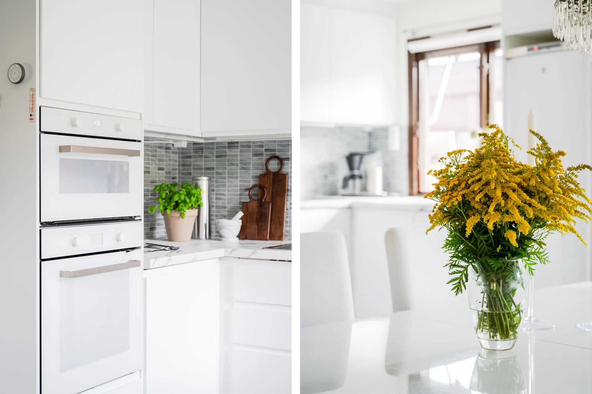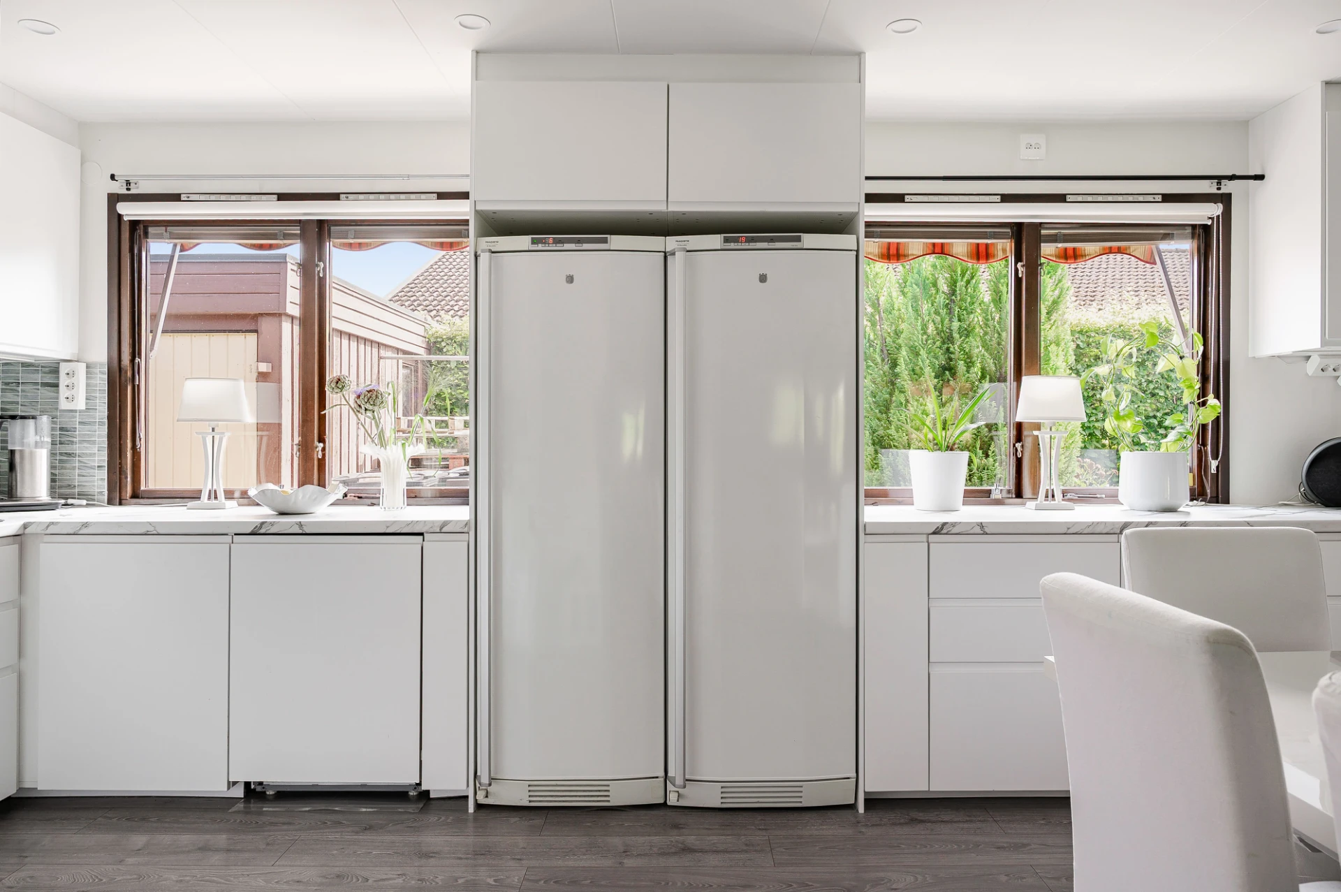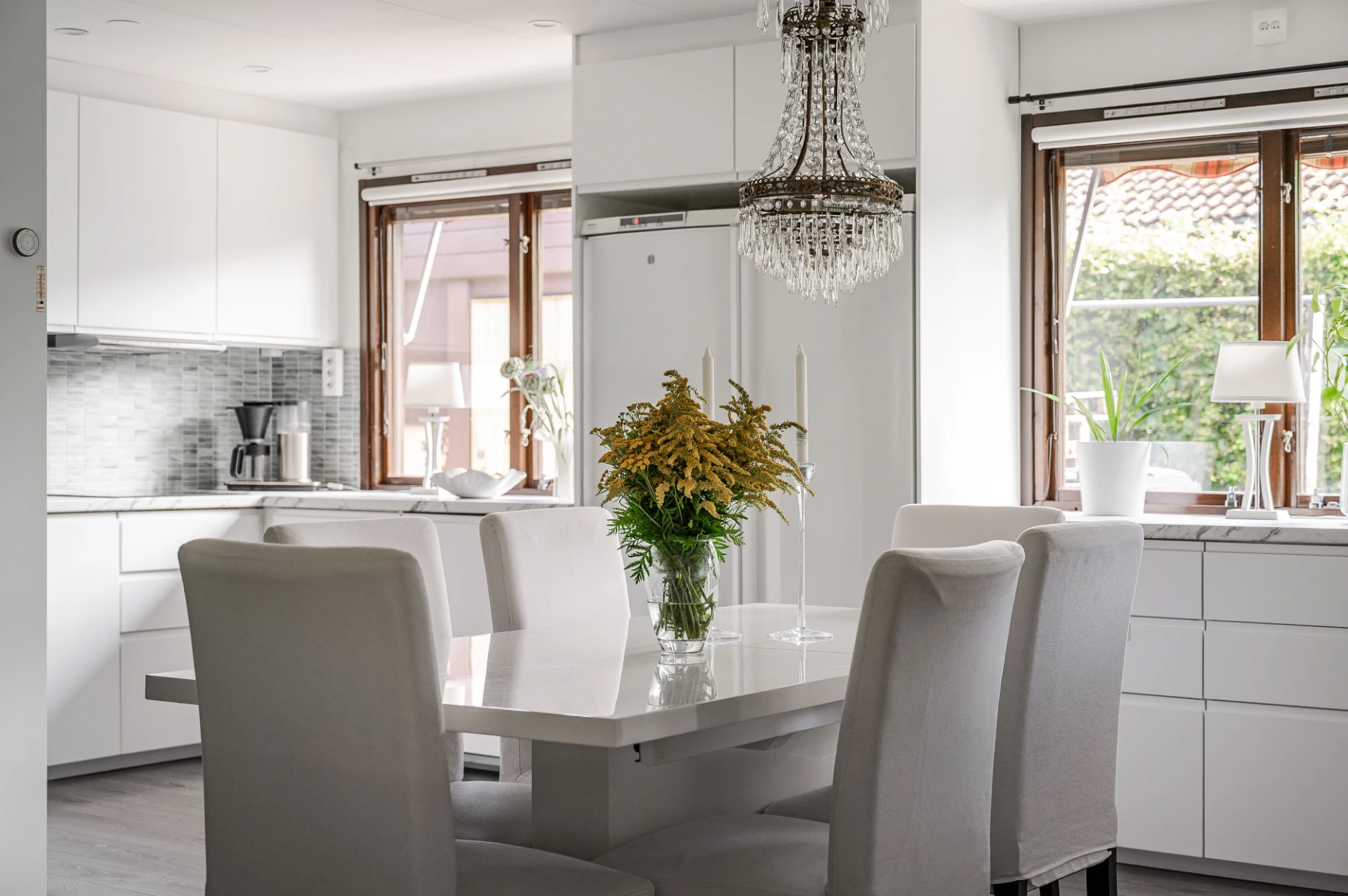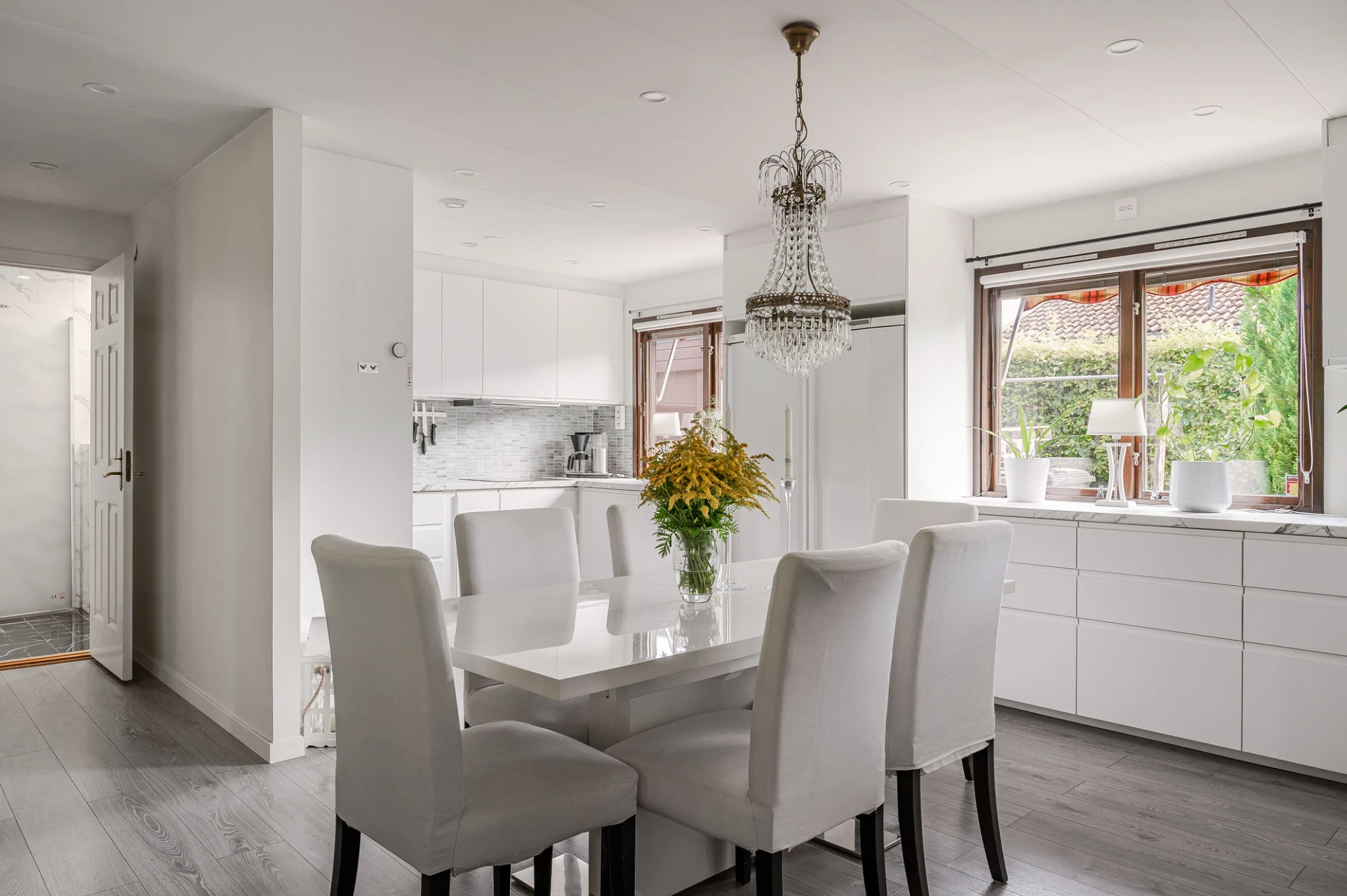Det moderna köket är inrett med vita släta luckor, ljusa bänkskivor och ett elegant stänkskydd i mosaik. Här finns full maskinpark med spishäll, inbyggd ugn och mikro, integrerad diskmaskin samt separat kyl och frys i fullhöjd. Intill köket ryms en rymlig matplats med plats för det stora sällskapet.