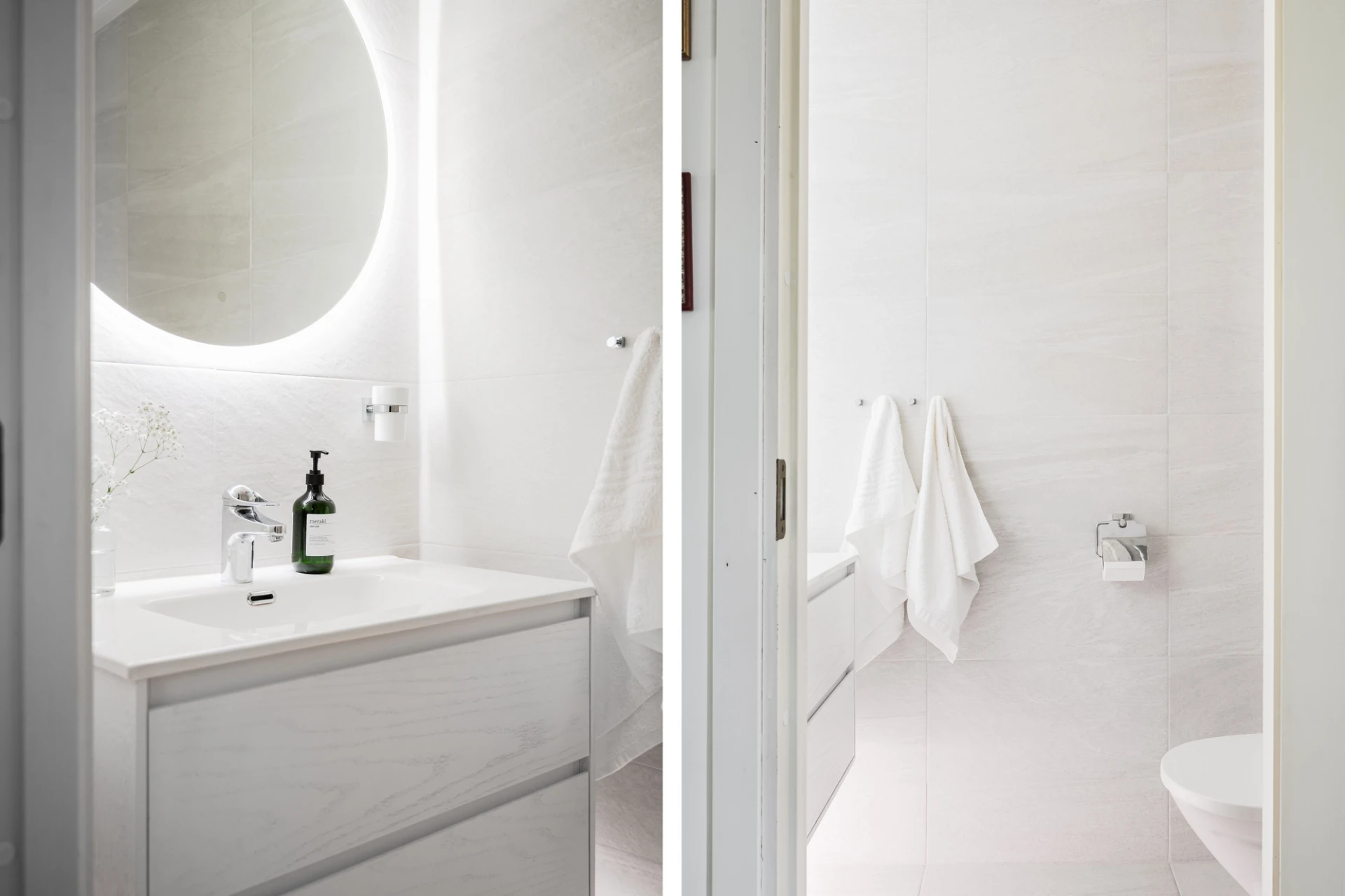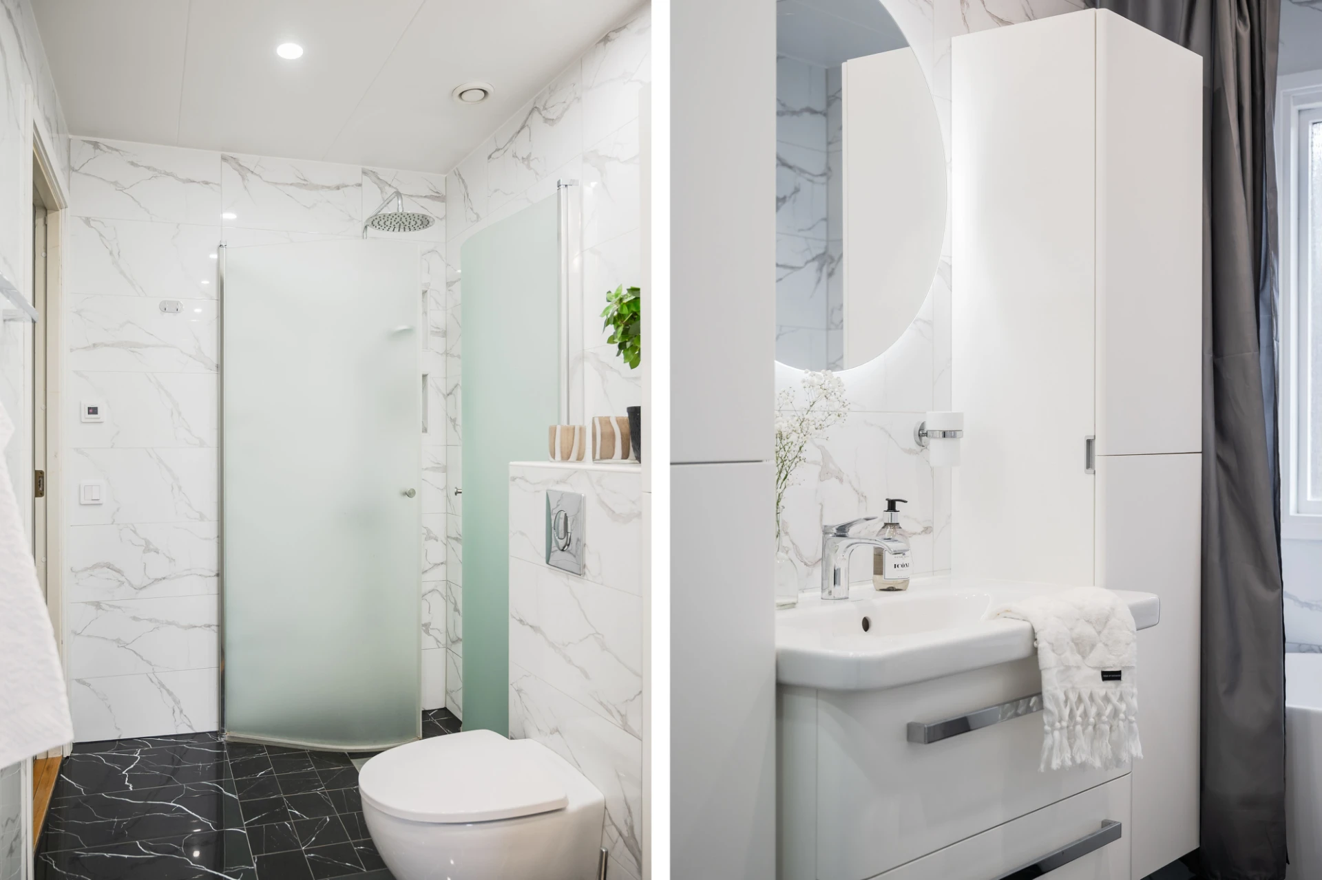 Här finns två fräscha badrum – ett helkaklat i vit marmorimitation med svart klinkergolv, kommod, dusch, vägghängd wc och fristående badkar. Det andra är ljust helkaklat med klinkergolv, kommod, vägghängd wc och dusch. Dessutom finns en separat gäst-WC vid entrén.