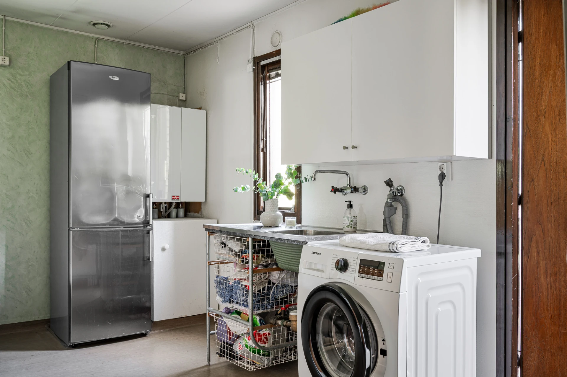 Tvättstugan är praktiskt planerad med tvättmaskin, torkskåp, bänk med tvättho och skåpsförvaring.
