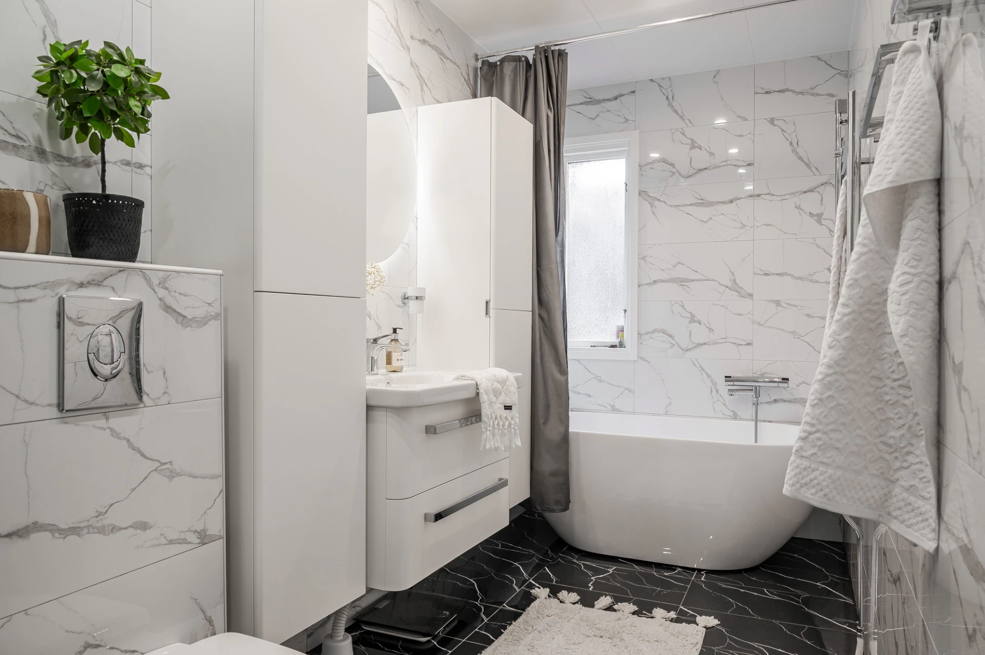 Helkaklat i vit marmorimitation, svart klinkergolv. Kommod, högskåp, vägghängd wc, dusch och fristående badkar.