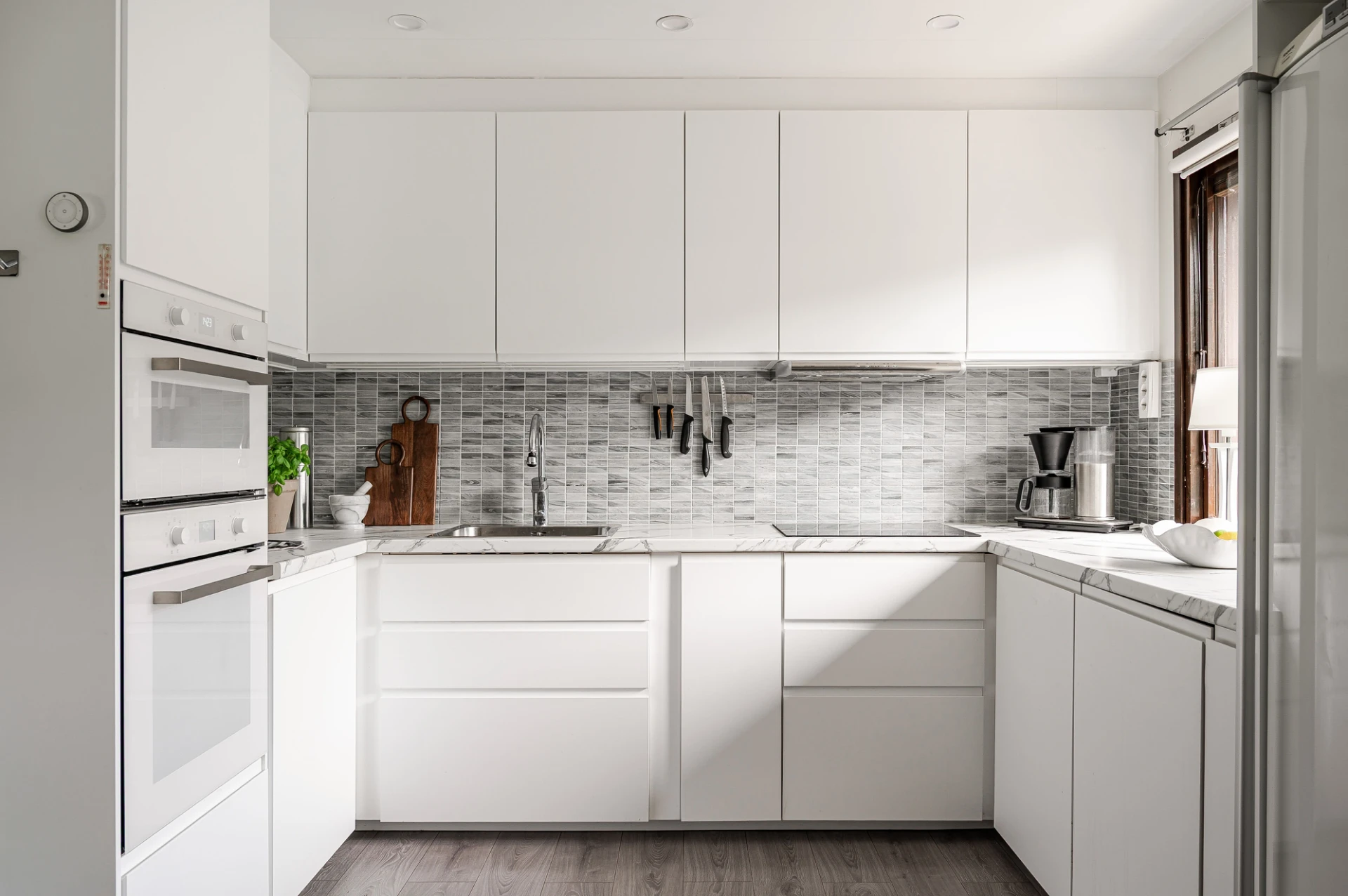 Vita släta luckor, ljusa bänkskivor, stänkskydd i grå mosaik. Förvaring i över-/underskåp och högskåp. Maskinpark: spishäll, inbyggd ugn och mikro, integrerad diskmaskin, separat kyl & frys i fullhöjd.