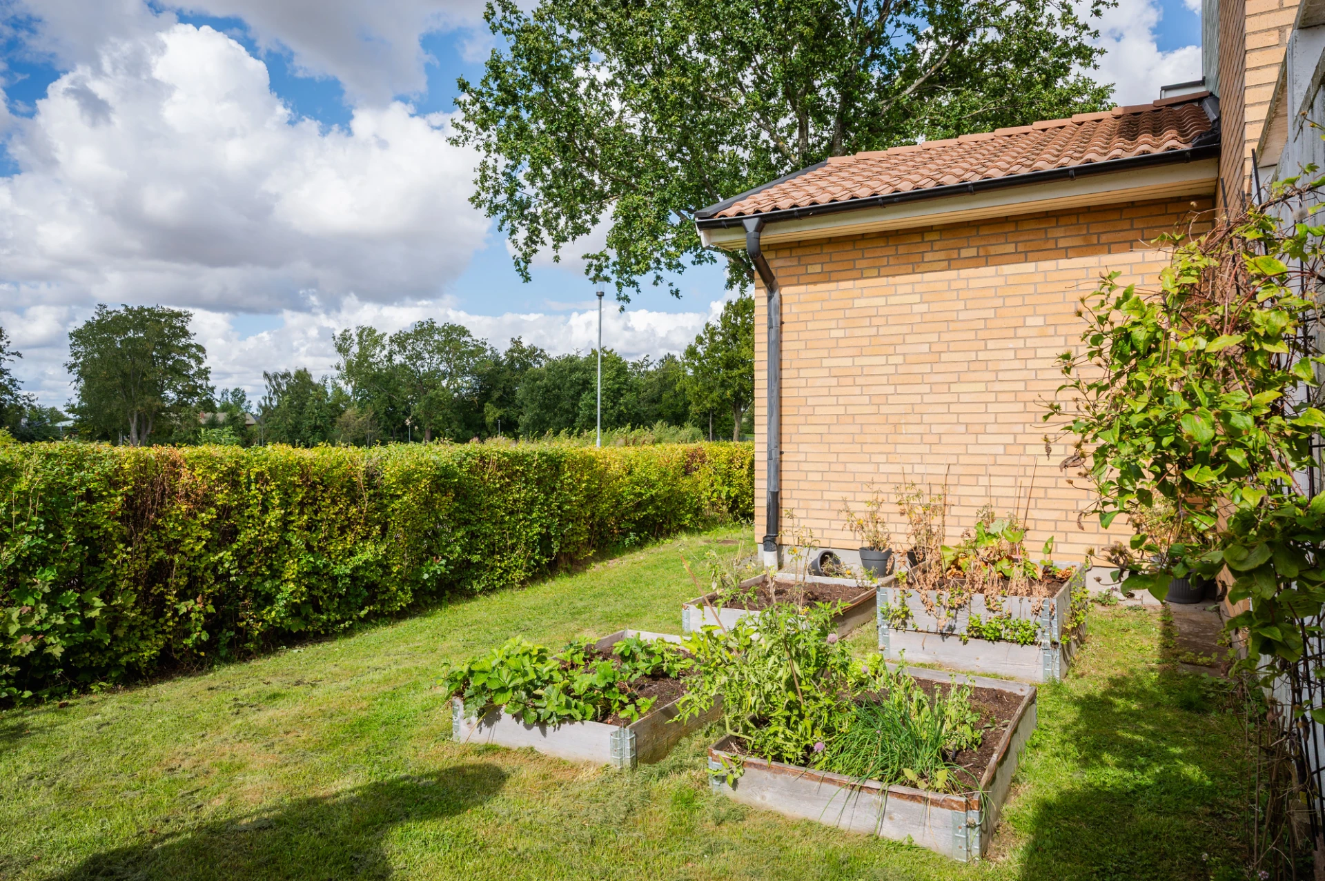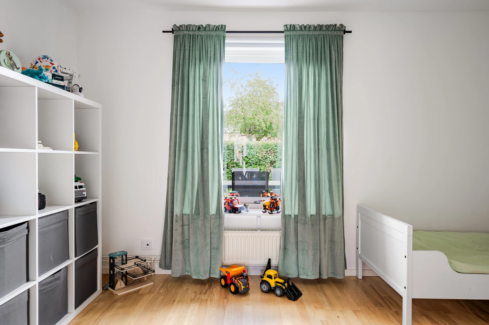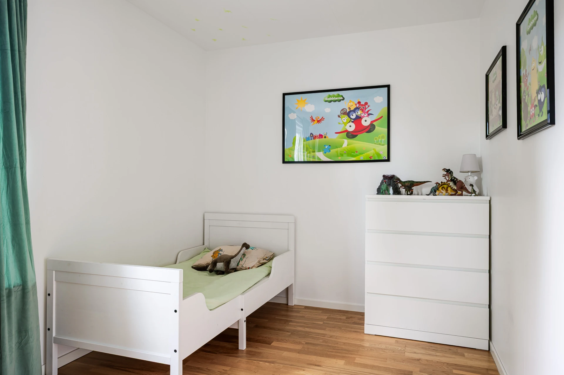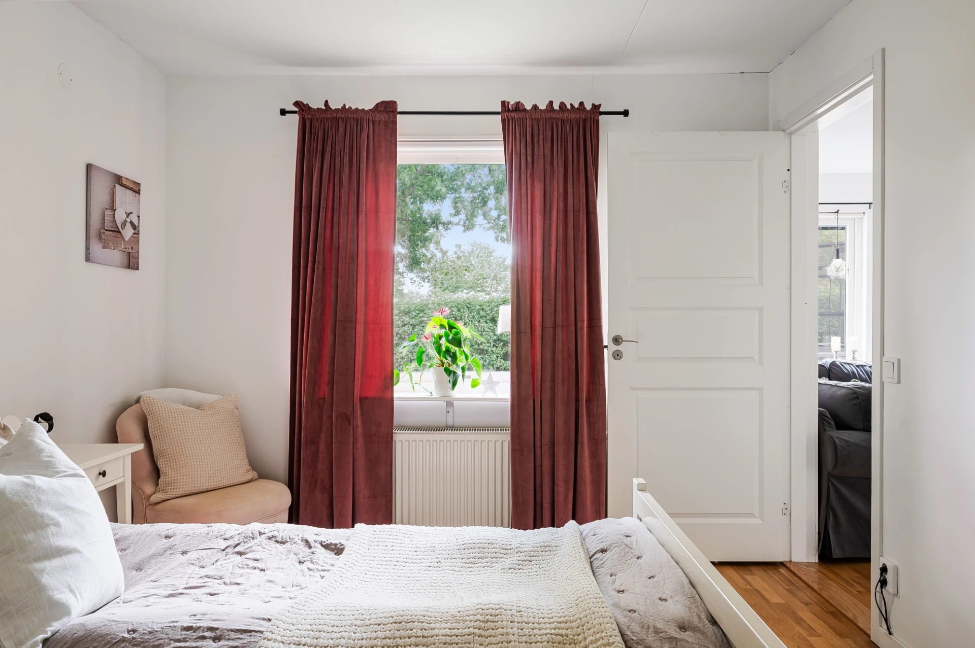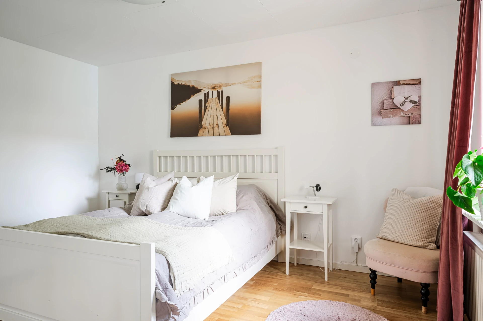 Vita slätmålade väggar. Parkettgolv. Plats för dubbelsäng. Garderober.