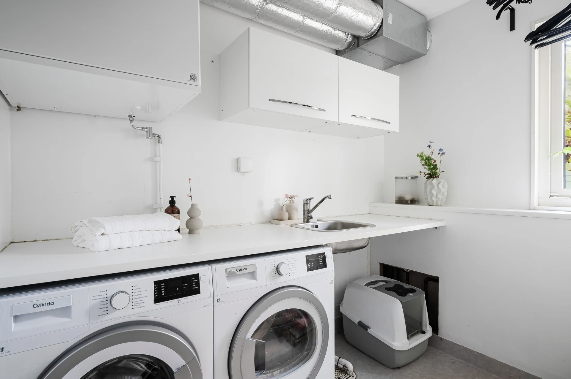 Med torktumlare, tvättmaskin, bänkskiva med vask.