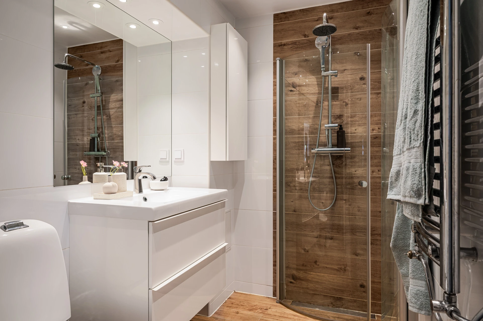 Brunt klinkergolv samt brunt/vitt kakel på väggarna. WC, dusch, handfat, kommod, spegel, handdukstork, förvaringsskåp. Infällda spotlights.