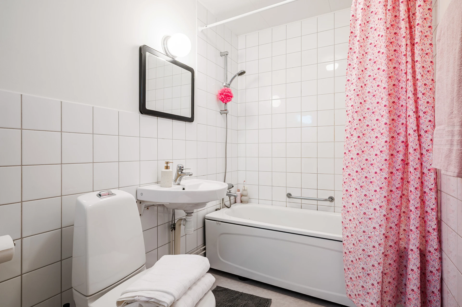 Plastmatta på golvet och vitmålat på väggarna. WC, dusch, handfat, spegel, badkar samt förvaringsskåp.