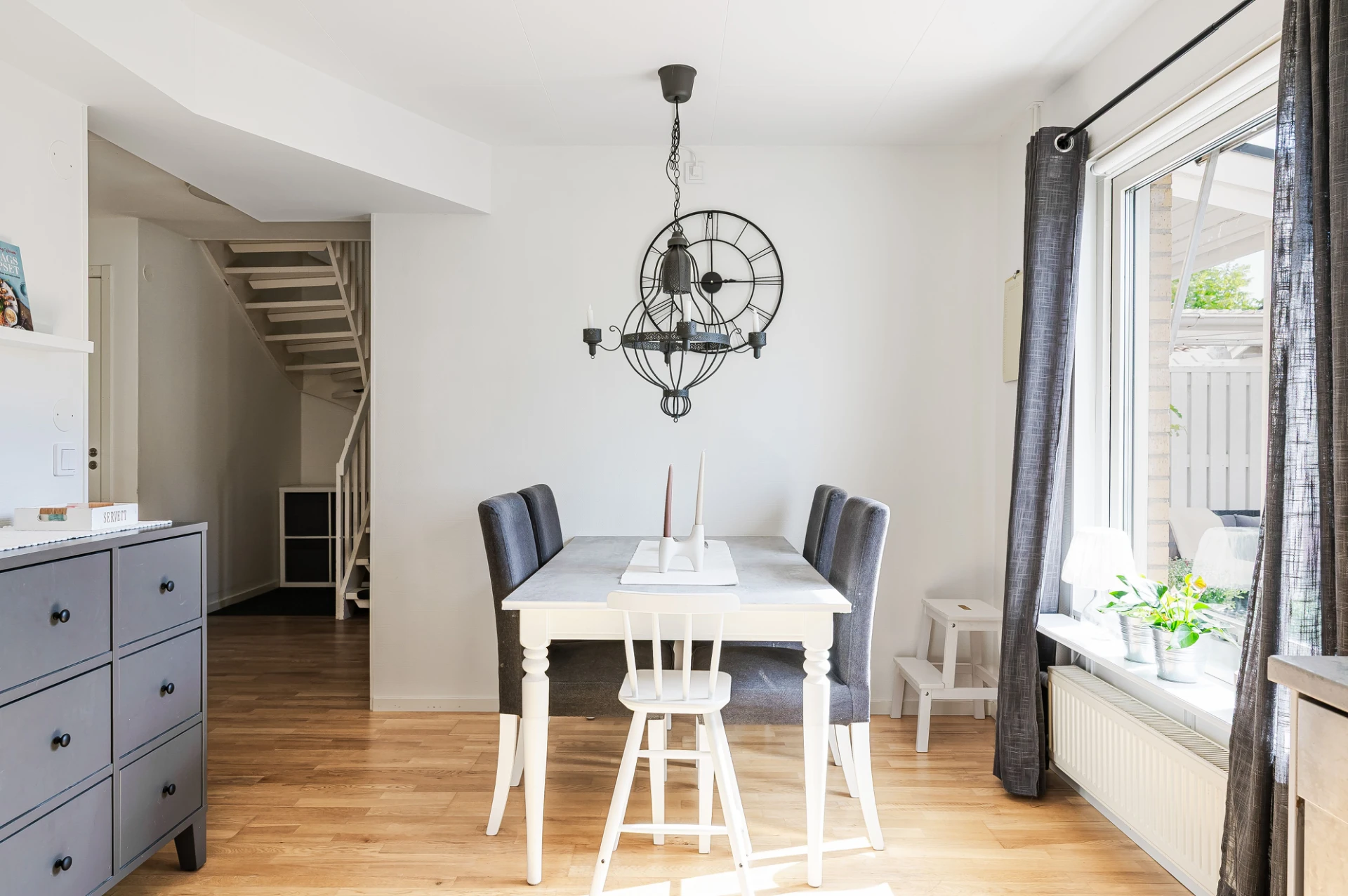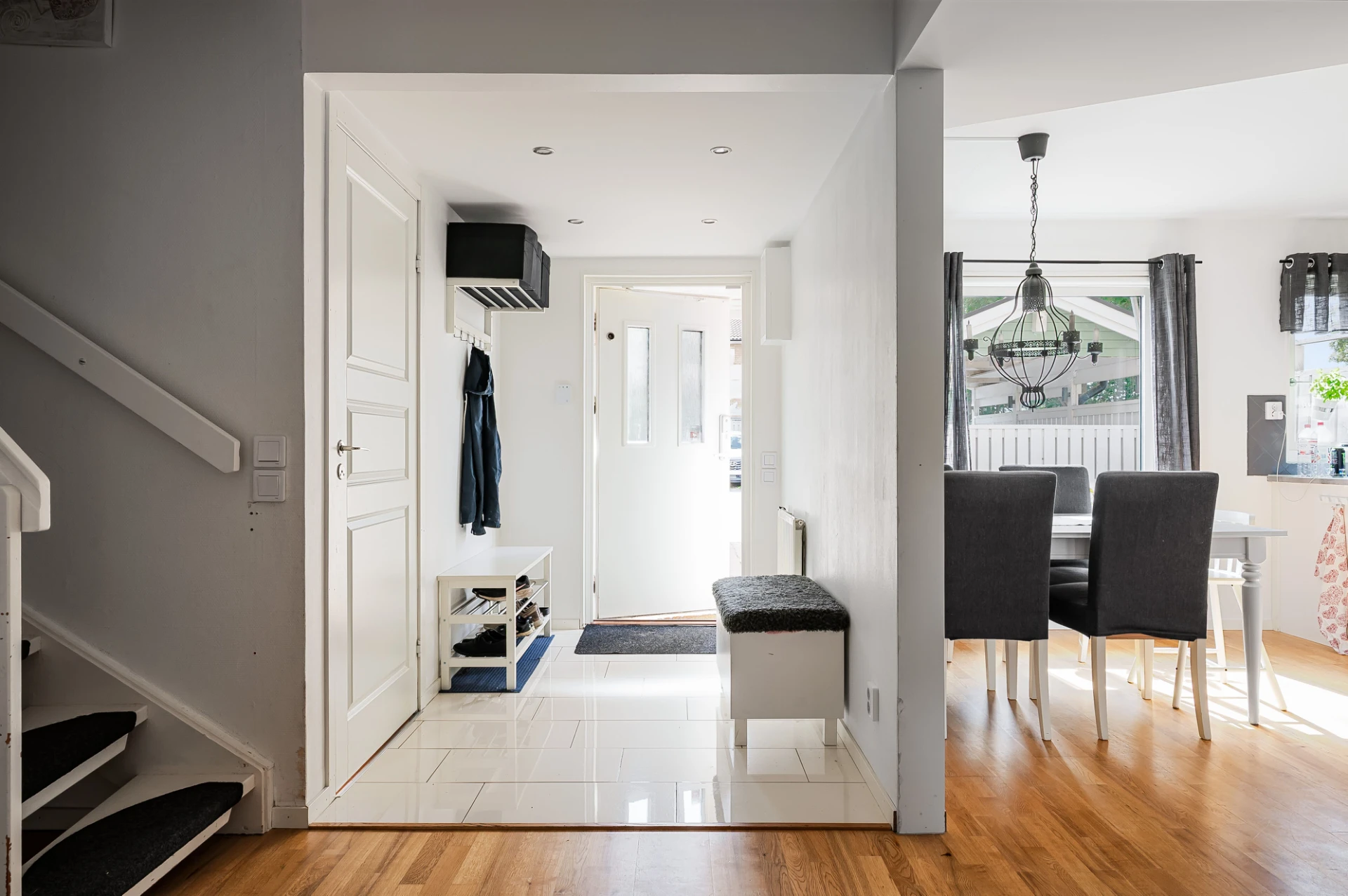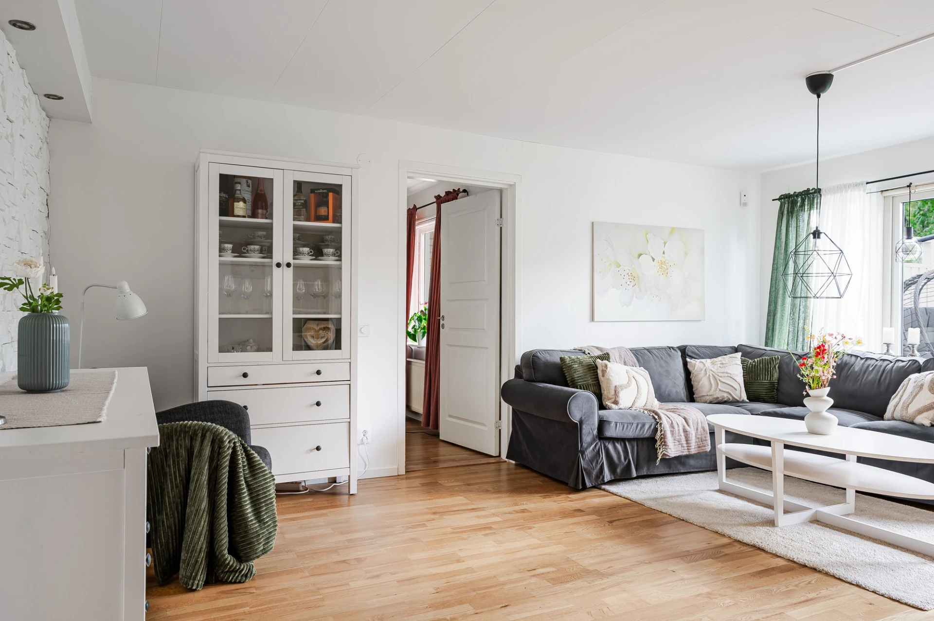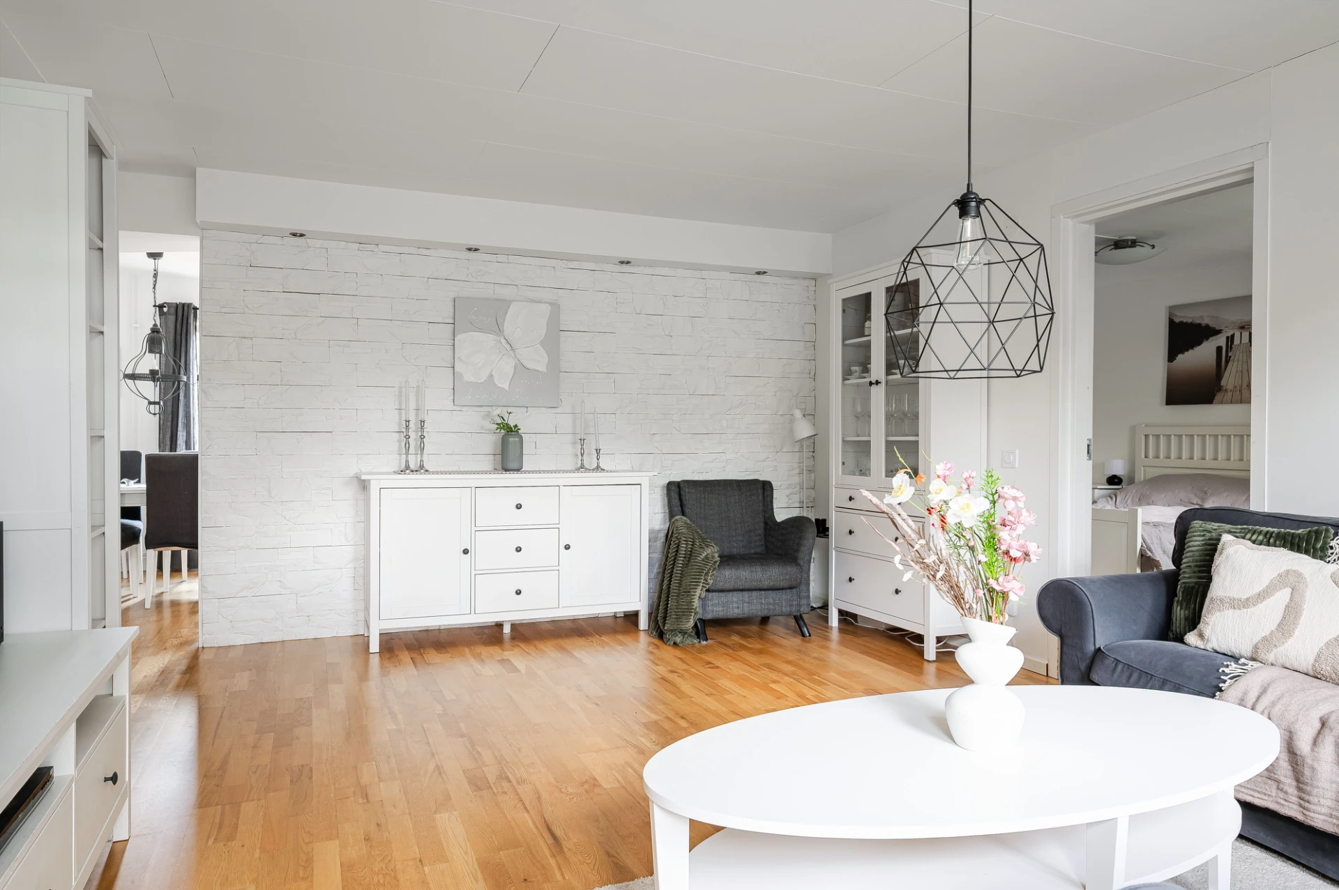 Vita slätmålade väggar. Parkettolv. Dimmer.