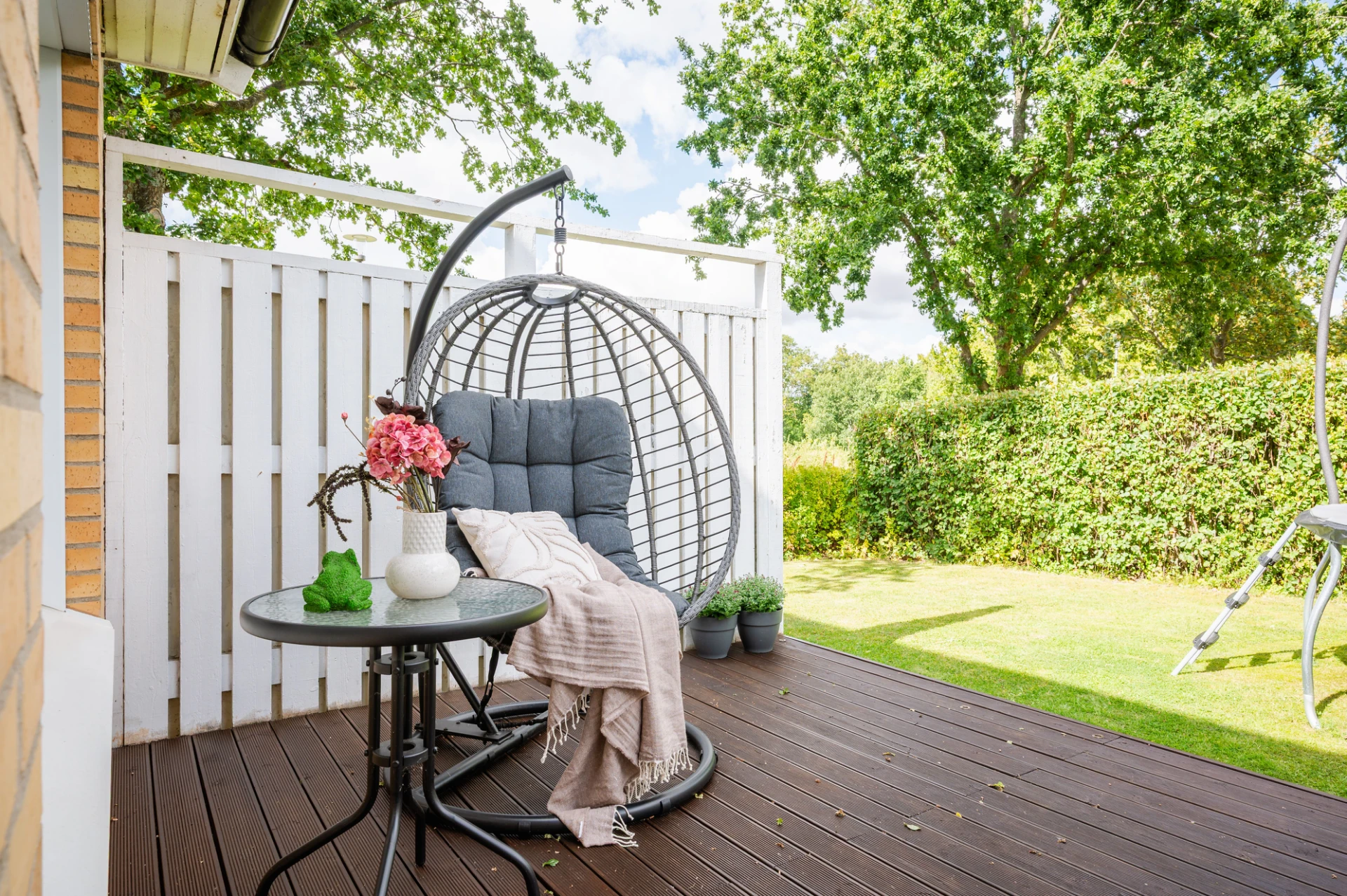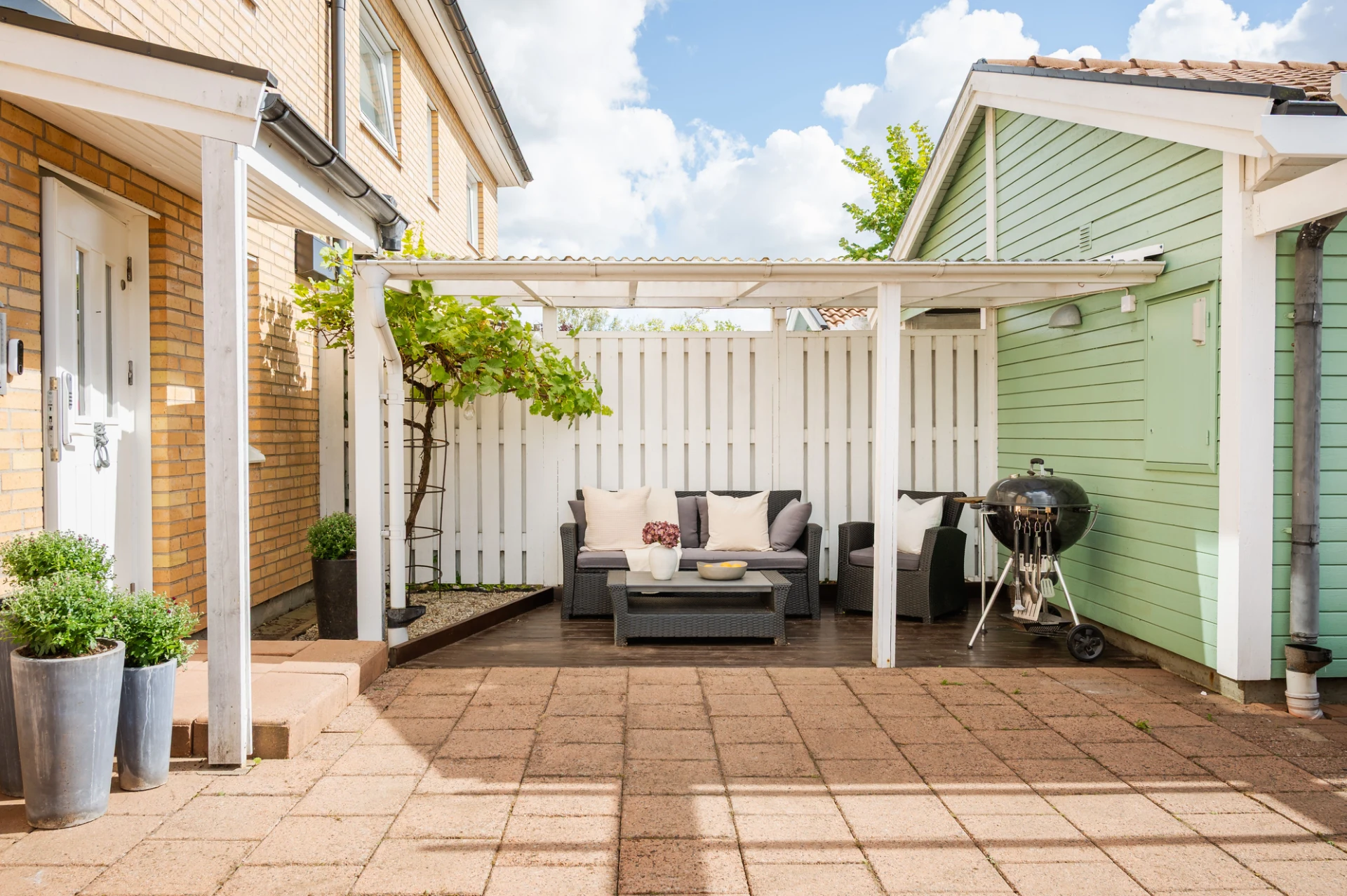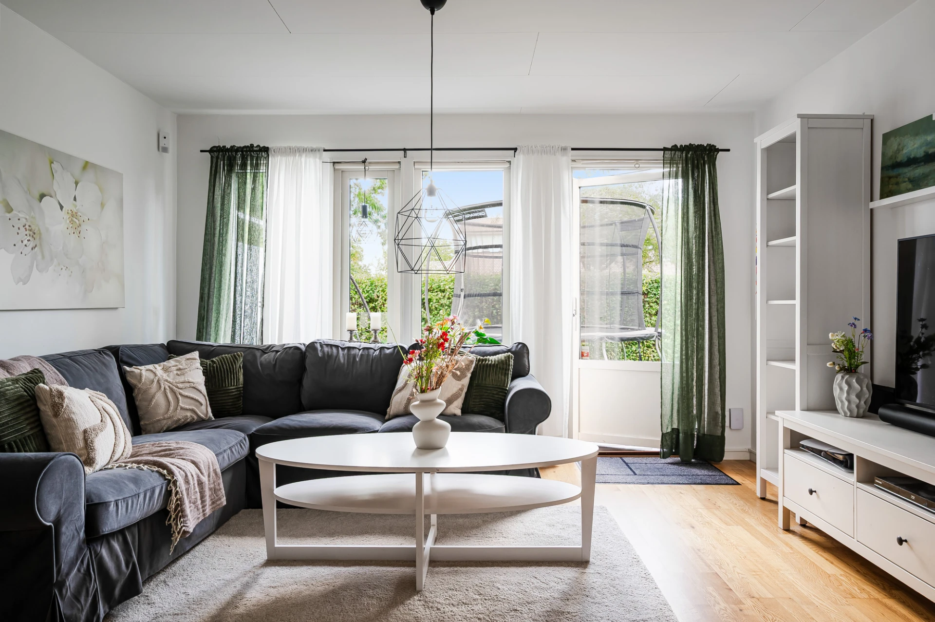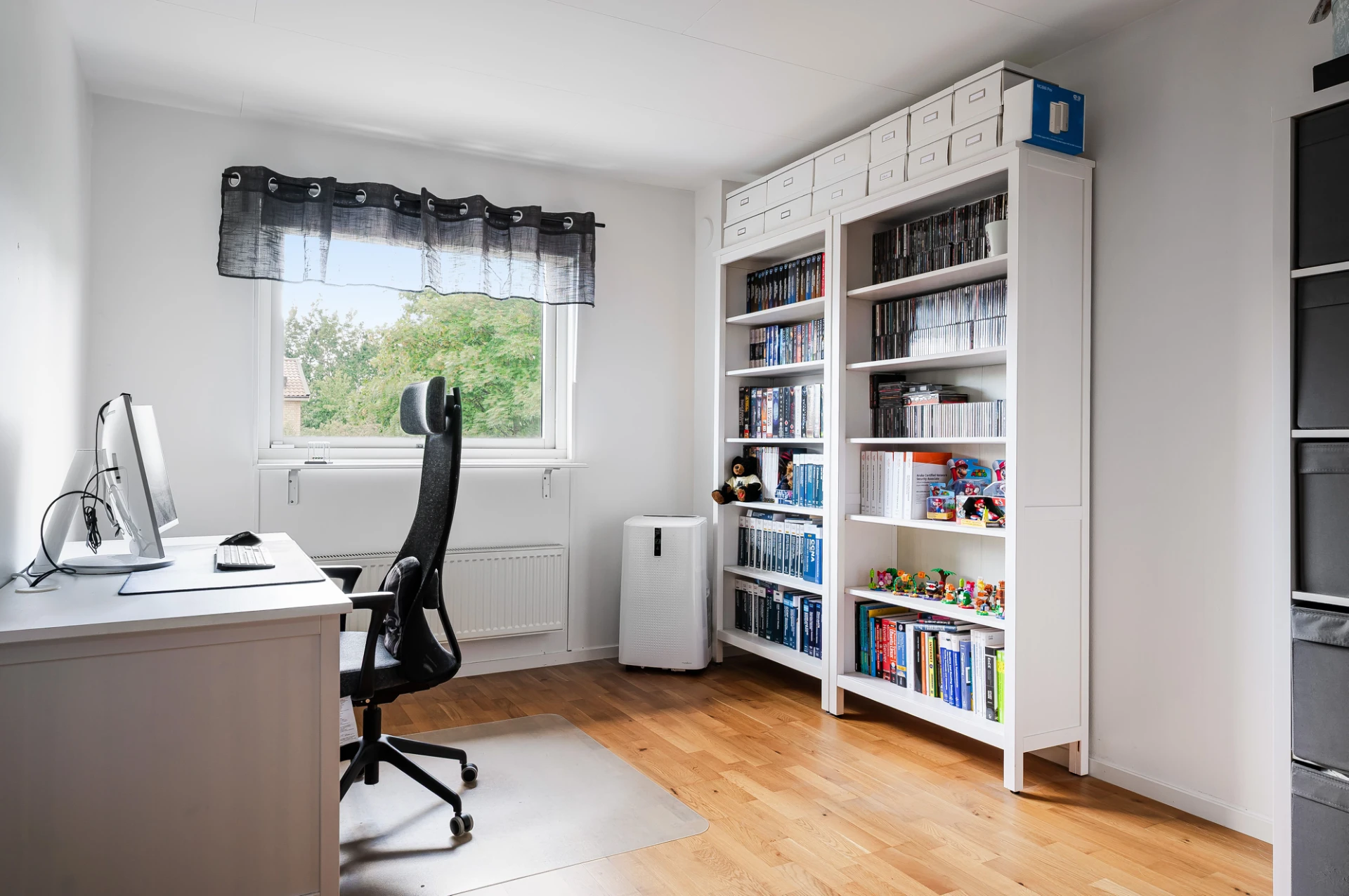Vita slätmålade väggar. Parkettolv. Dimmer.