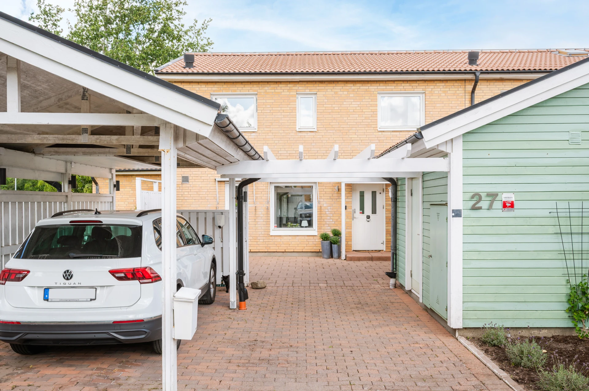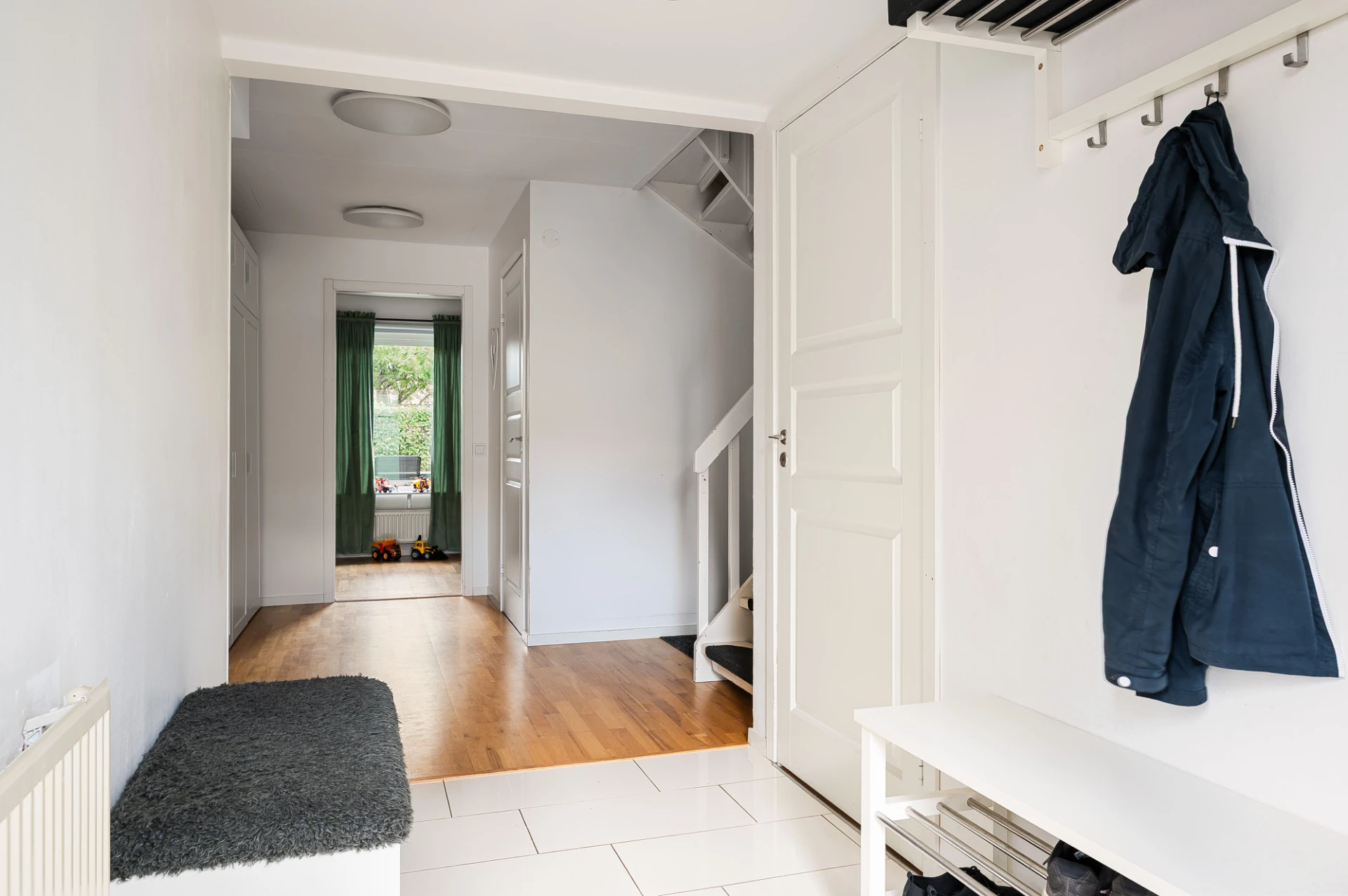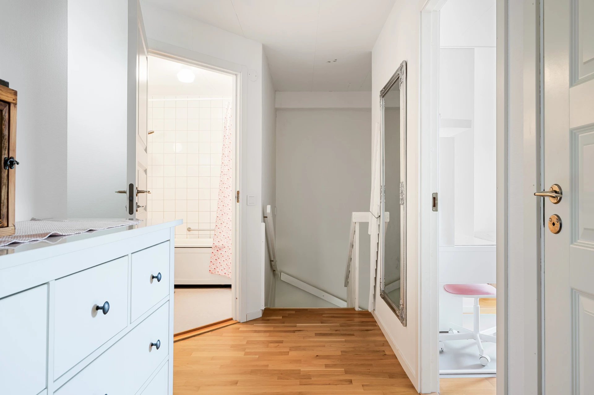 Infällda spotlights. Garderober (3 st). Vita slätmålade väggar. Parkettgolv.