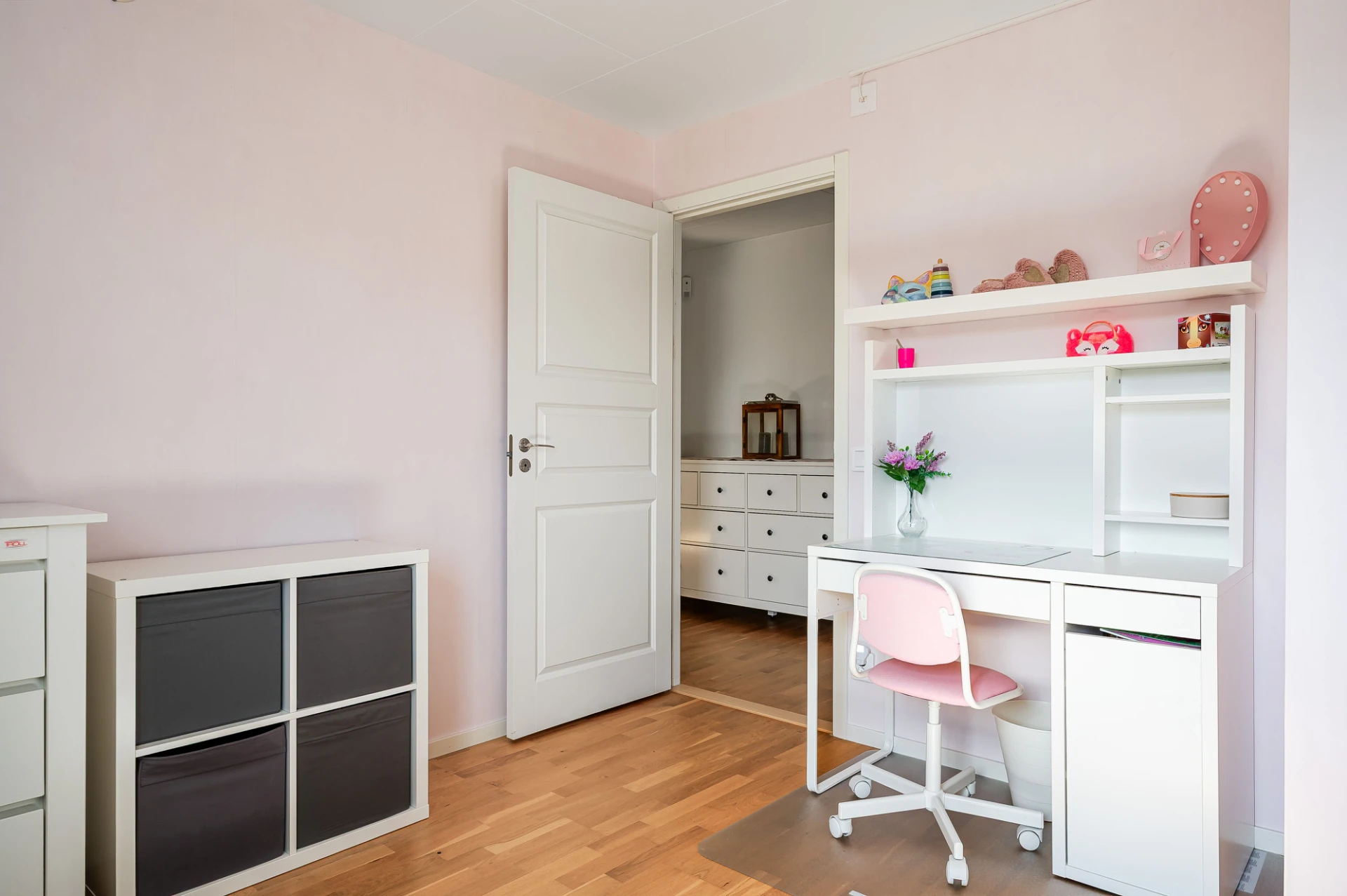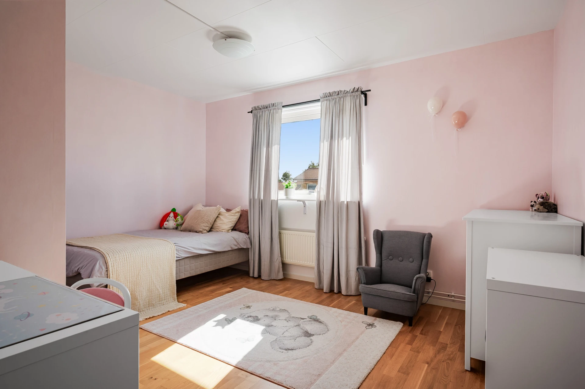 Rosa slätmålade väggar. Parkettolv. Plats för enkelsäng samt annat möblemang.