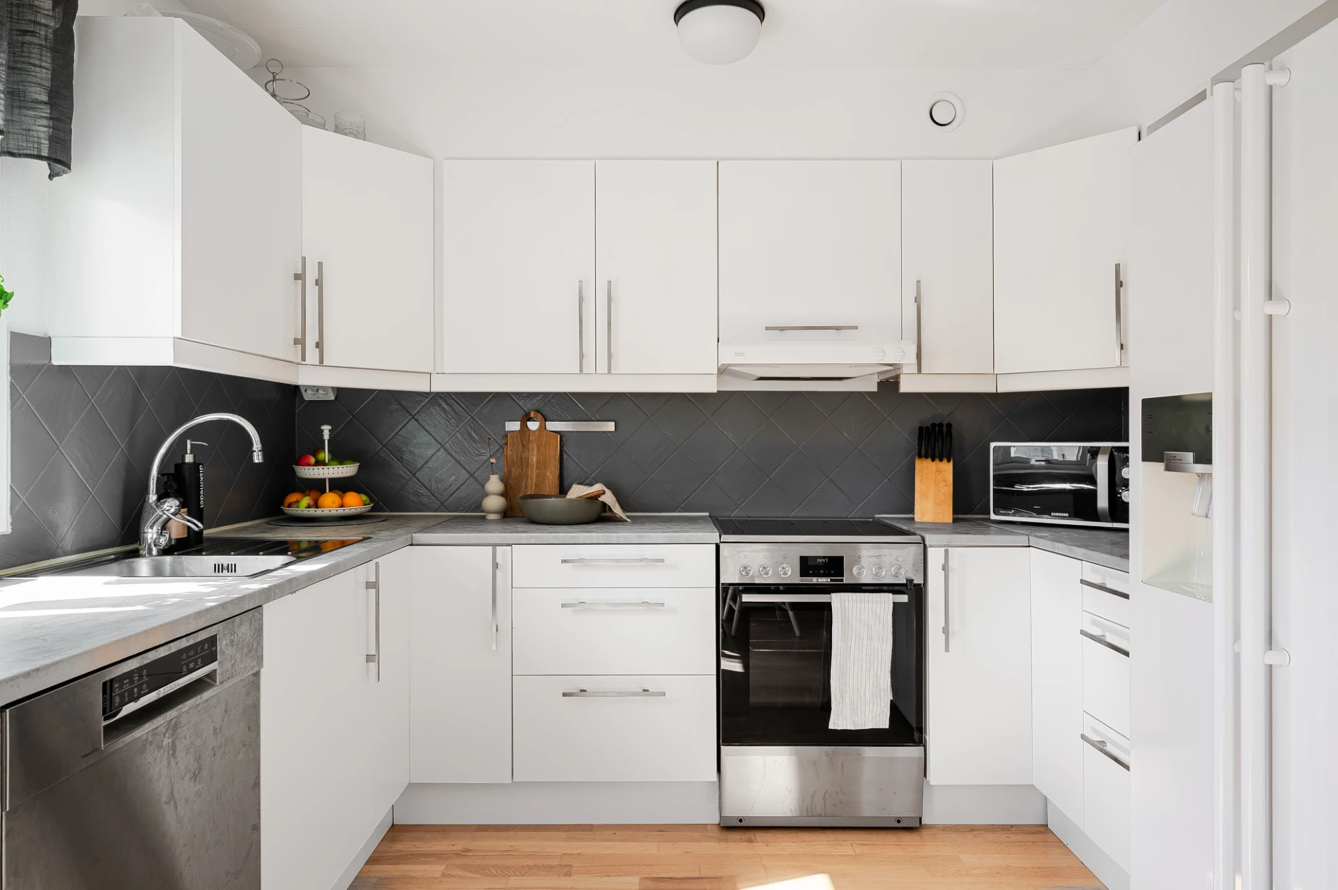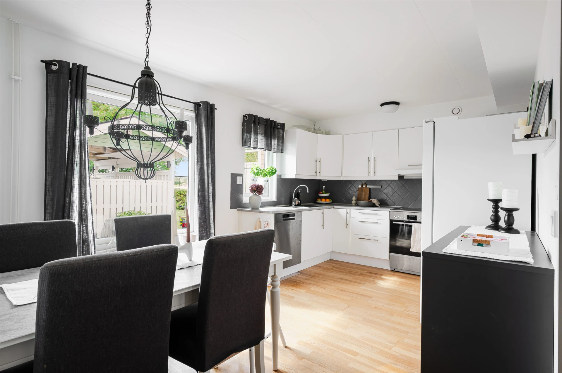 Vitt kök med fullutrustad maskinpark så som kyl/frys, diskmaskin, spis (med ugn) samt fläkt. Parkett Vita slätmålade väggar. Parkettgolv.