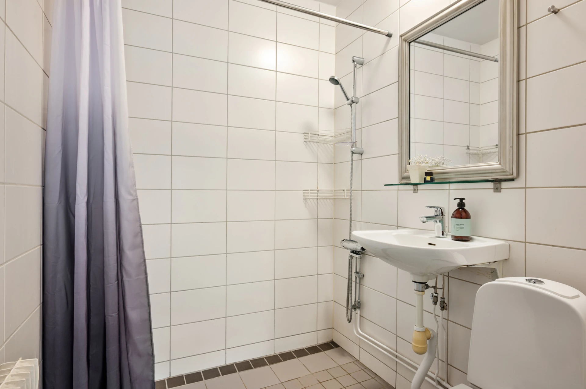 Det helkaklade badrummet har en modern och fräsch känsla med dusch, klinkergolv och stilrena detaljer.