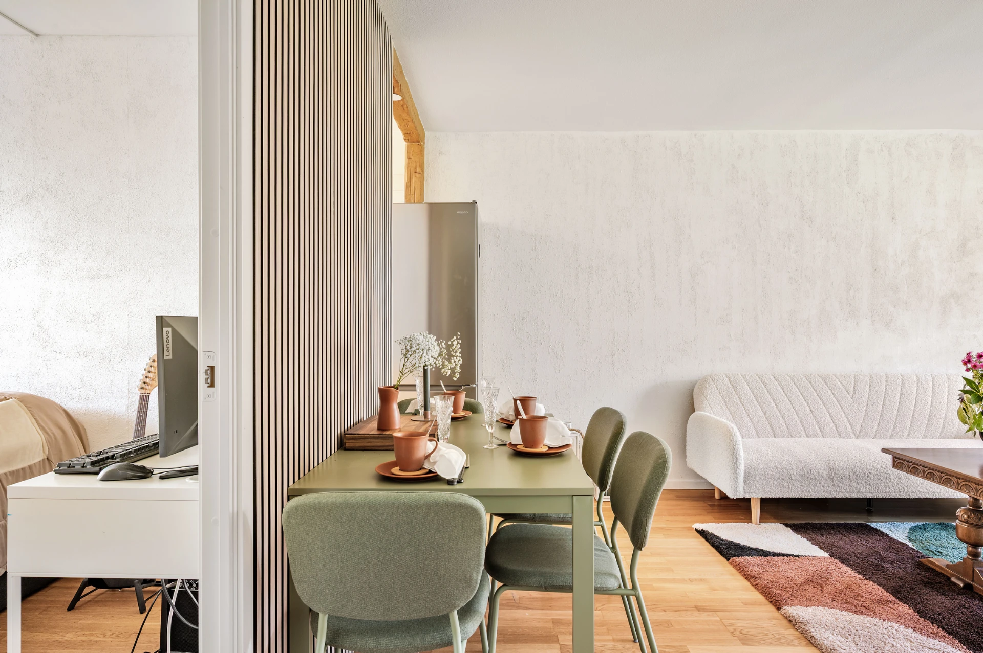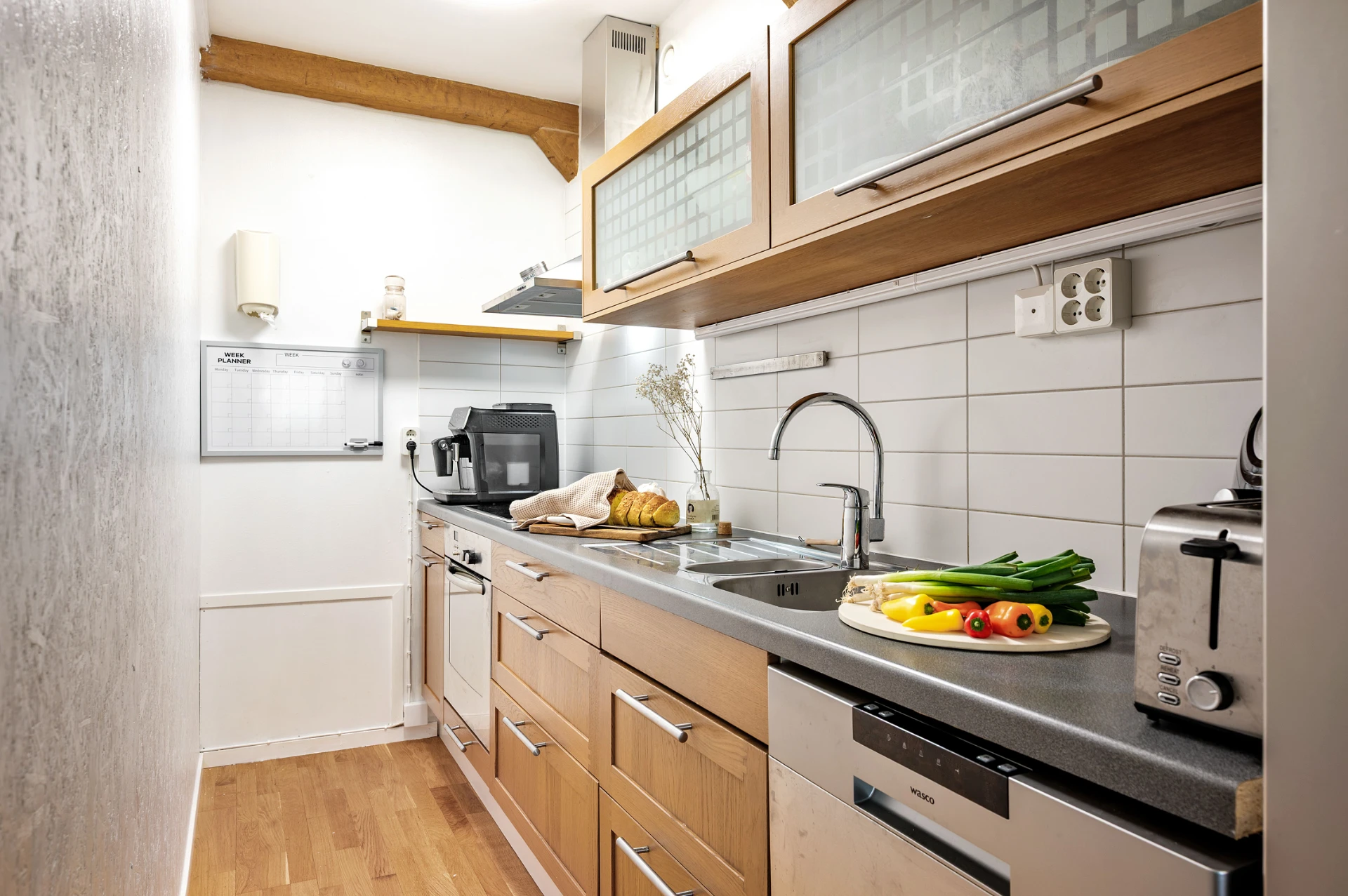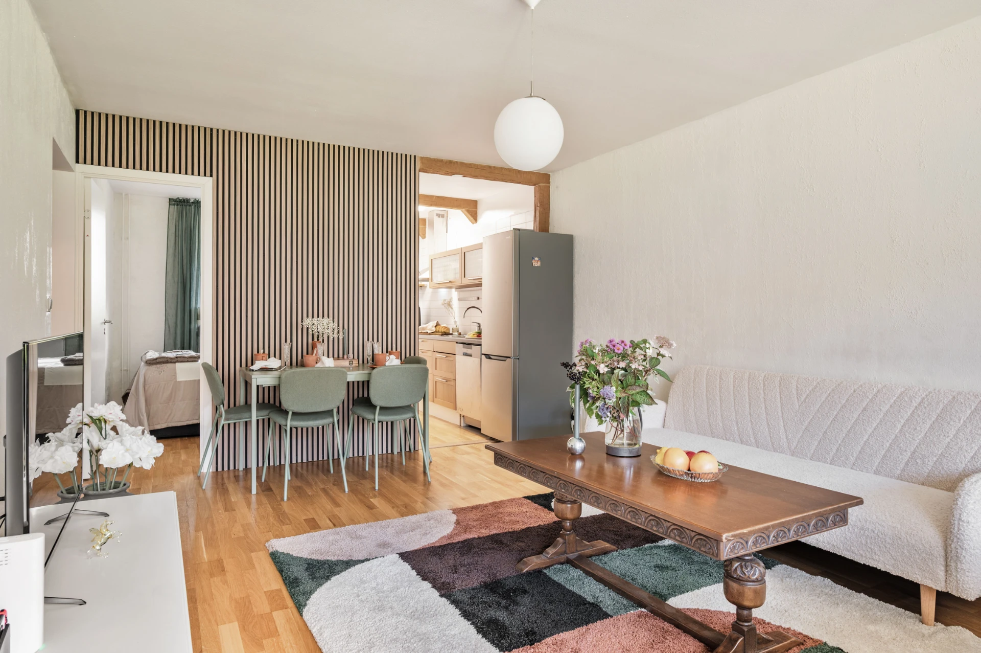 Det stilrena köket erbjuder en generös arbetsbänk, gott om förvaring och moderna vitvaror som gör vardagen enklare. De vackra trägolven tillsammans med synliga takbjälkar ger bostaden en varm och inbjudande karaktär.