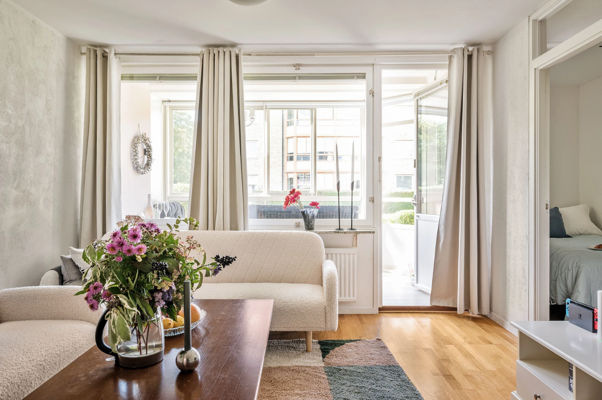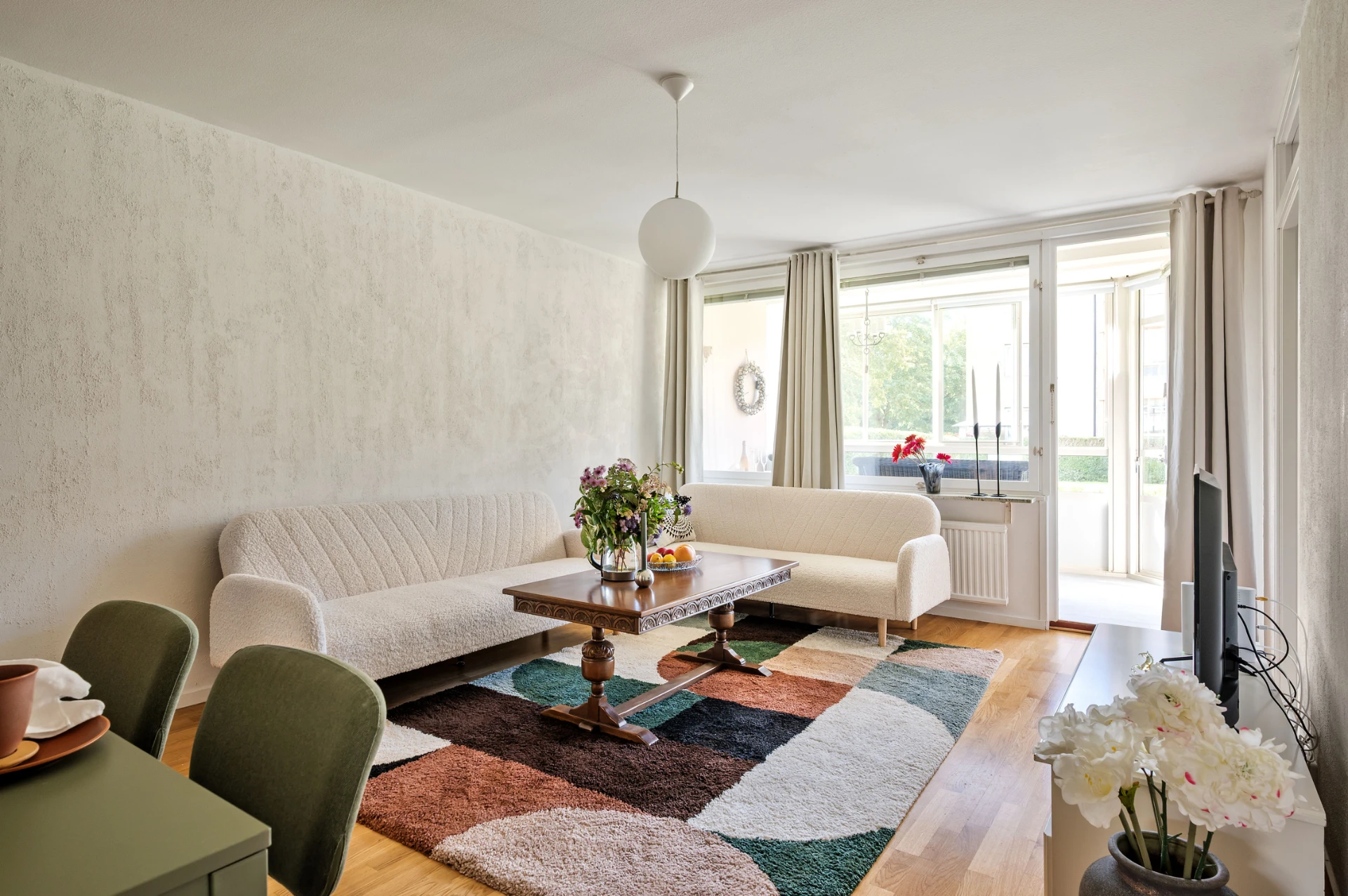 Det rymliga vardagsrummet blir bostadens naturliga samlingspunkt. Här strömmar ljuset in genom stora fönster som vetter mot den inglasade balkongen – en perfekt plats att njuta av året runt.
