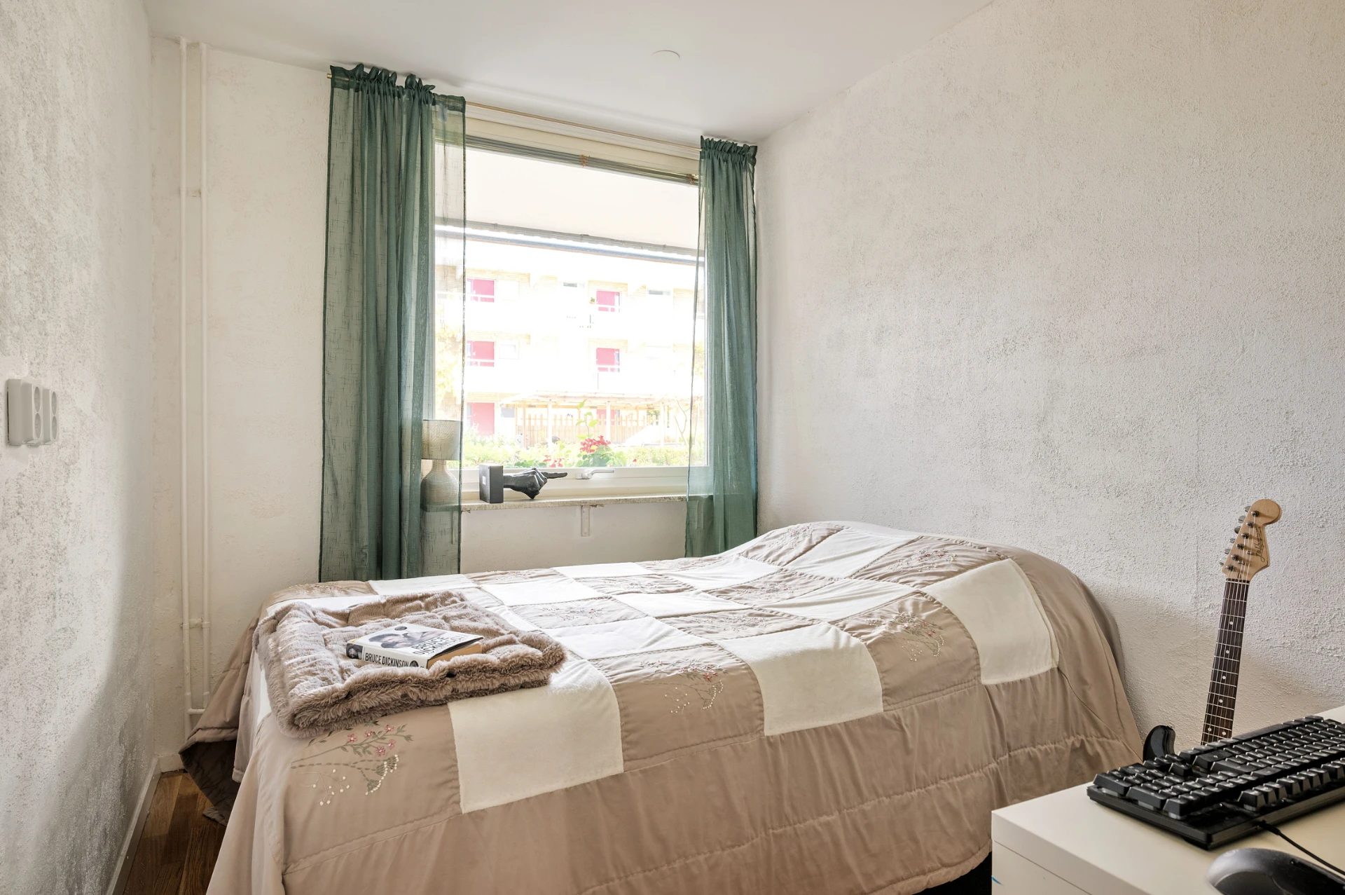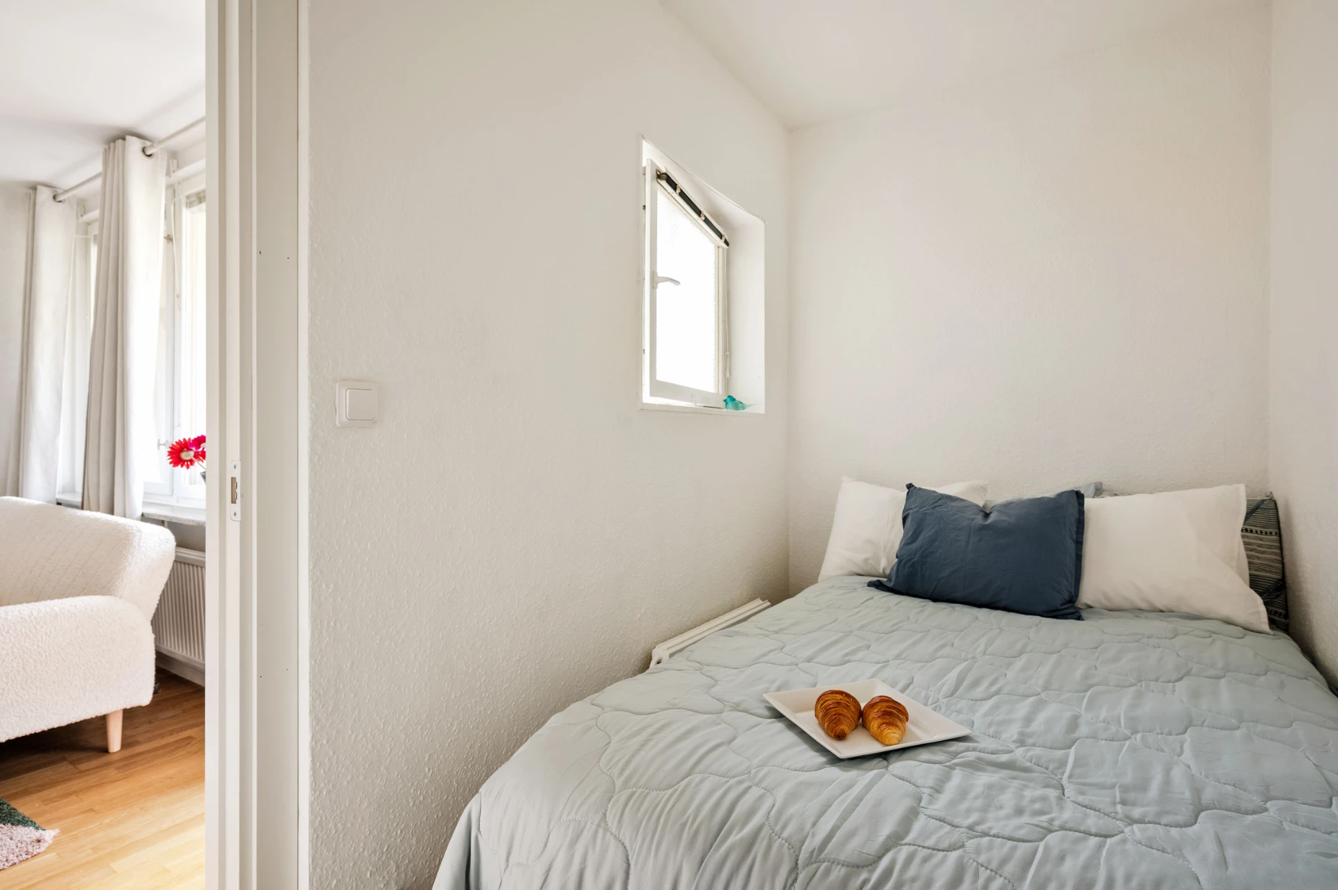 Bostaden rymmer ett ljust sovrum med plats för dubbelsäng samt en praktisk sovalkov som kan användas som extra sovplats, arbetsrum eller förvaring.