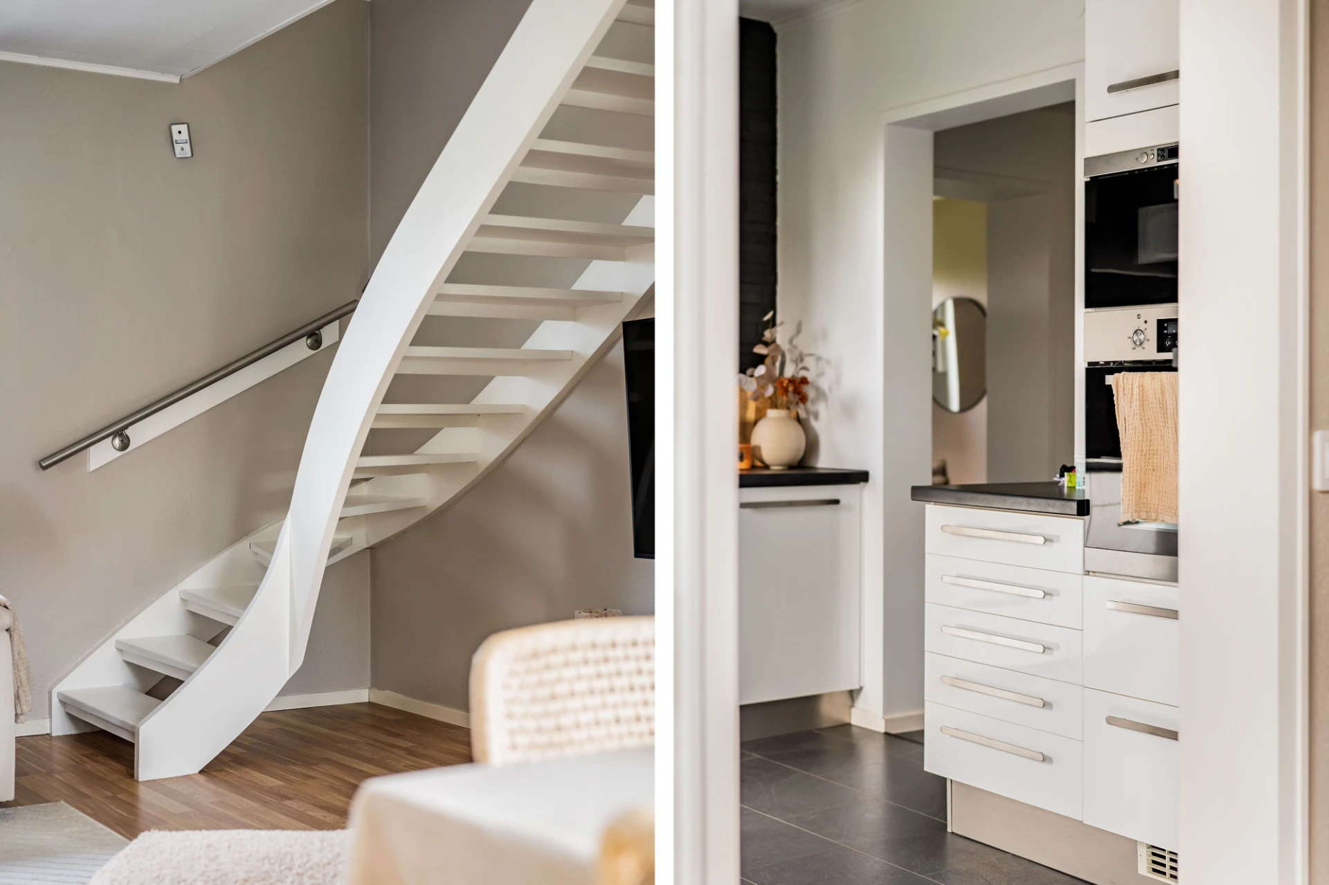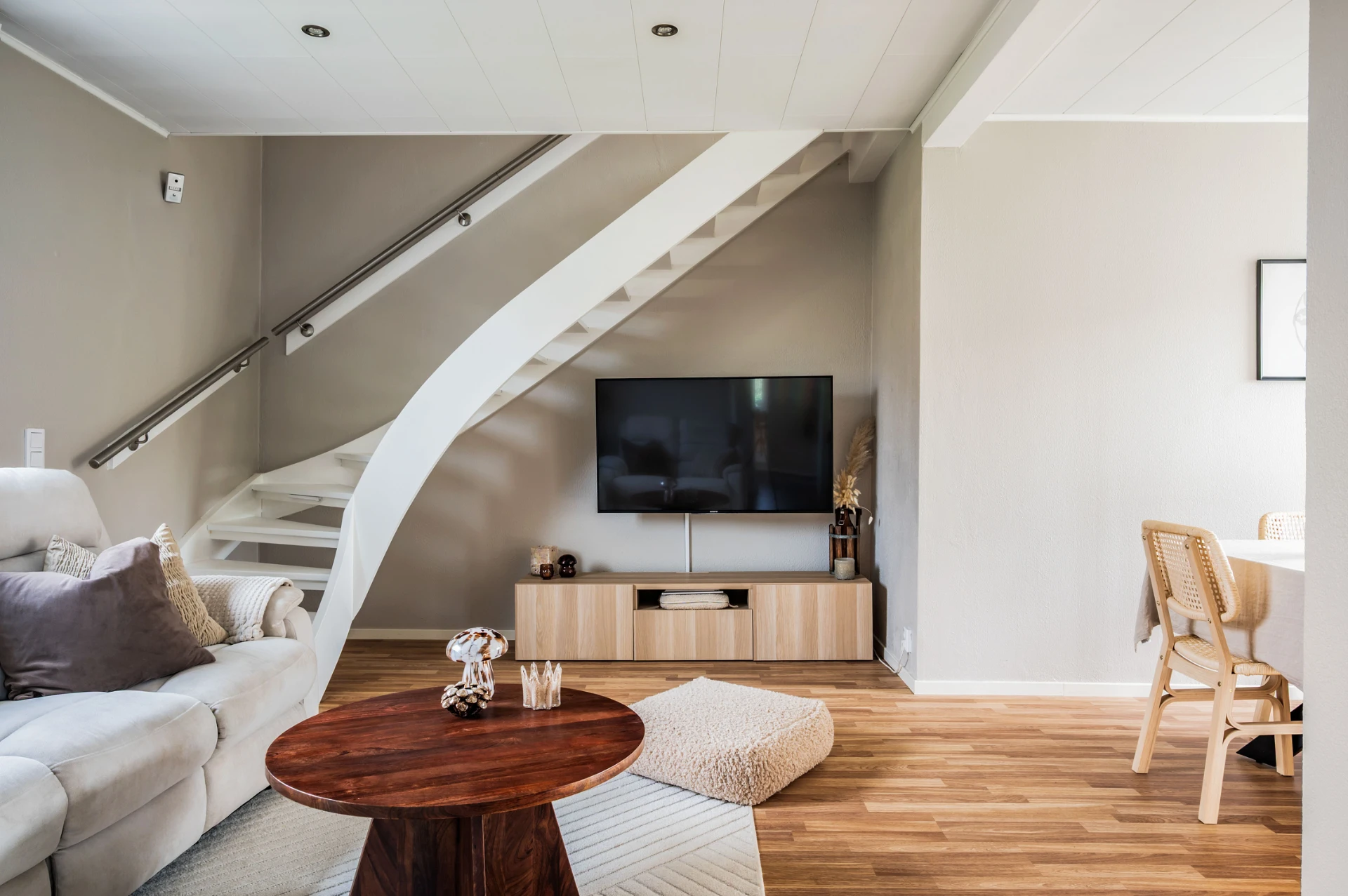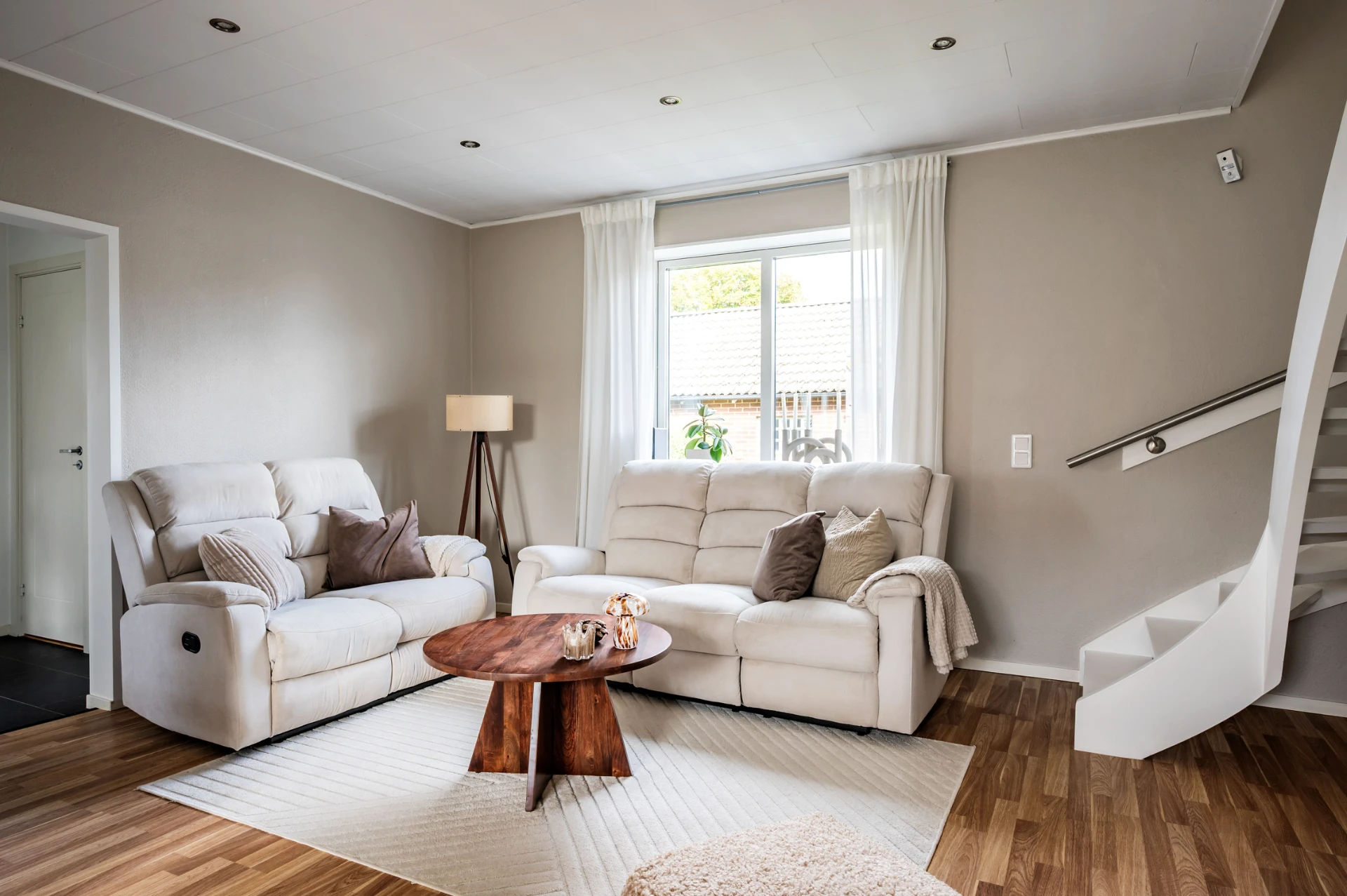 Genomgående rum med fönster på vardera sida, öppen planlösning till matplatsen bredvid köket. Vit trappa. Parkettgolv, beiga väggar och spotlights.