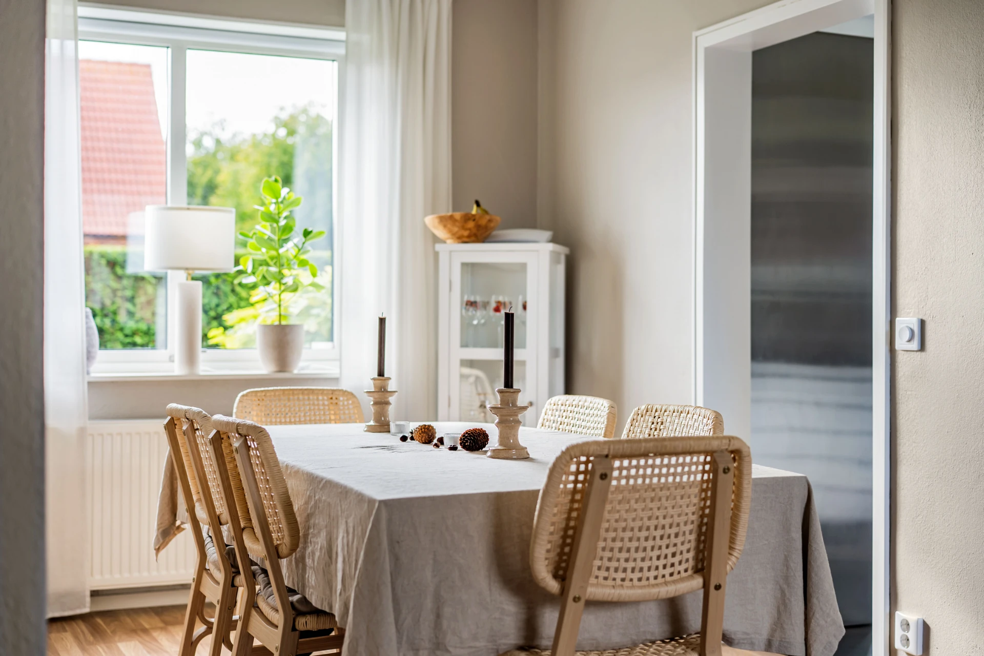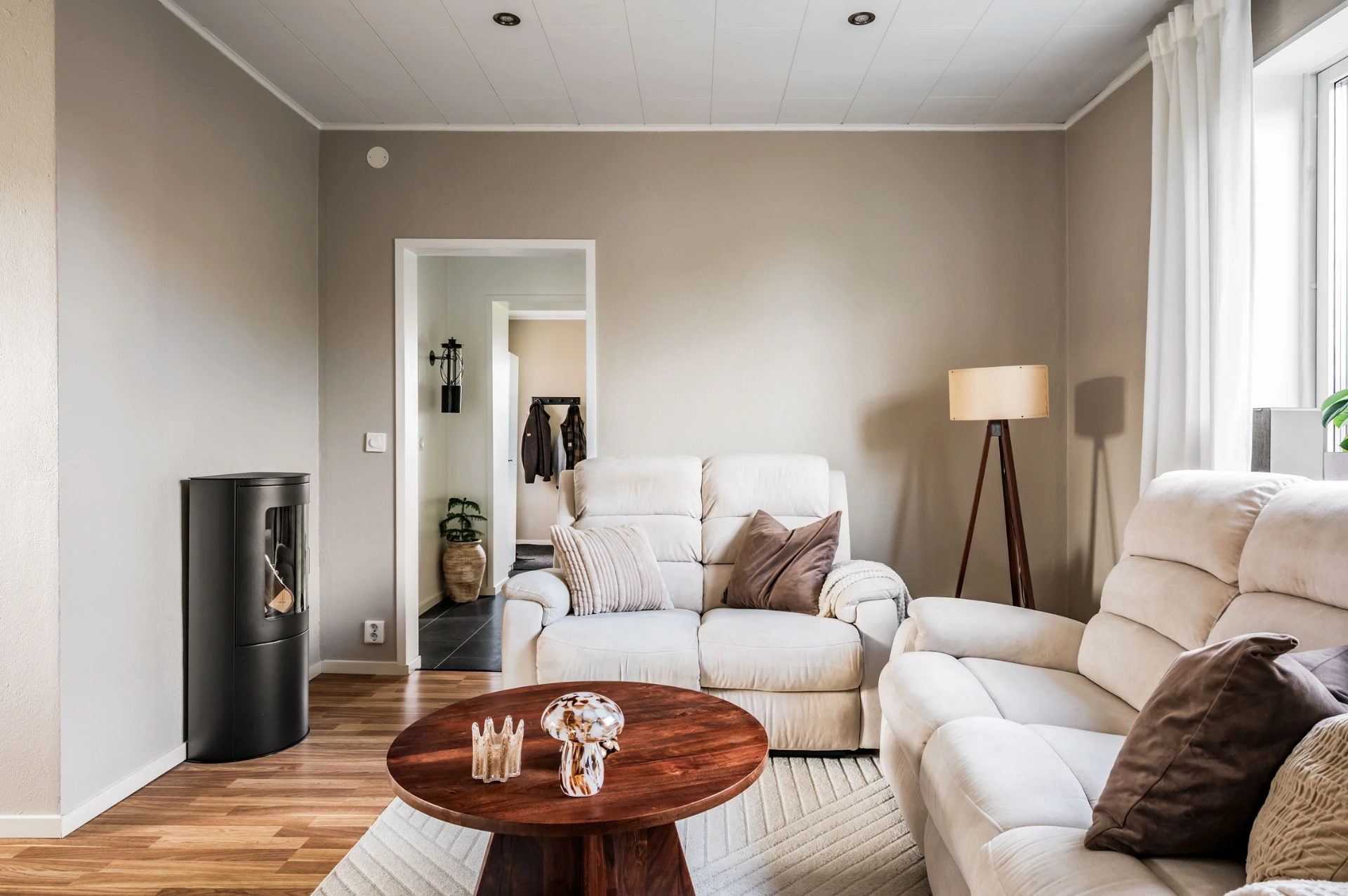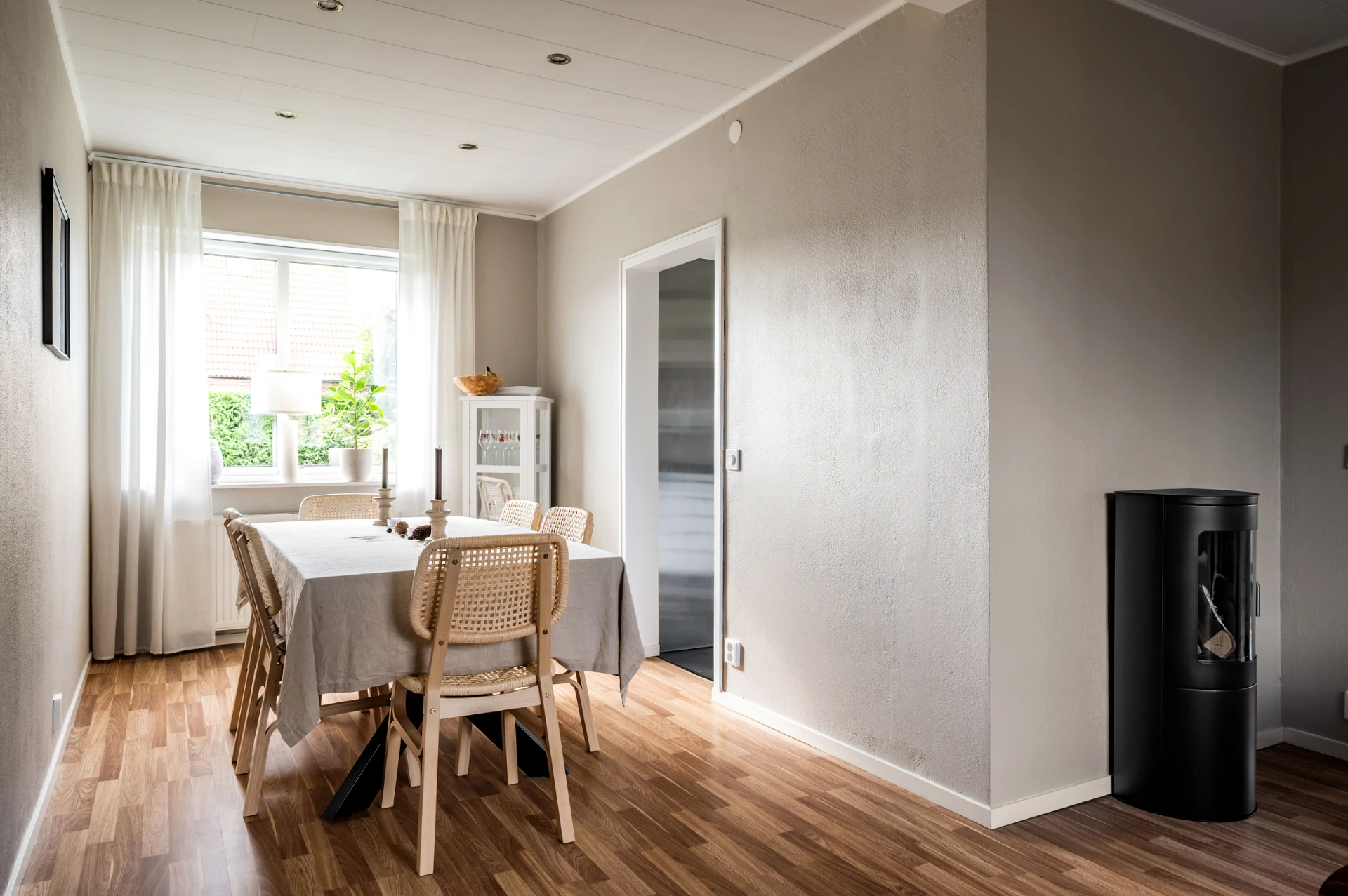 Genomgående rum med fönster på vardera sida, öppen planlösning till matplatsen bredvid köket. Vit trappa. Parkettgolv, beiga väggar och spotlights.