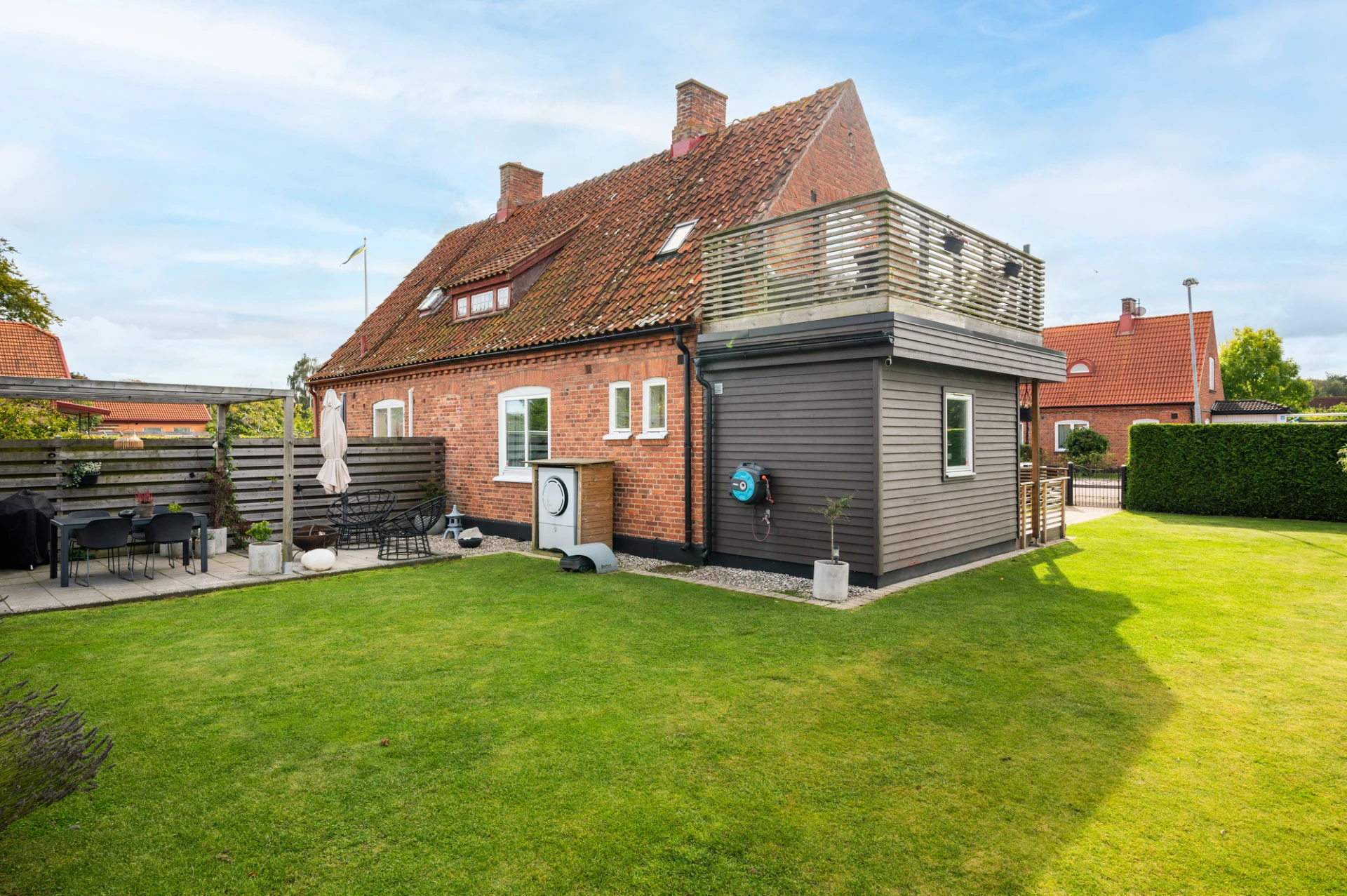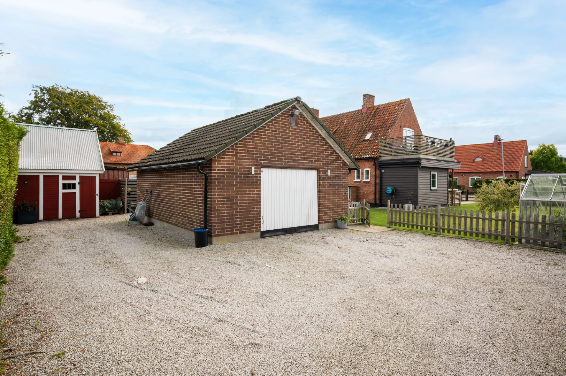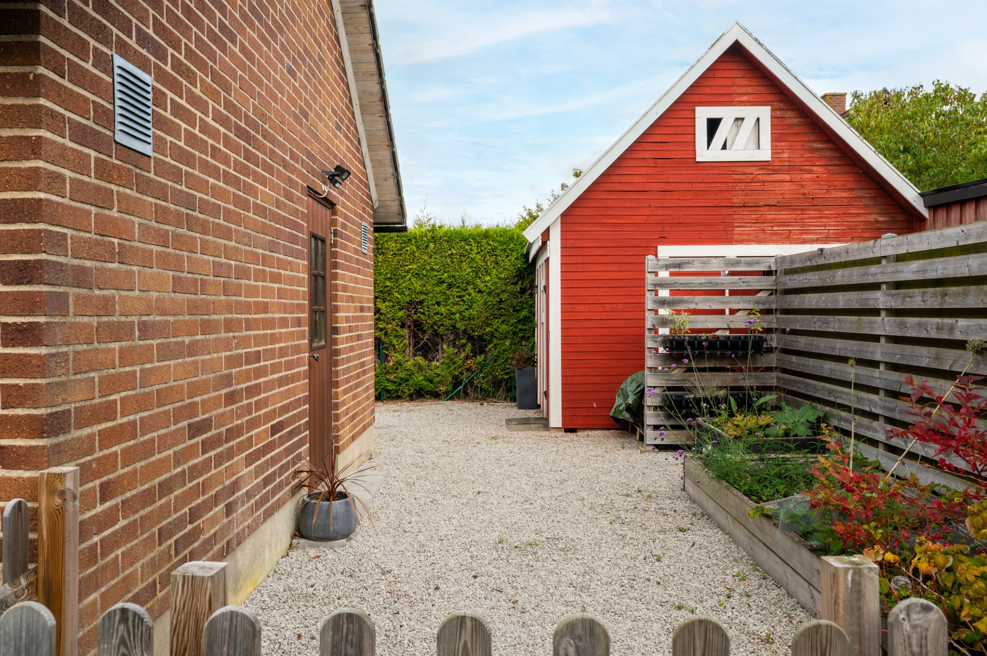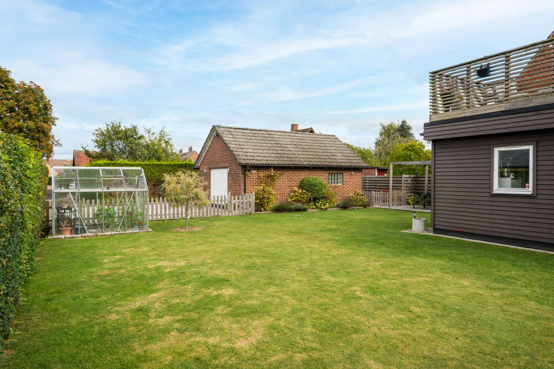 Vacker trädgård med häck, växthus, stenlagd gång och staket.