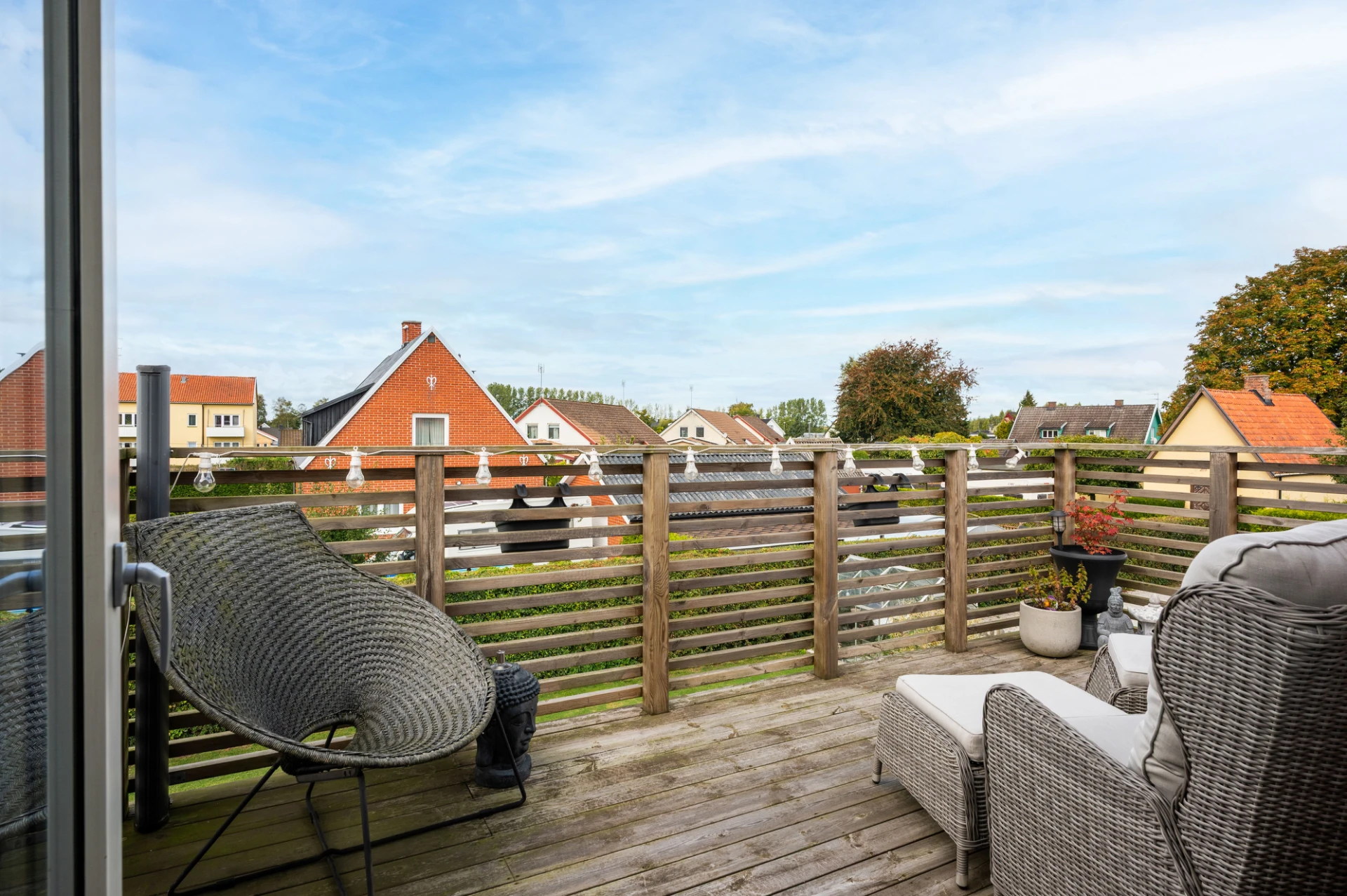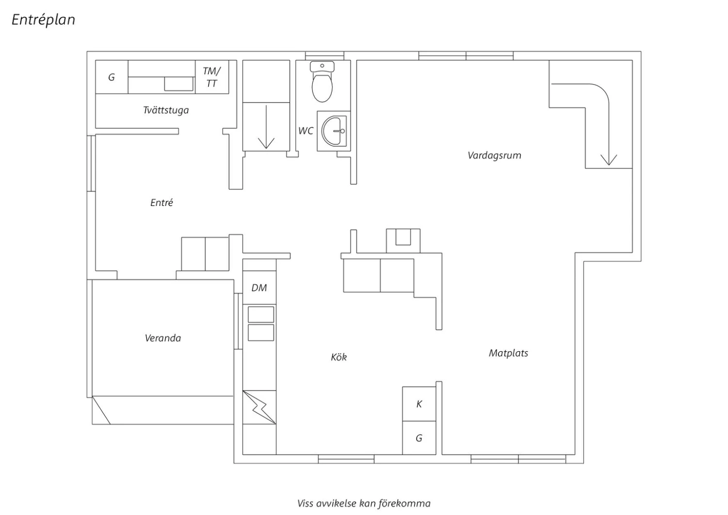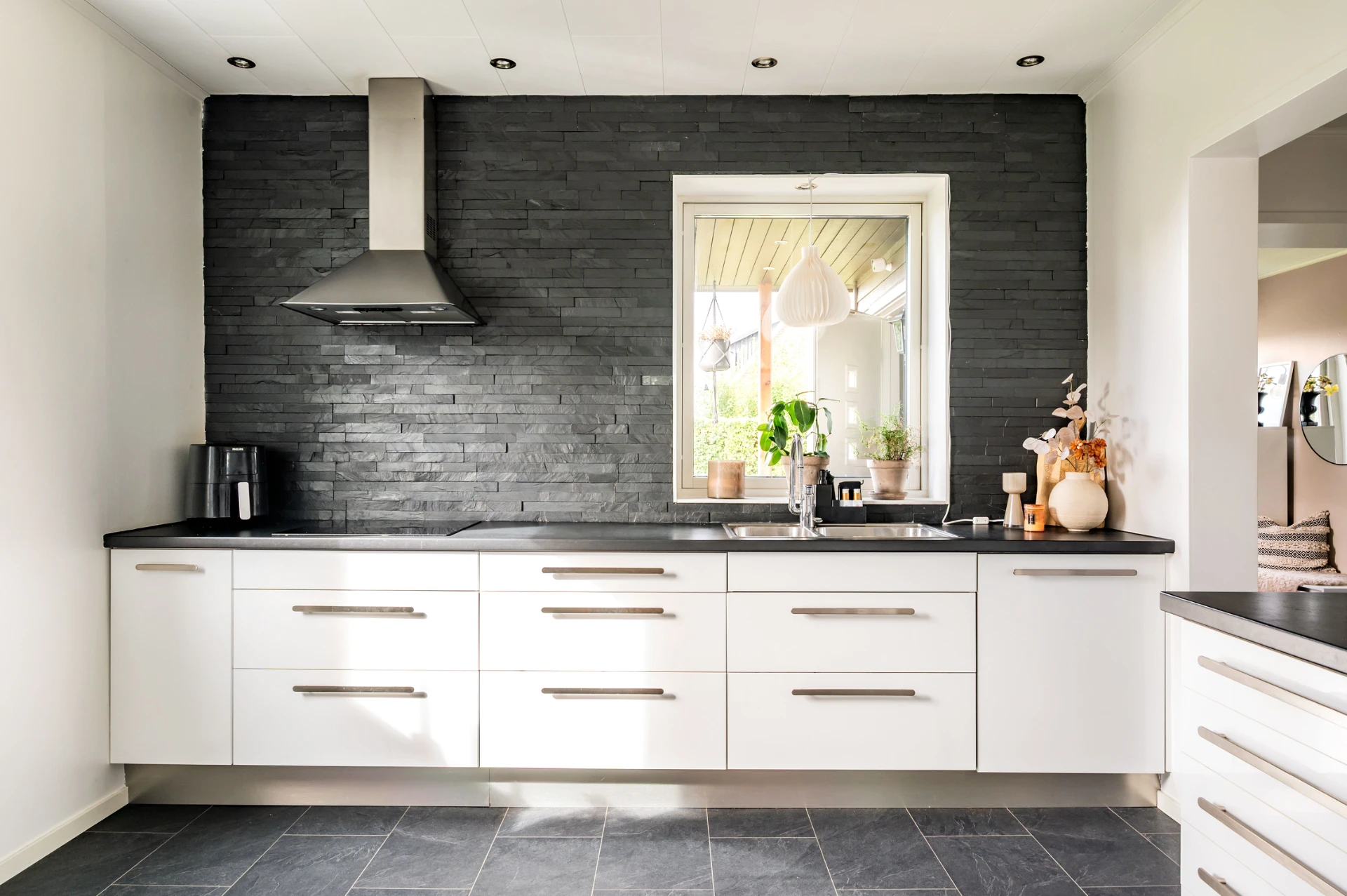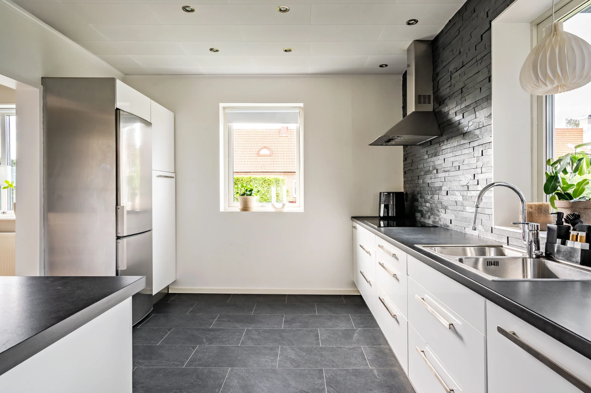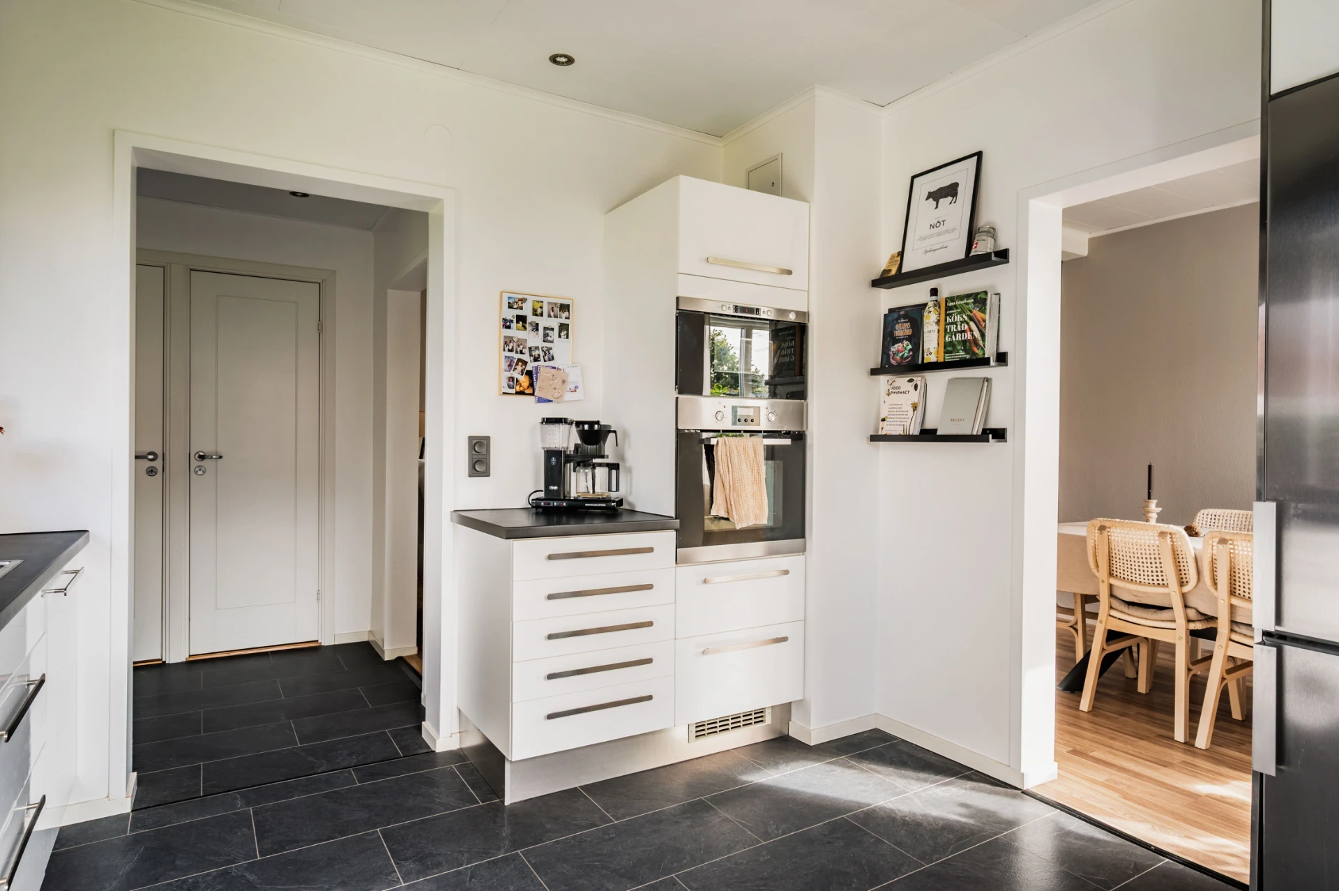 Rymligt med vita luckor med svart bänkskiva och matchande svart kakel. Rostfri kyl/frys, svart spishäll, rostfri fläkt. Rostfri ugn och mikro i arbetshöjd. Vita väggar, grått klinker, spotlights i taket.
