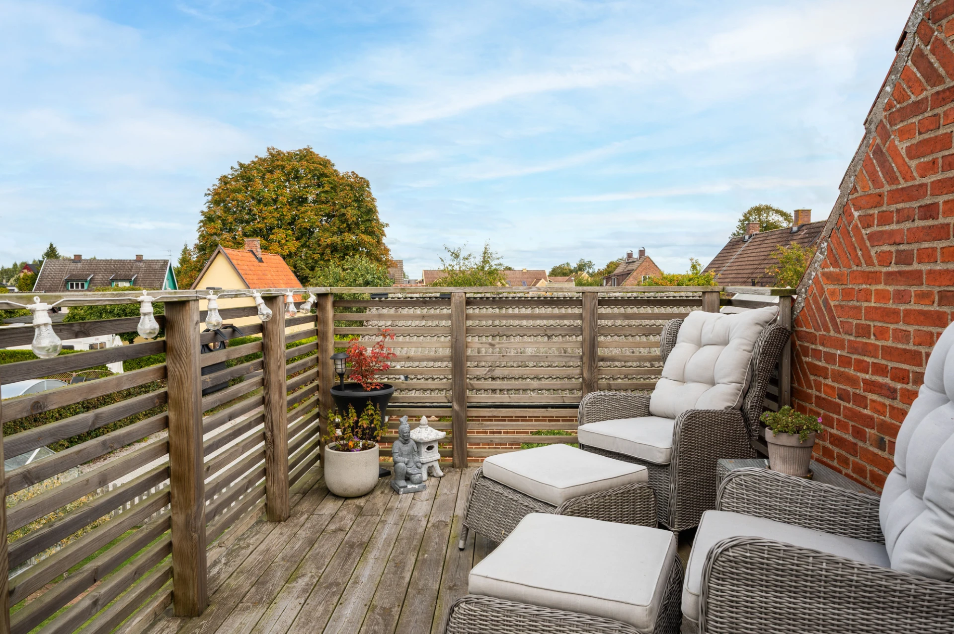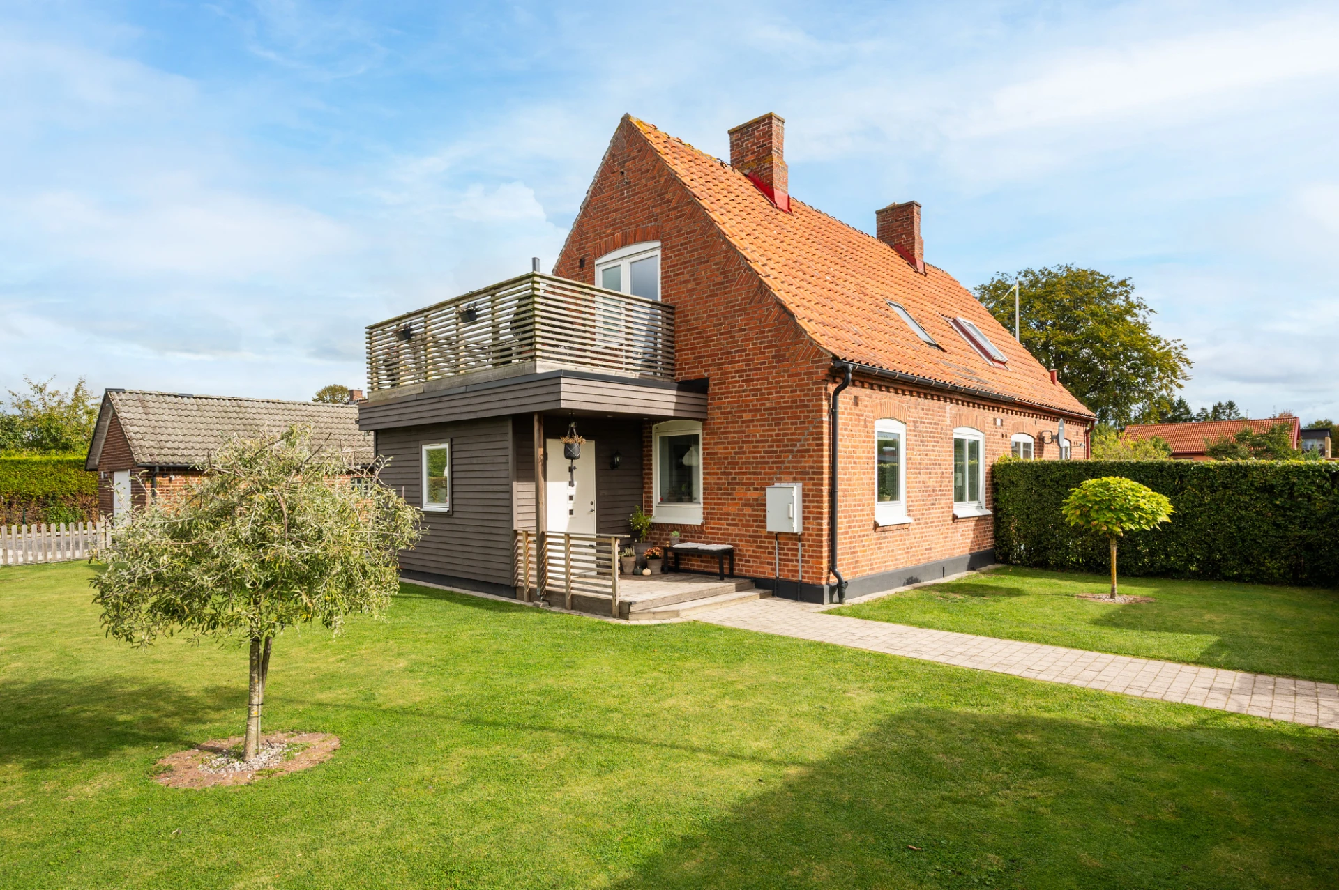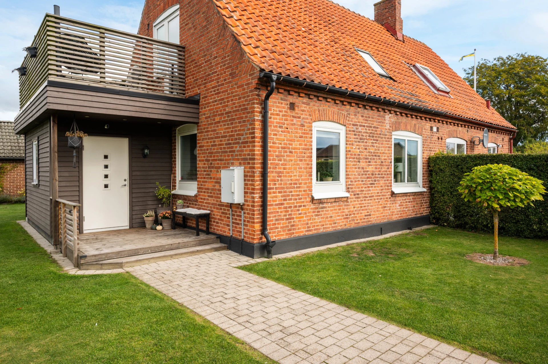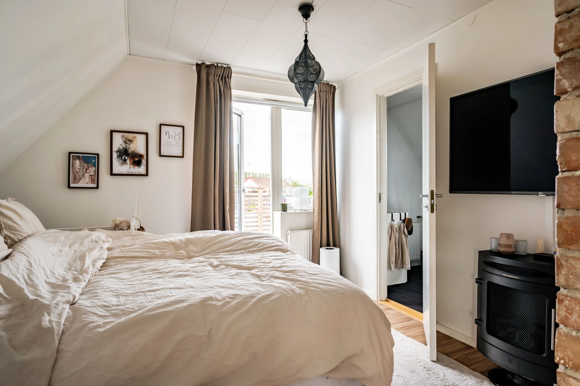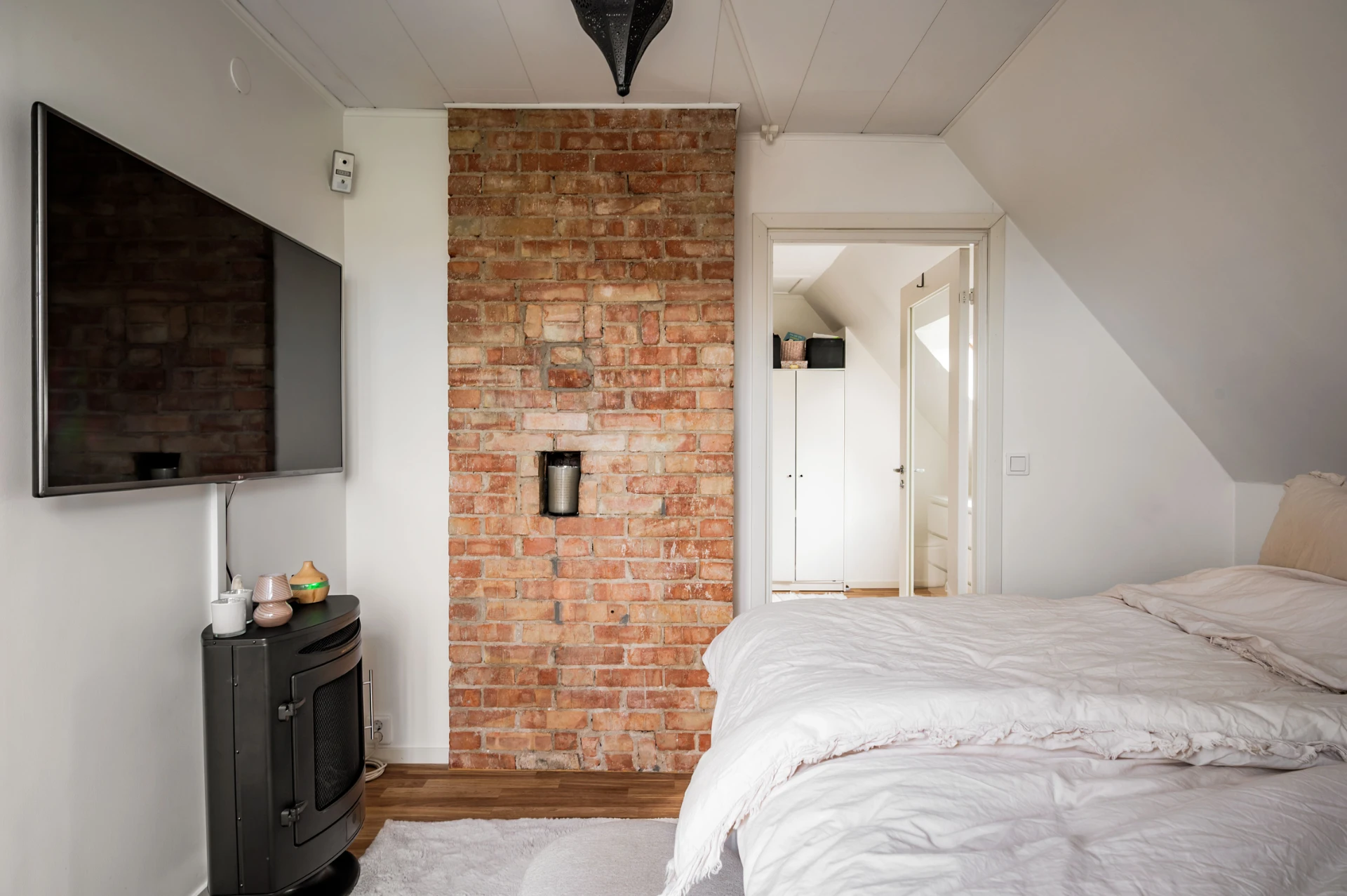 Plats till dubbelsäng. Vita väggar, parkettgolv och synlig tegelvägg. Fönster och balkongdörr i helglas leder ut till stor härlig balkong. Badrum i anslutning till sovrummet.
