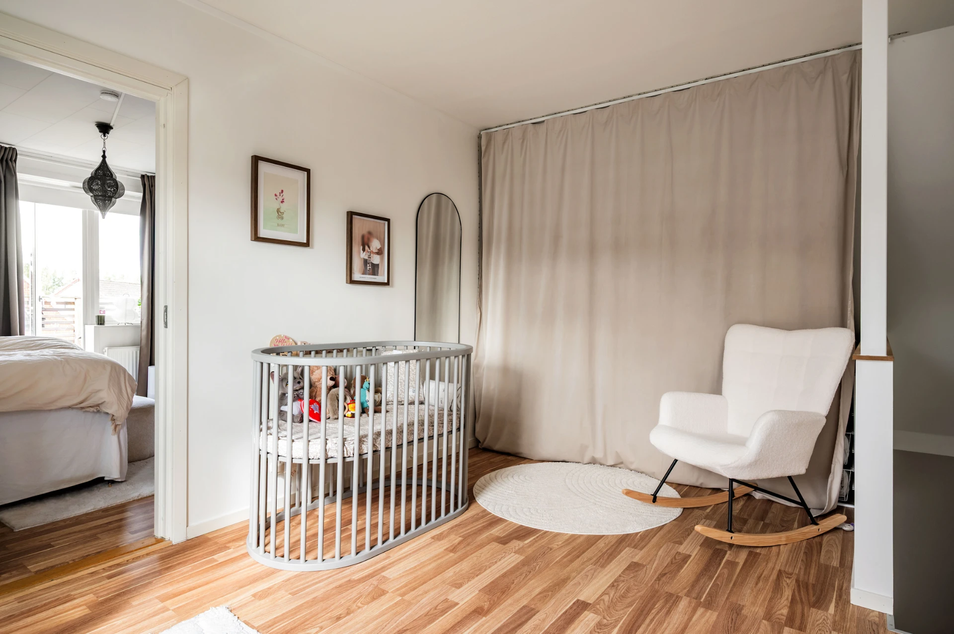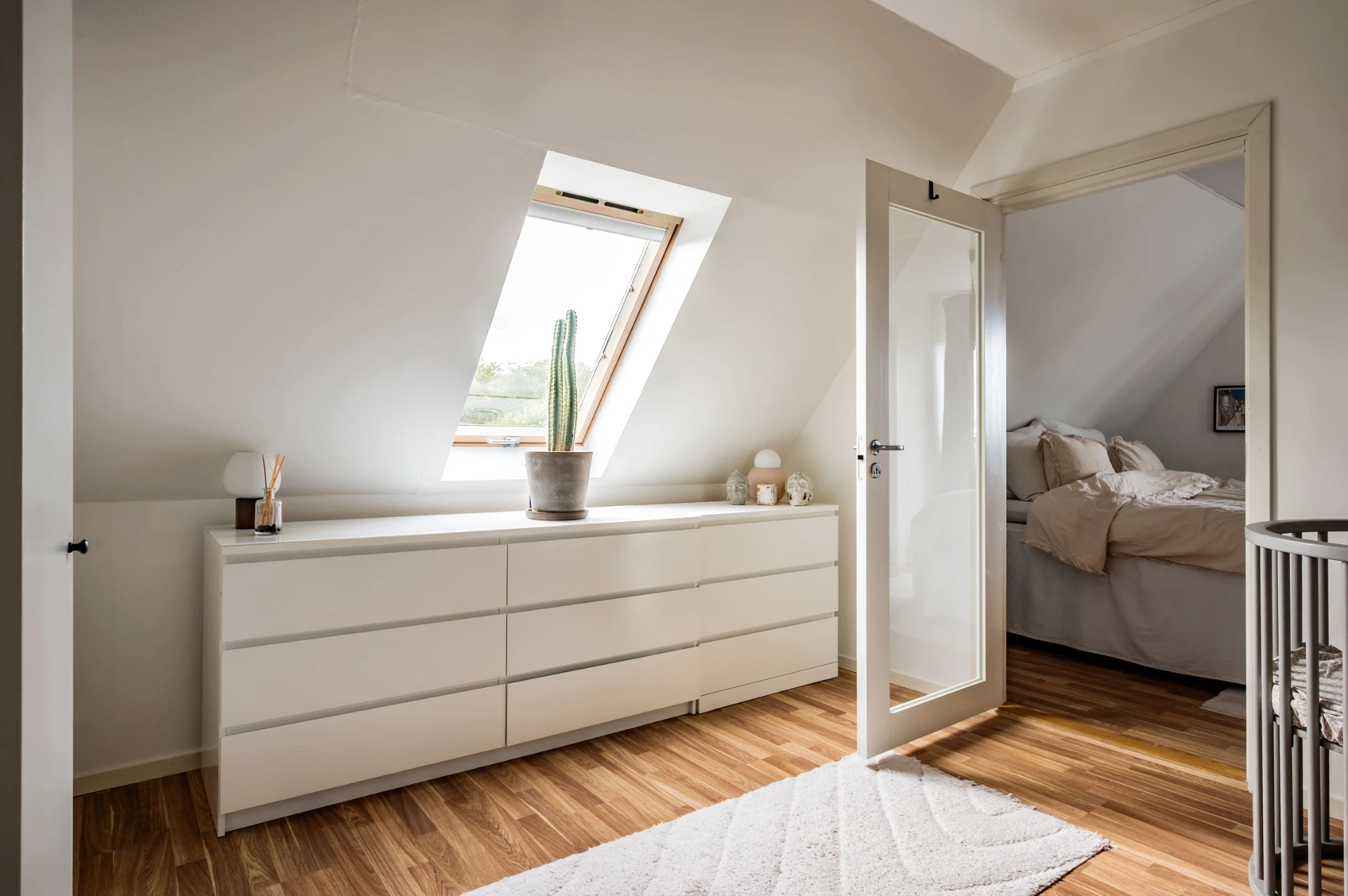 Här kan man göra ett till sovrum, ha ett allrum eller tex kontor. Vita väggar, parkettgolv och ett takfönster i snedtak.