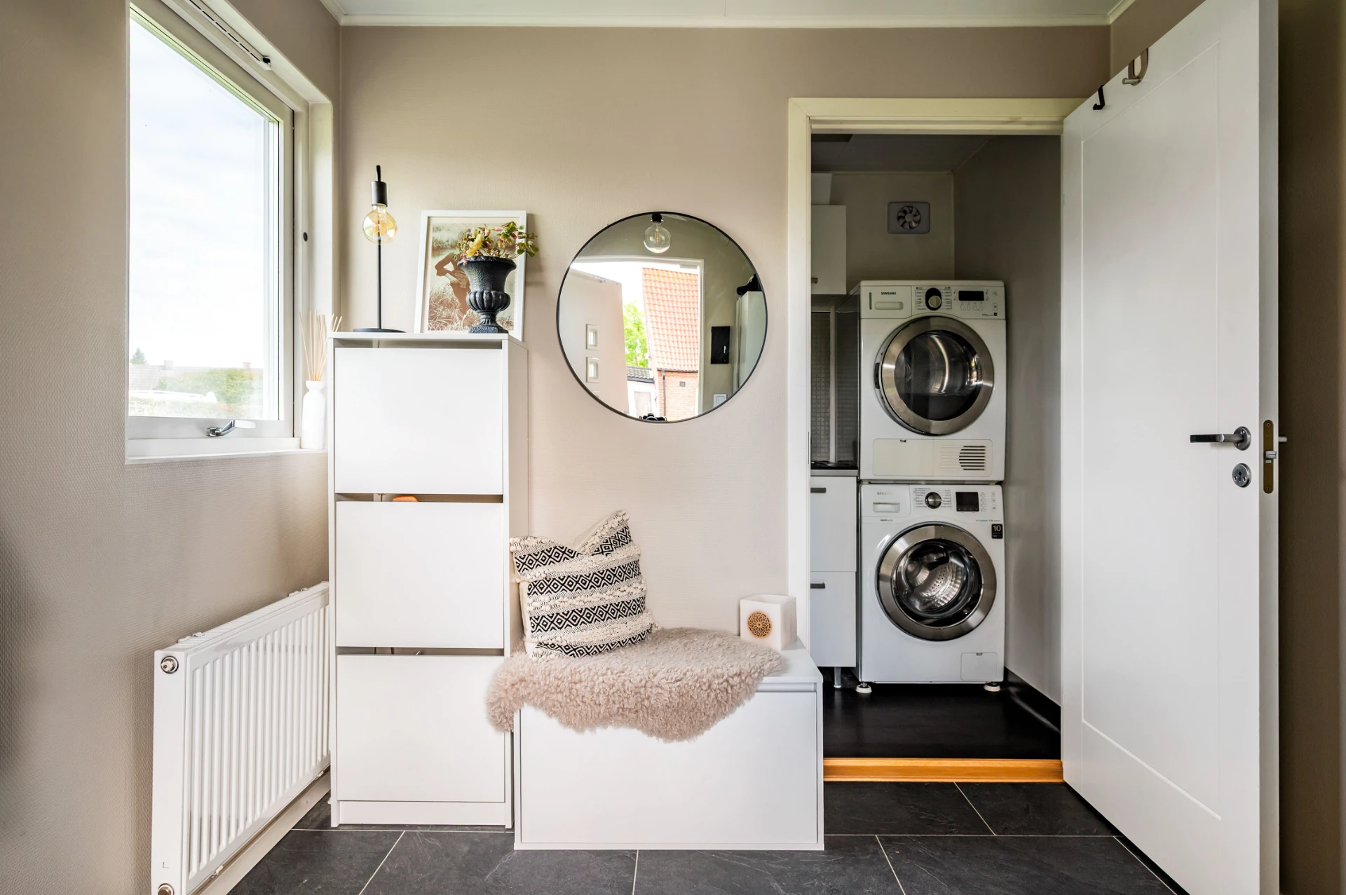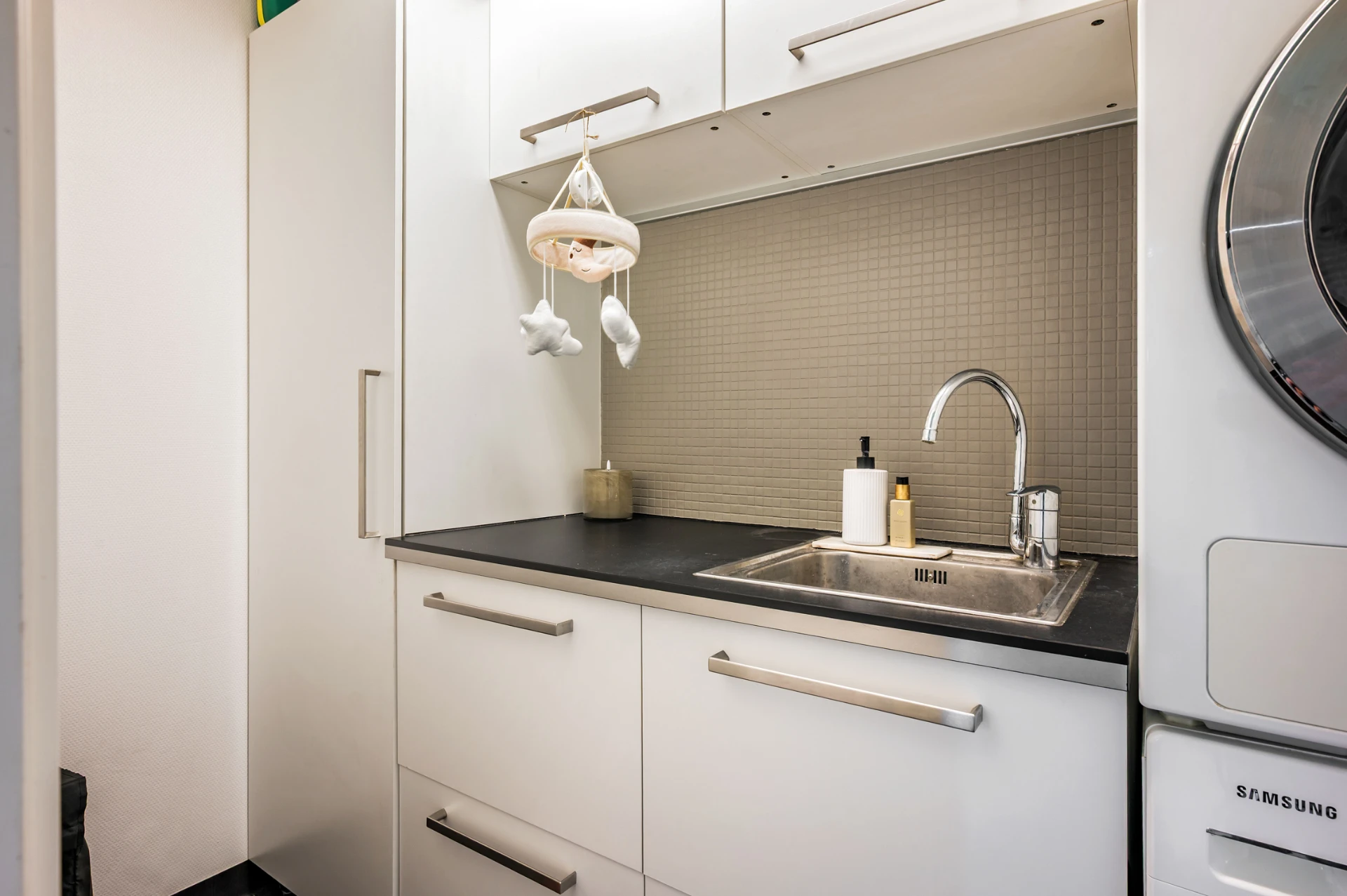 Vita skåpsluckor, grå bänkskiva med rostfri diskho, beigemålat klinker. Tvättmaskin med torktumlare staplad ovanpå. Grå våtrumsmatta, vita väggar.