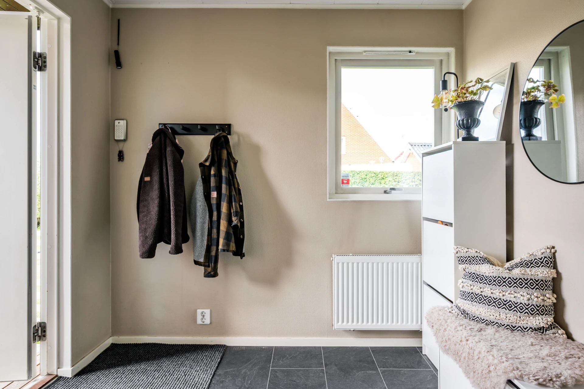 Plats till avhängning, ett fönster släpper in ljus över grått klinkergolv och beiga väggar.