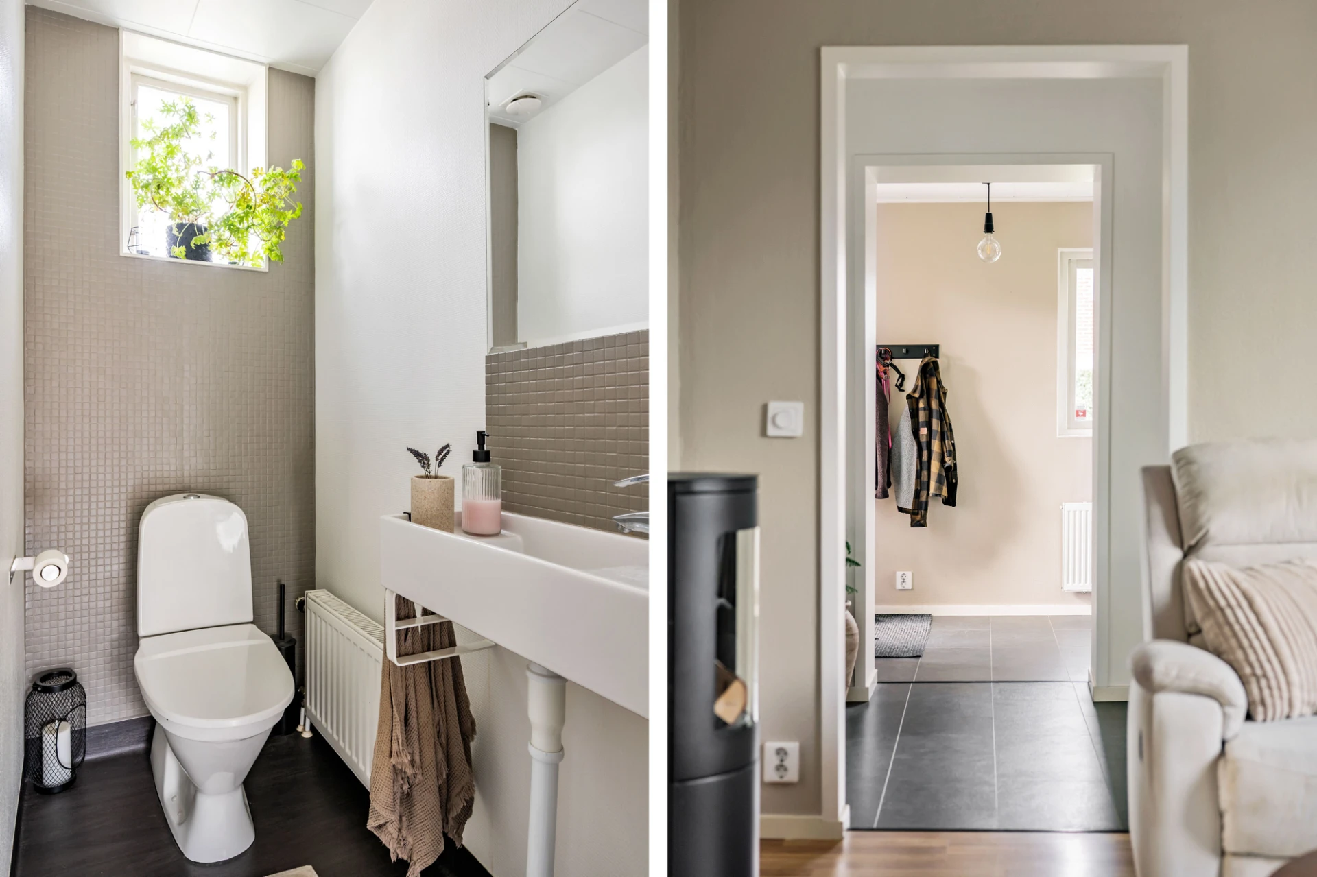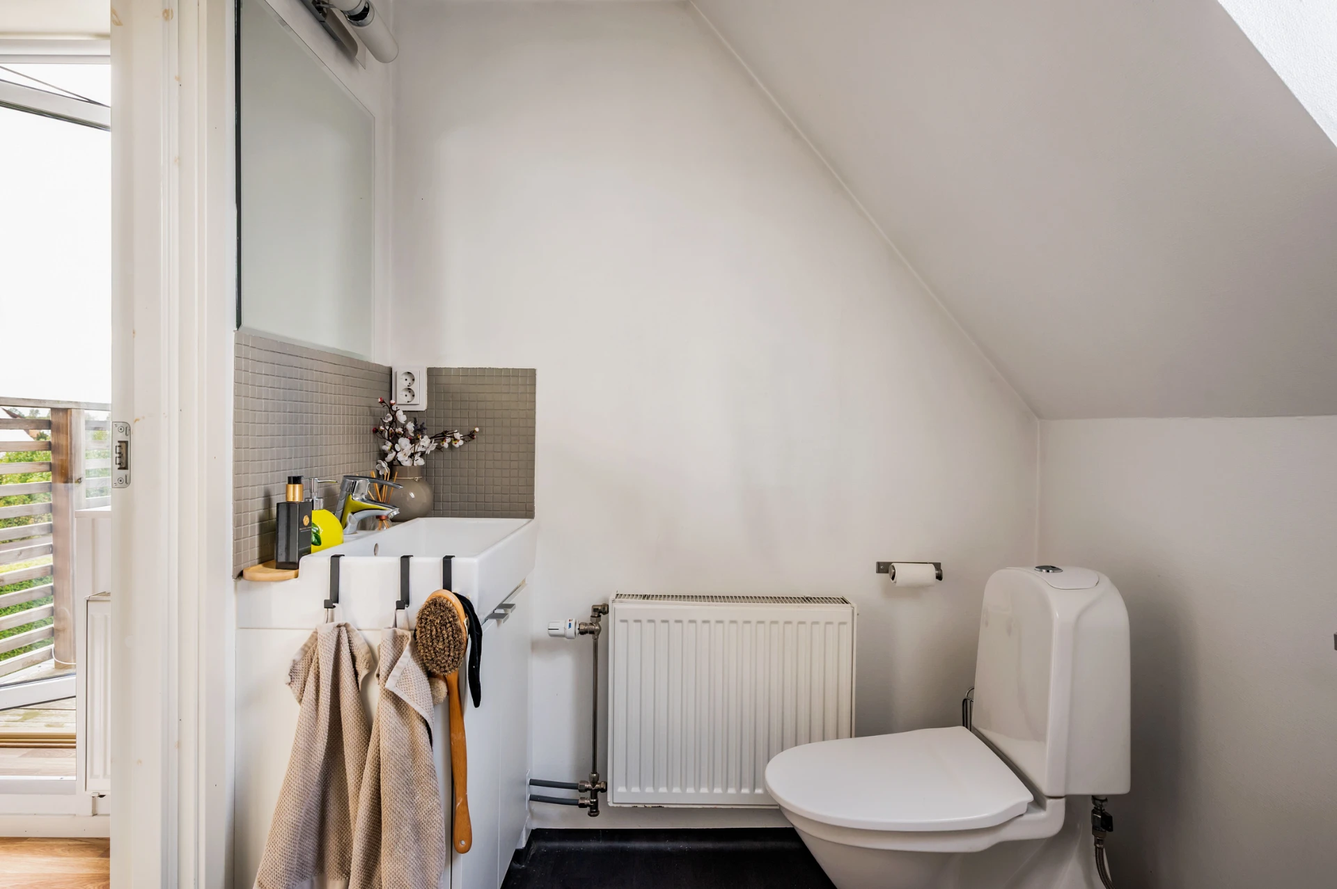 Vit handfatskommod med spegel ovan, beigemålat kakel, element och wc. Duschutrymme med snedvägg, glasdörr och ljust målat terrakottakakel. Vita väggar, mörkgrå våtrumsmatta och ett takfönster.