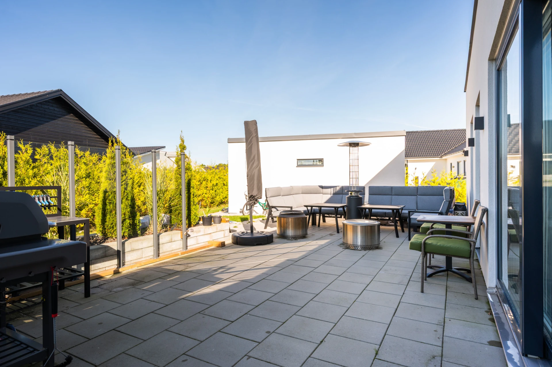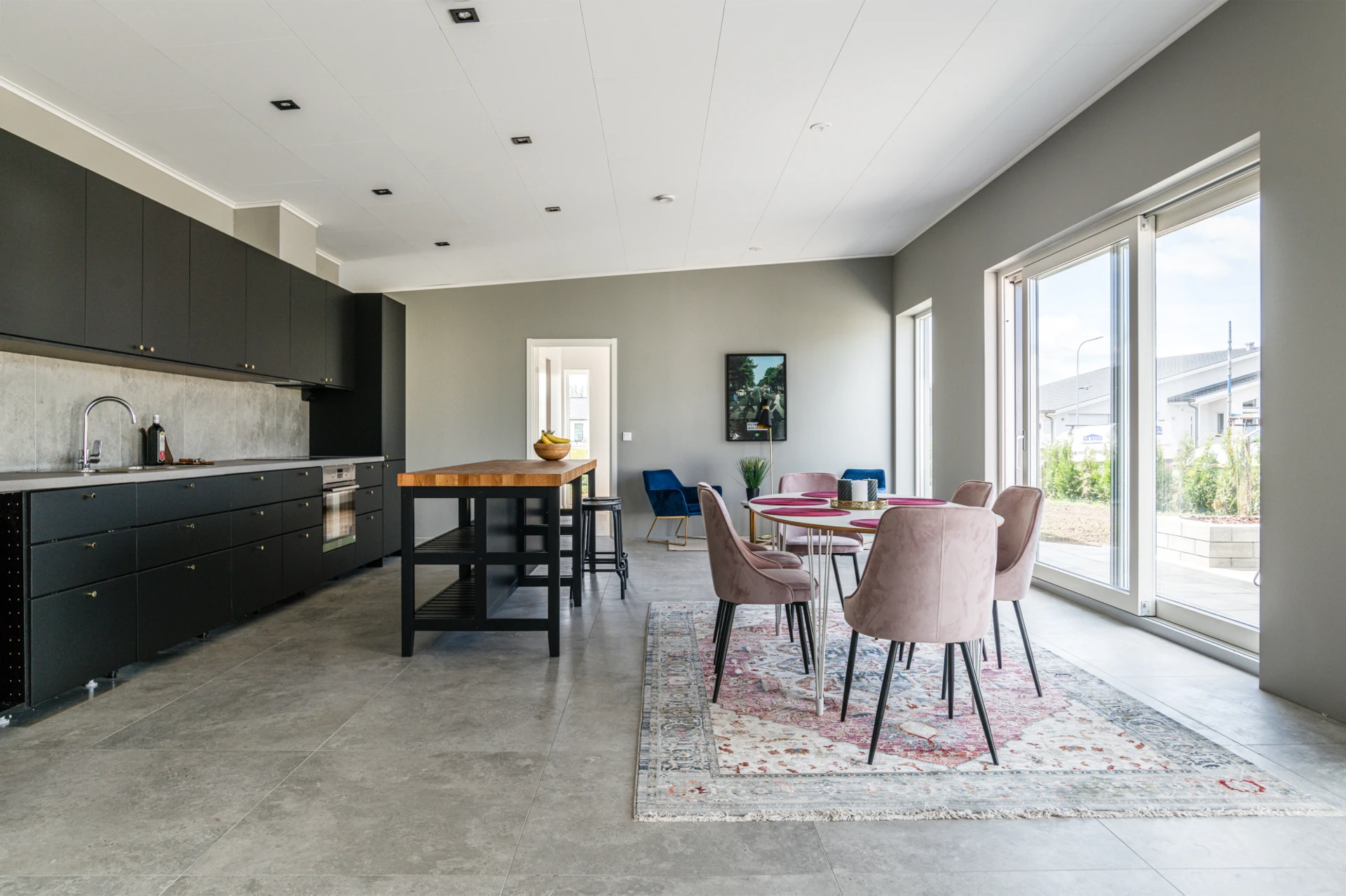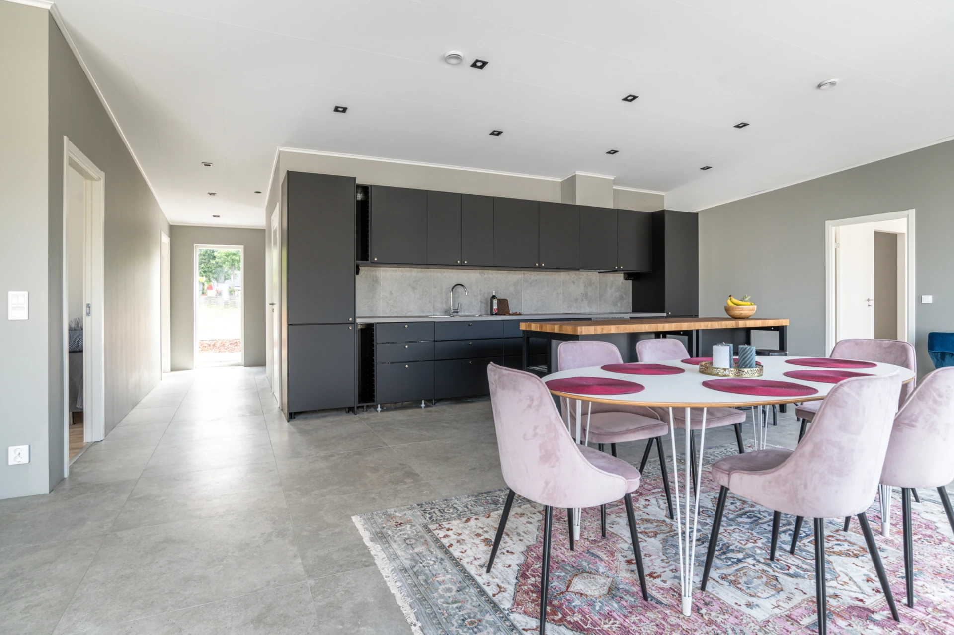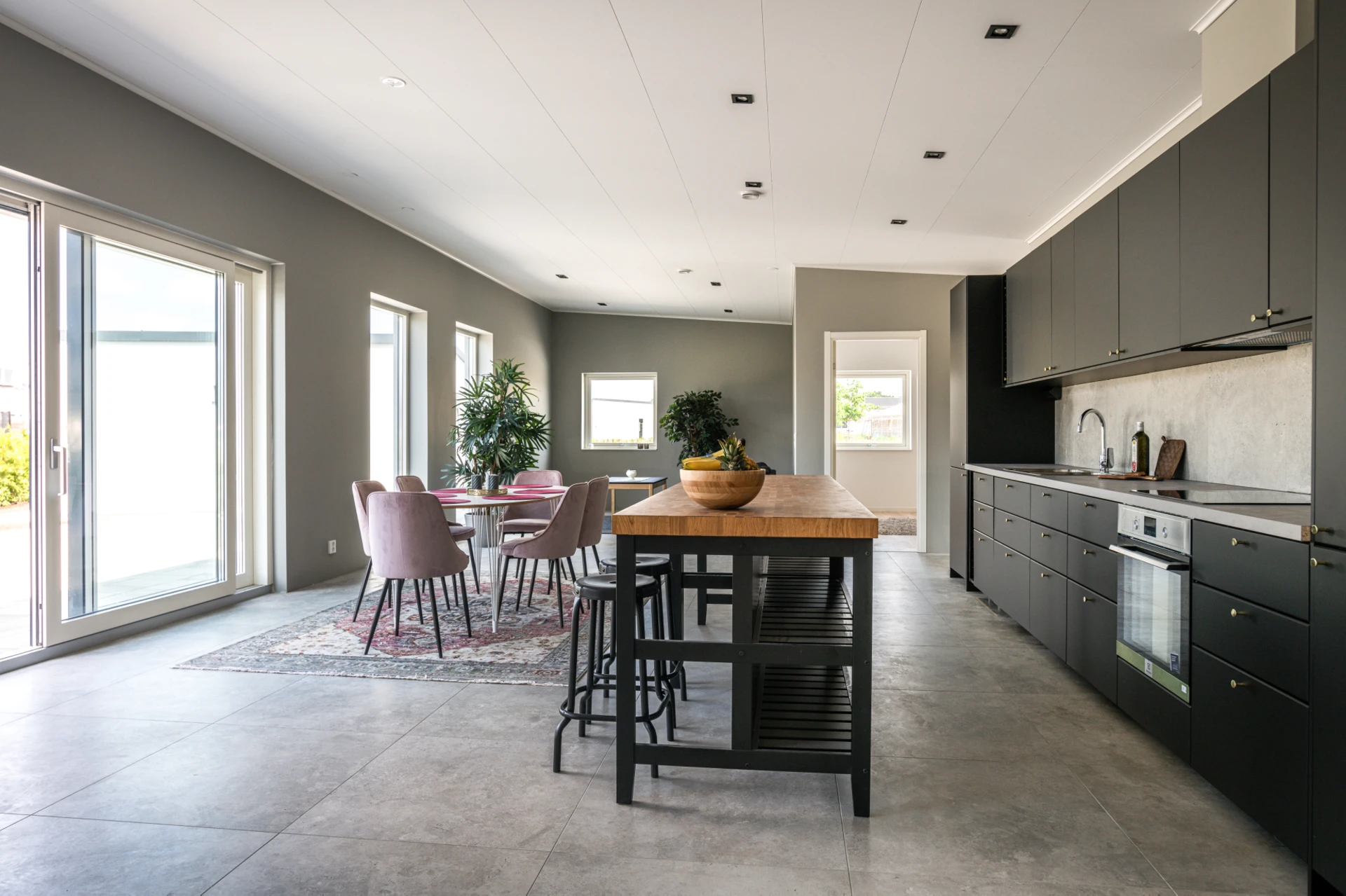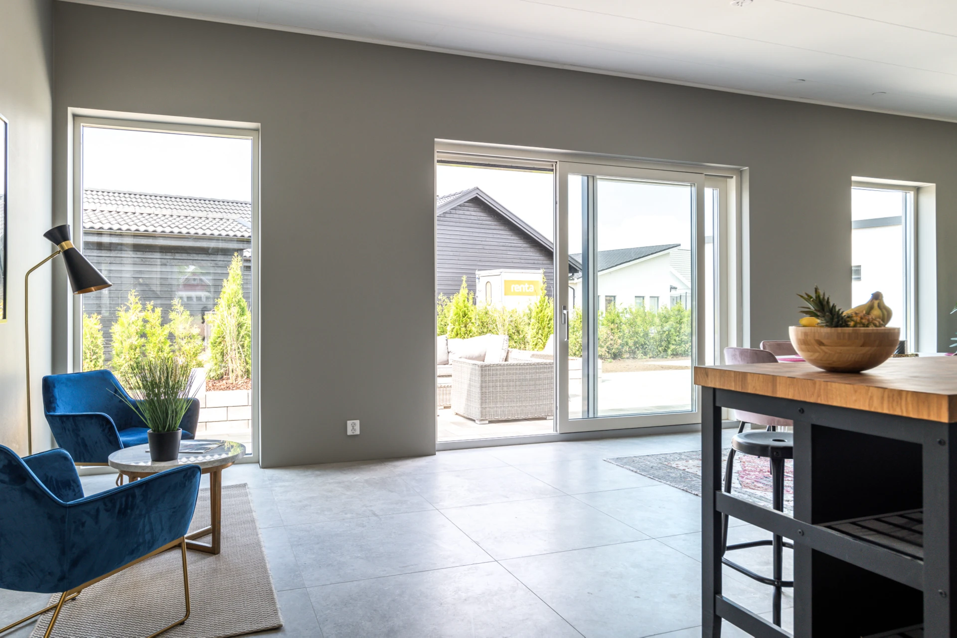 Ett rymligt vardagsrum med fantastiskt ljusinsläpp från fönsterpartier i flera väderstreck som skapar både rymd och trivsel. De öppna, ljusa sällskapsytorna ligger i direkt anslutning till köket och bjuder in till socialt umgänge. Via dubbla skjutdörrar i glas öppnar rummet upp mot altanen och trädgården – perfekt för sommarens middagar och sammankomster. Golvet är klätt i exklusiva grå granitkeramikplattor, med målade väggar och elegant spotlightsbelysning som ramar in den moderna känslan.
