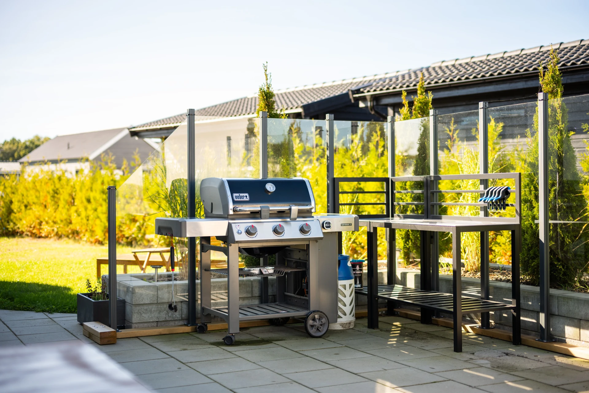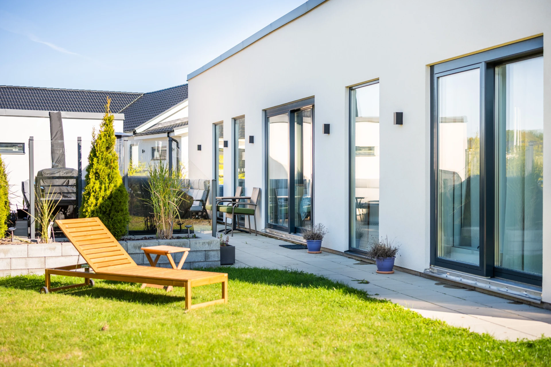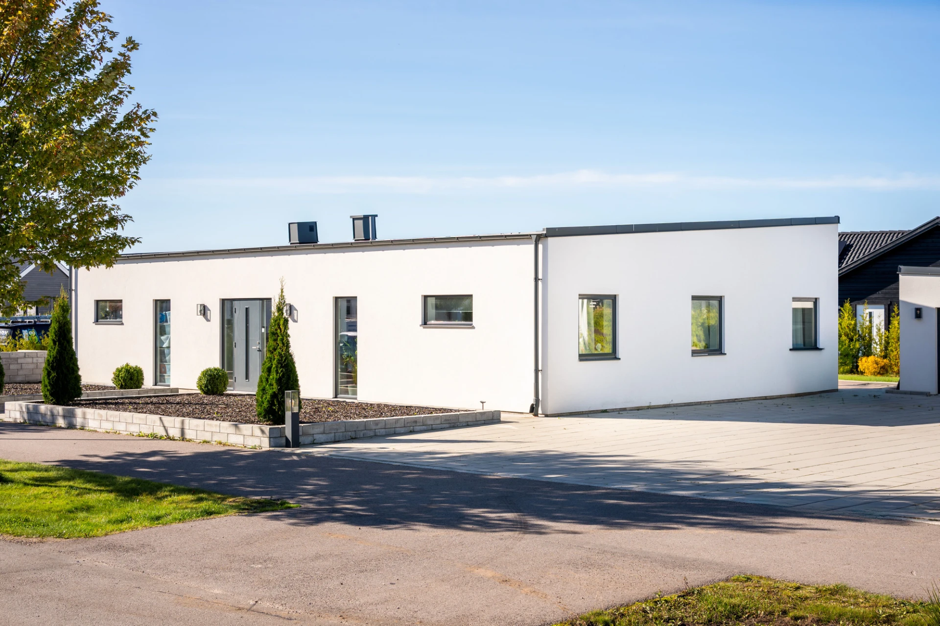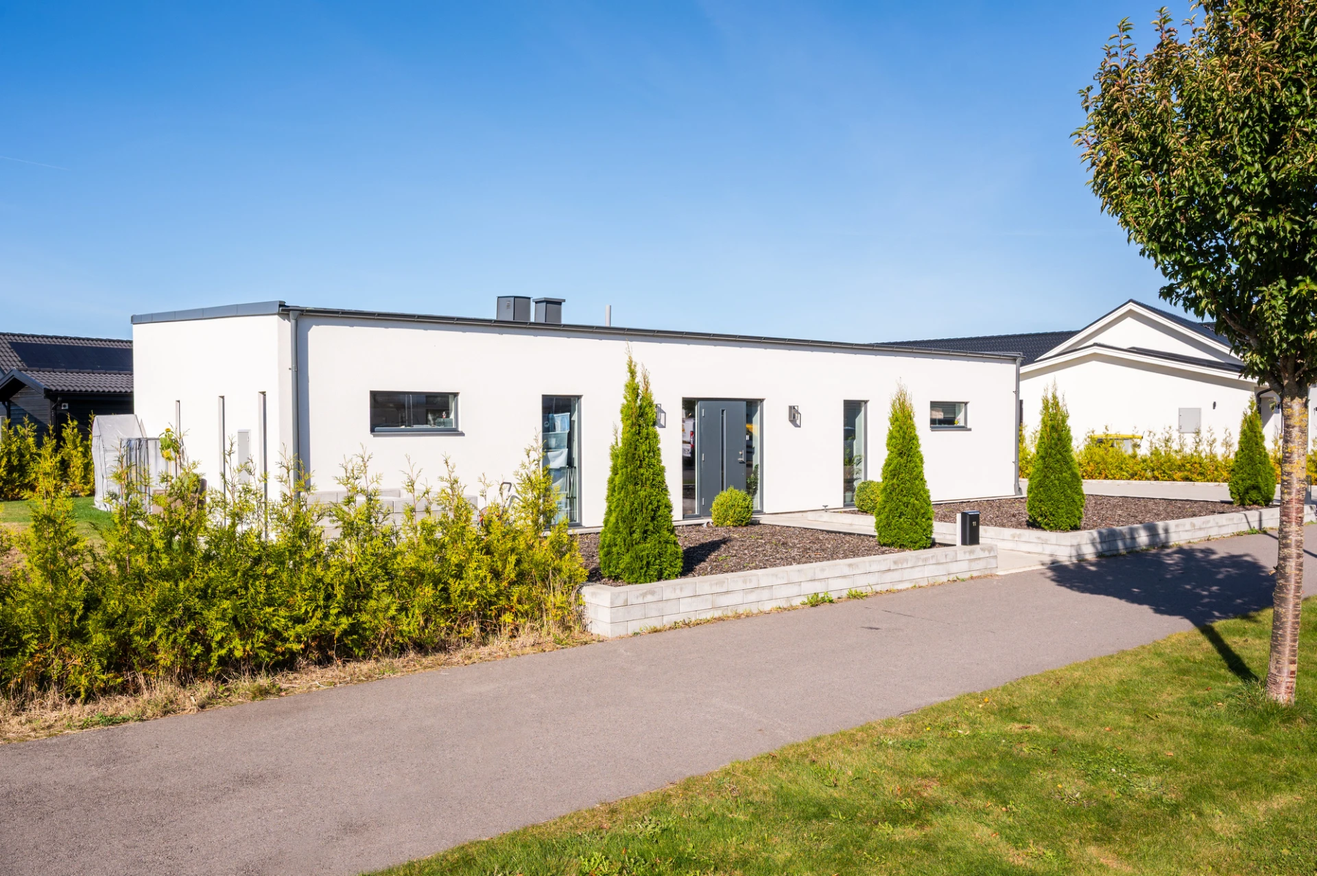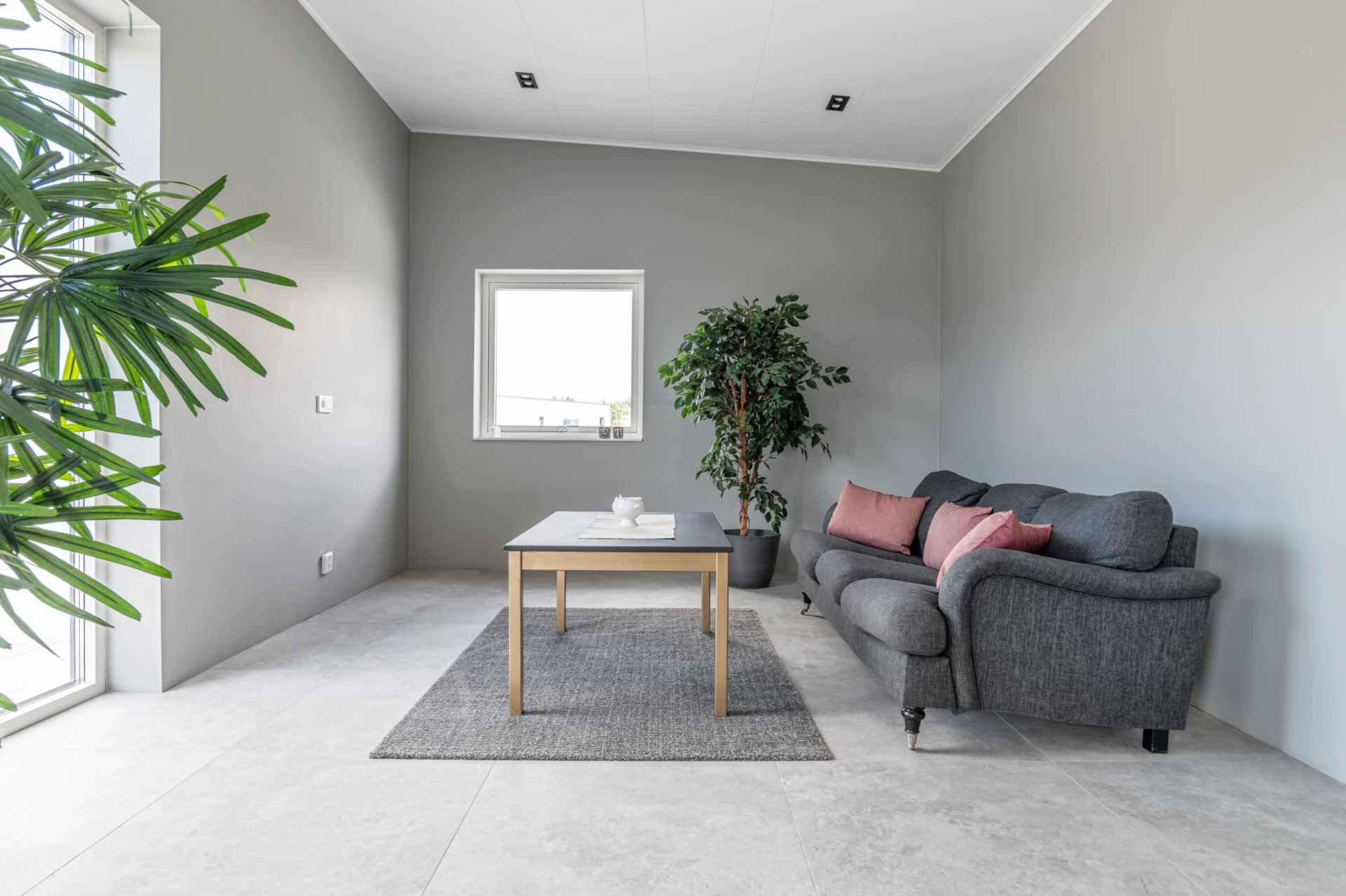 Ett rymligt vardagsrum med fantastiskt ljusinsläpp från fönsterpartier i flera väderstreck som skapar både rymd och trivsel. De öppna, ljusa sällskapsytorna ligger i direkt anslutning till köket och bjuder in till socialt umgänge. Via dubbla skjutdörrar i glas öppnar rummet upp mot altanen och trädgården – perfekt för sommarens middagar och sammankomster. Golvet är klätt i exklusiva grå granitkeramikplattor, med målade väggar och elegant spotlightsbelysning som ramar in den moderna känslan.