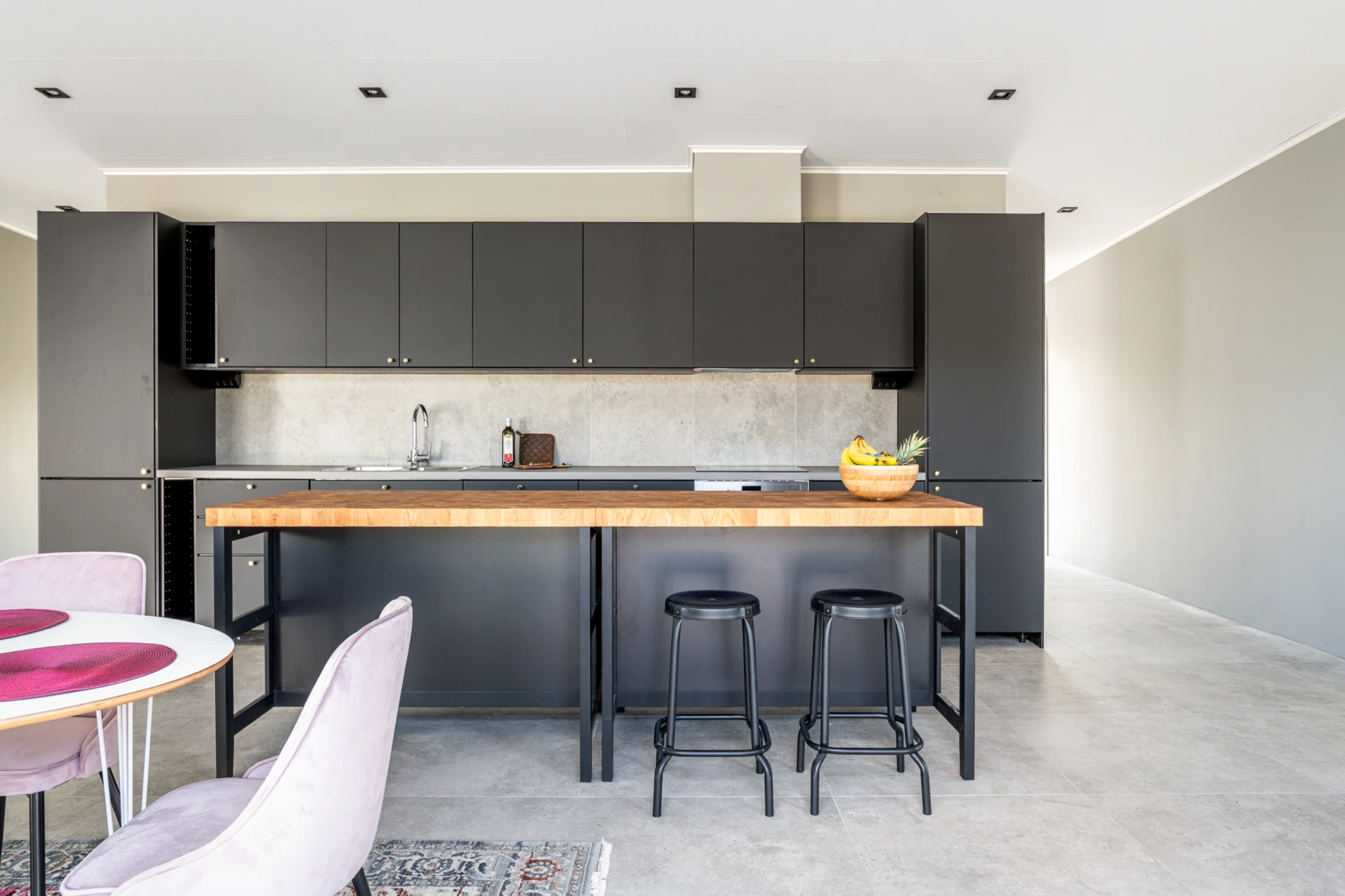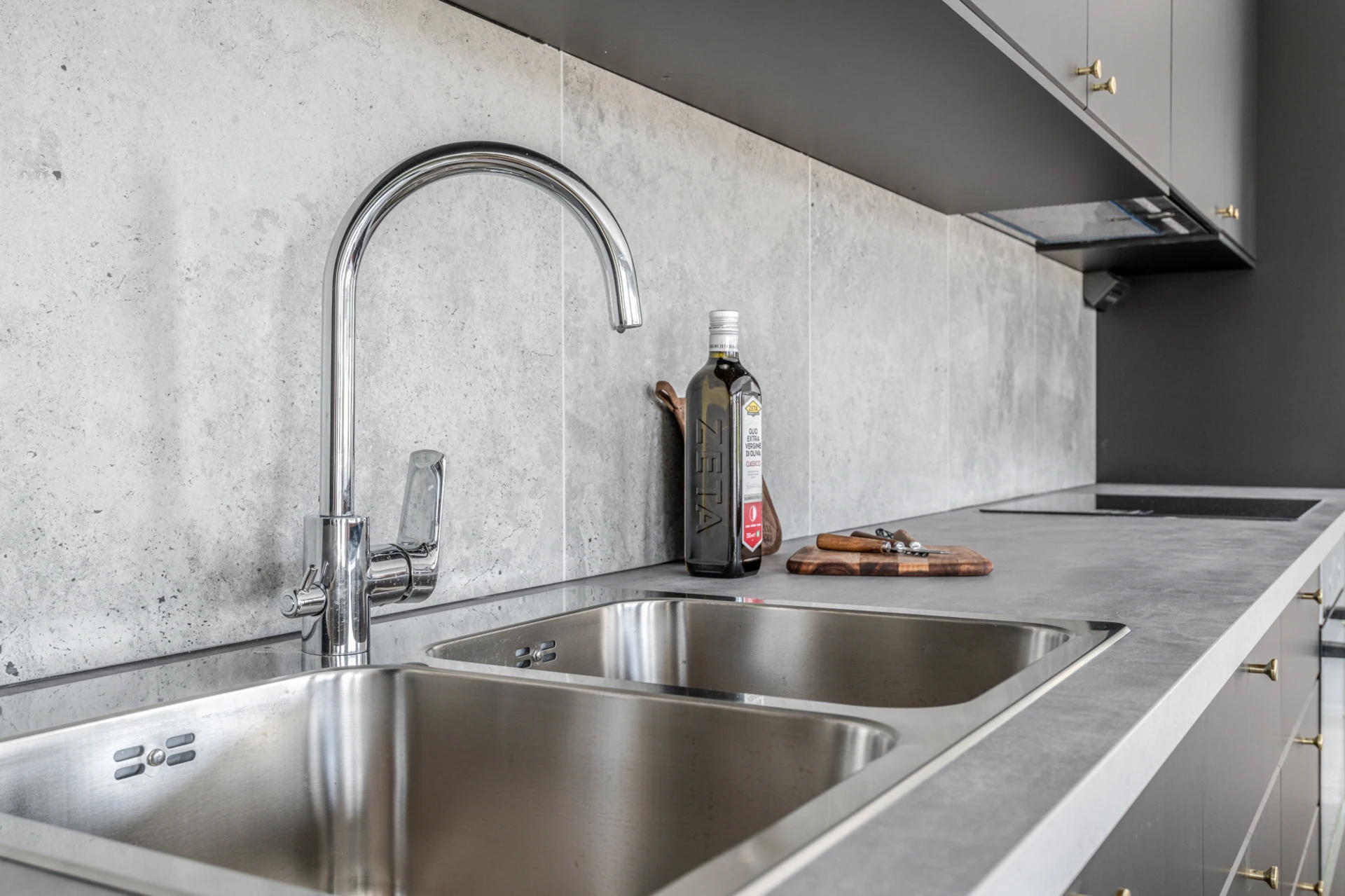 Stilrent och välutrustat kök med generösa arbetsytor i tidlöst mörkgrått utförande. Här möts funktion och design i en genomtänkt planlösning med hel kyl och frys, smart placerade i varsin ände av köket. Arbetsbänken har laminatbänkskiva med granitkeramikplattor som stänkskydd och gott om utrymme för matlagning. Utrustningen består av inbyggnadsugn, häll, fläkt samt diskmaskin med integrerad front. Golvet är belagt med exklusiva grå granitkeramikplattor och rummet ramas in av målade väggar och elegant spotlightsbelysning.
