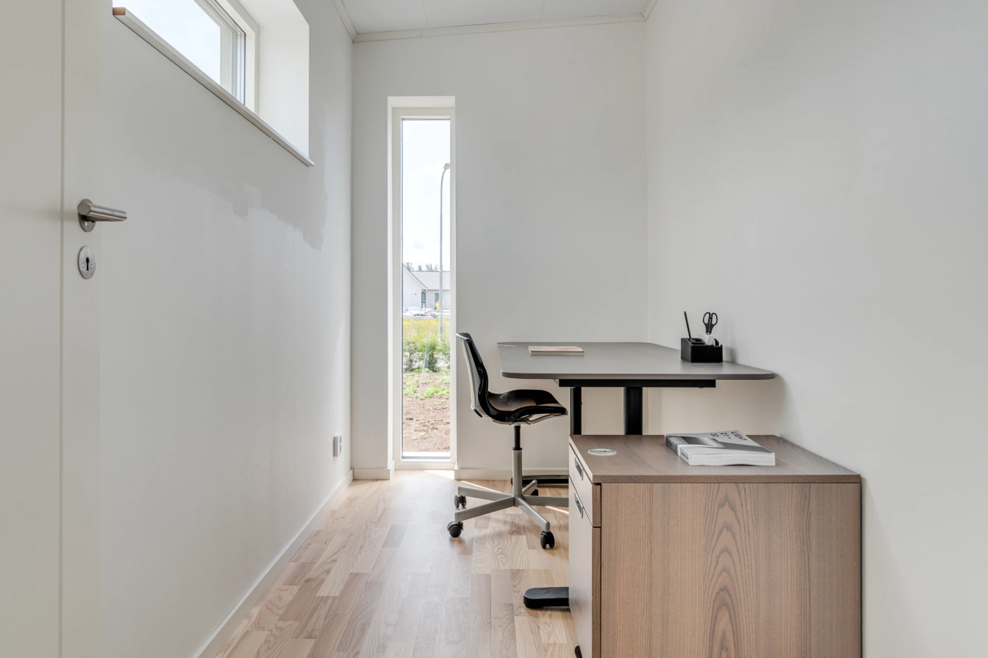 Ett ljust och trivsamt rum med vitpigmenterad askparkett i matt lack och målade väggar som skapar en stilren bas. Här finns garderob för praktisk förvaring och gott om utrymme att möblera efter behov – perfekt som barnrum, gästrum eller arbetsrum.