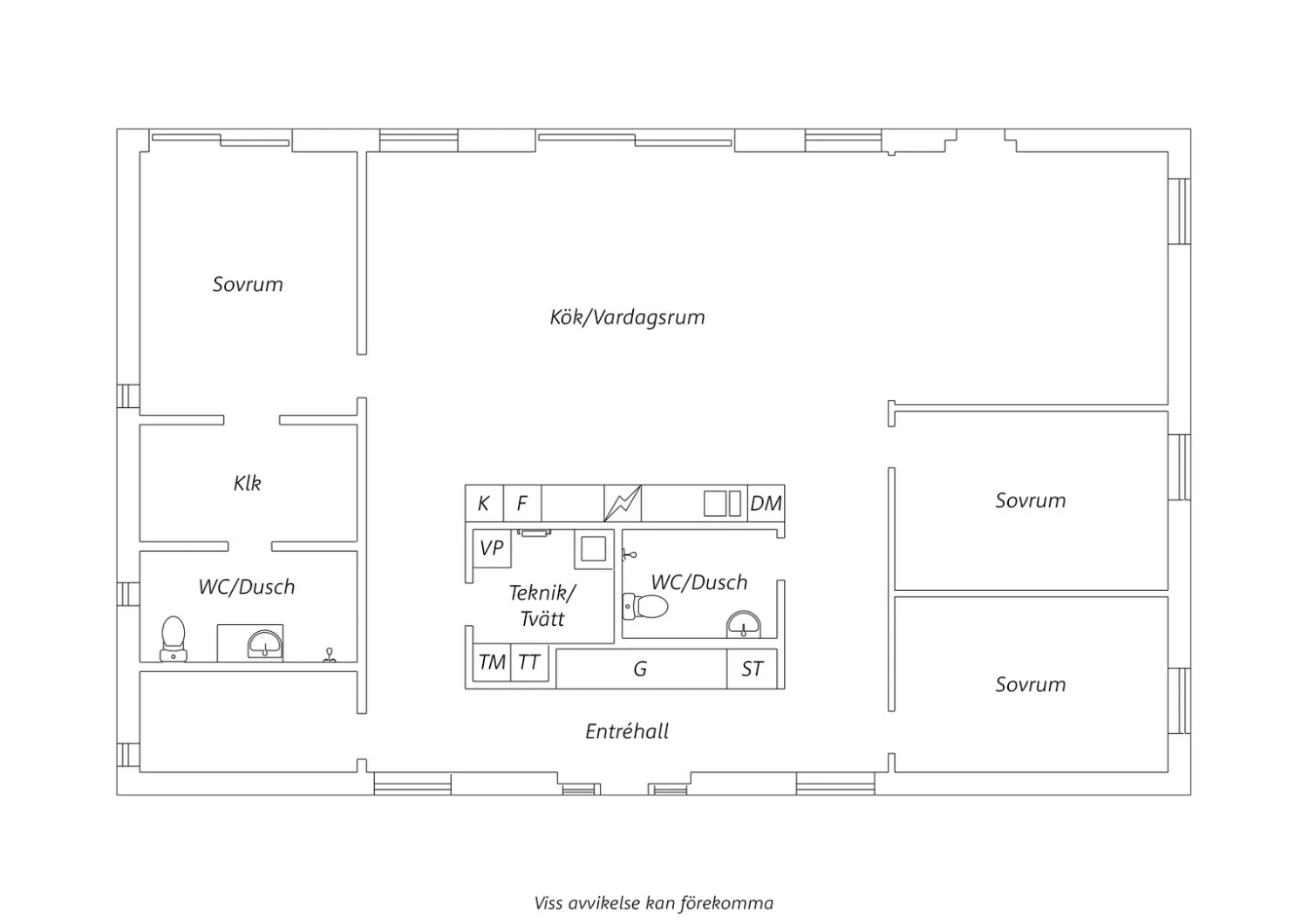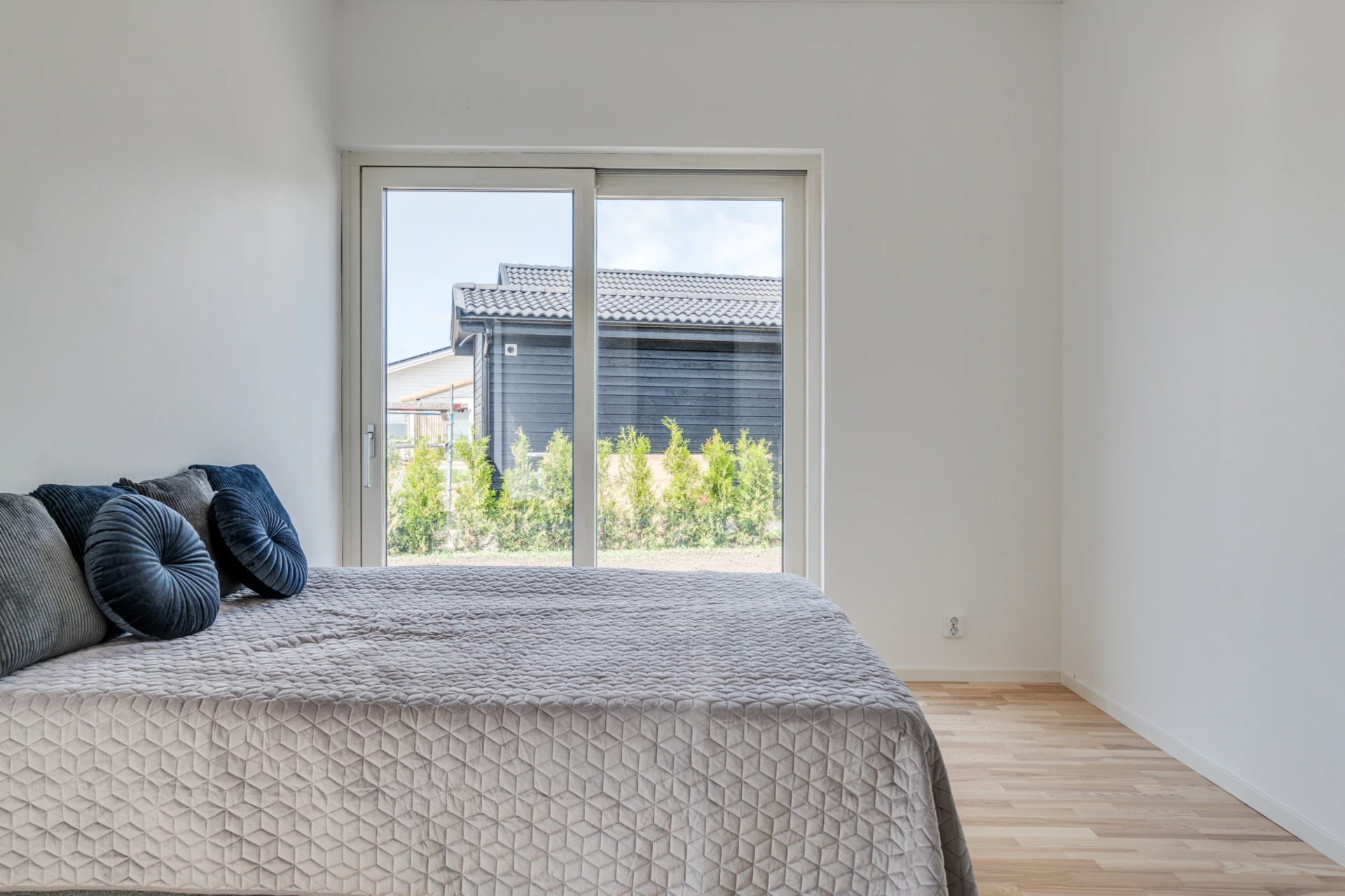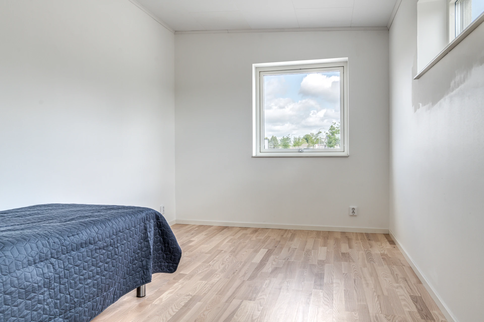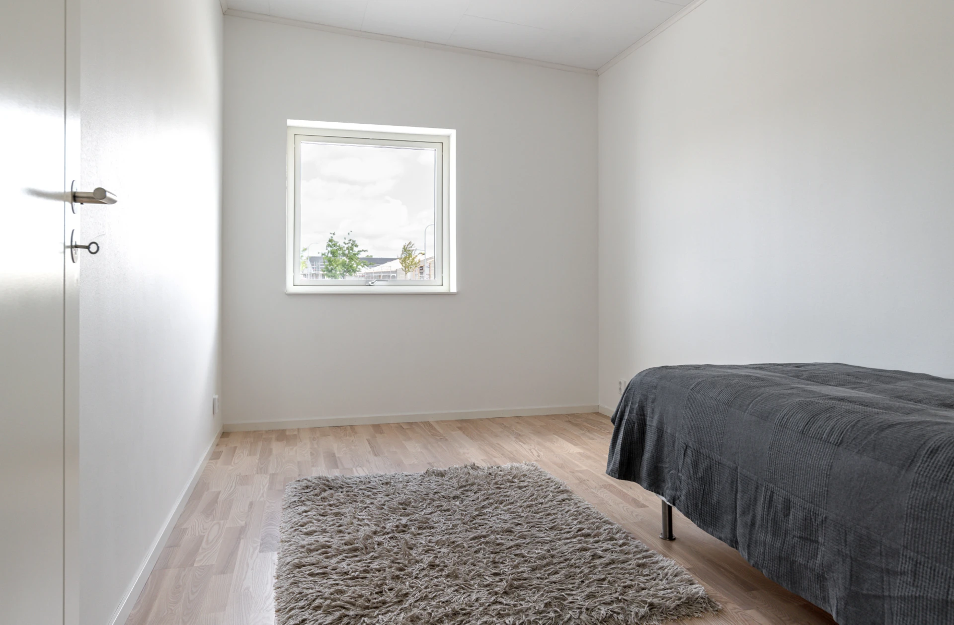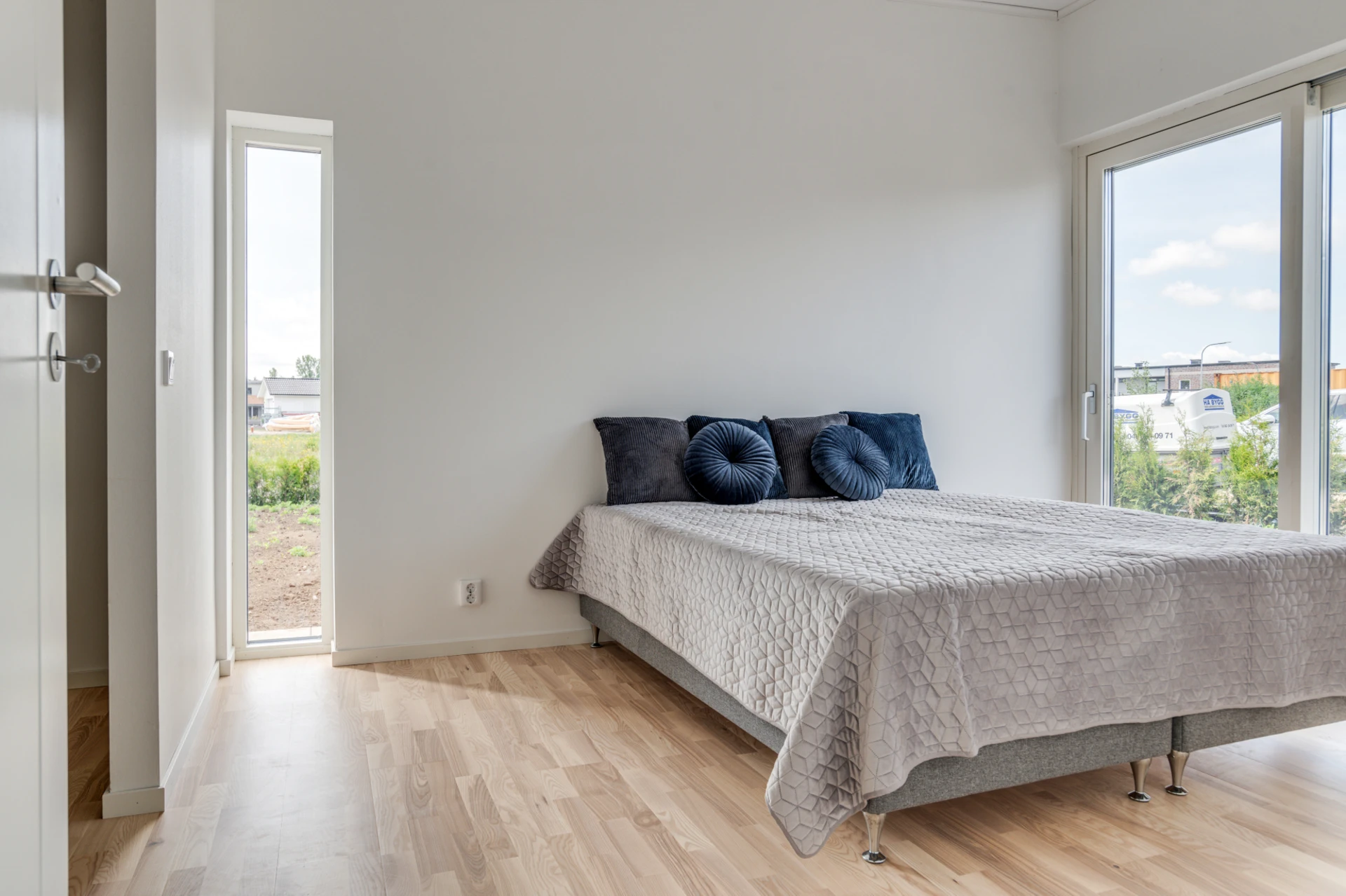 I anslutning till både entrén och duschrummet hittar du detta harmoniska sovrum. Rummet är smakfullt inrett med vitpigmenterad askparkett i matt lack och målade väggar som ger en ljus och rofylld känsla. Här finns gott om plats för garderober och möjlighet att skapa en praktisk förvaring efter behov.