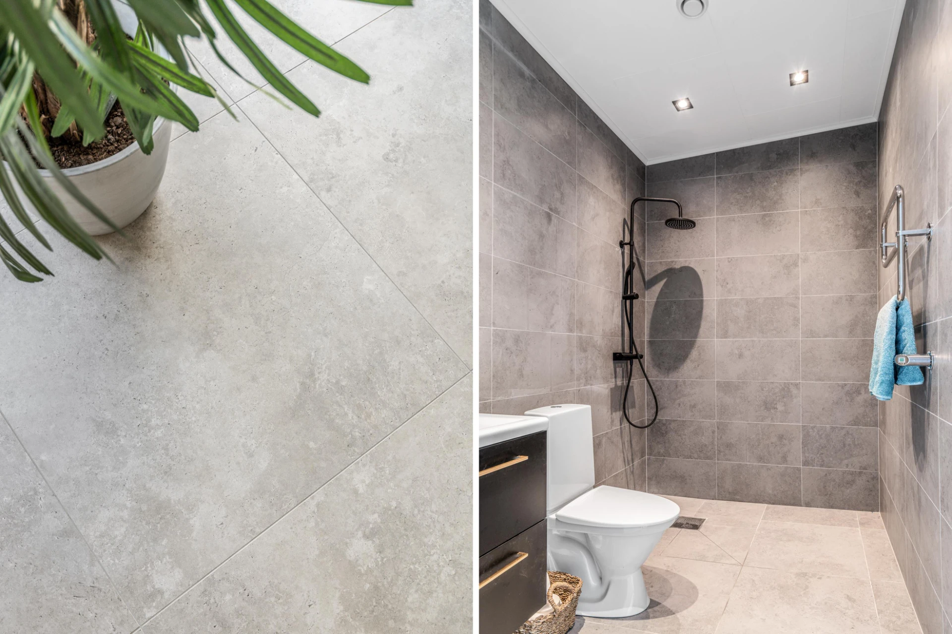 Praktiskt och helkaklat. Här finns arbetsbänk med vask samt både tvättmaskin och torktumlare – en funktionell lösning som gör vardagen enkel och bekväm.