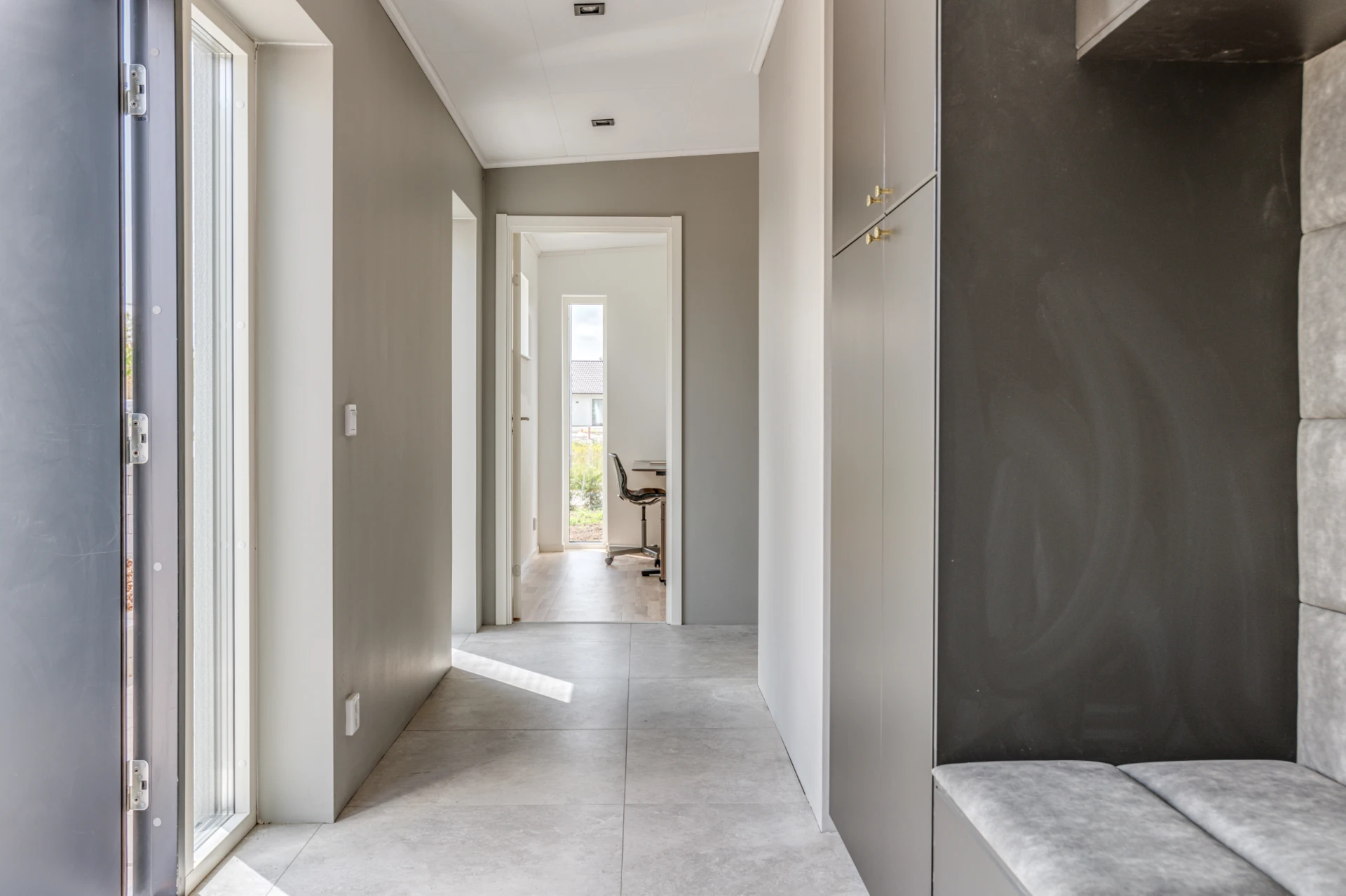 Stig in i en rymlig och välkomnande entré som genast sätter tonen för resten av huset. Här finns gott om plats för både avhängning och förvaring, elegant löst med en platsbyggd garderob och integrerad sittmöbel. Golvet pryds av exklusiva grå granitkeramikplattor som tillsammans med målade väggar och stilfull spotlightsbelysning skapar en modern och inbjudande känsla.