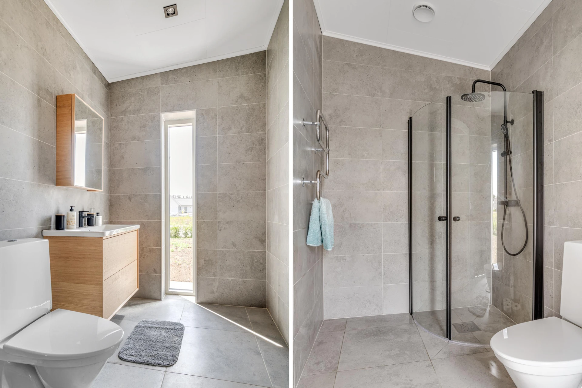 Smakfullt helkaklat duschrum i sobra färger med härligt ljusinsläpp från ett generöst fönsterparti. Här finns duschhörna med glasväggar, handdukstork, tvättställ samt kommod med spegelskåp och spotlightsbelysning – en kombination av stil och komfort som gör vardagen lite mer lyxig.
