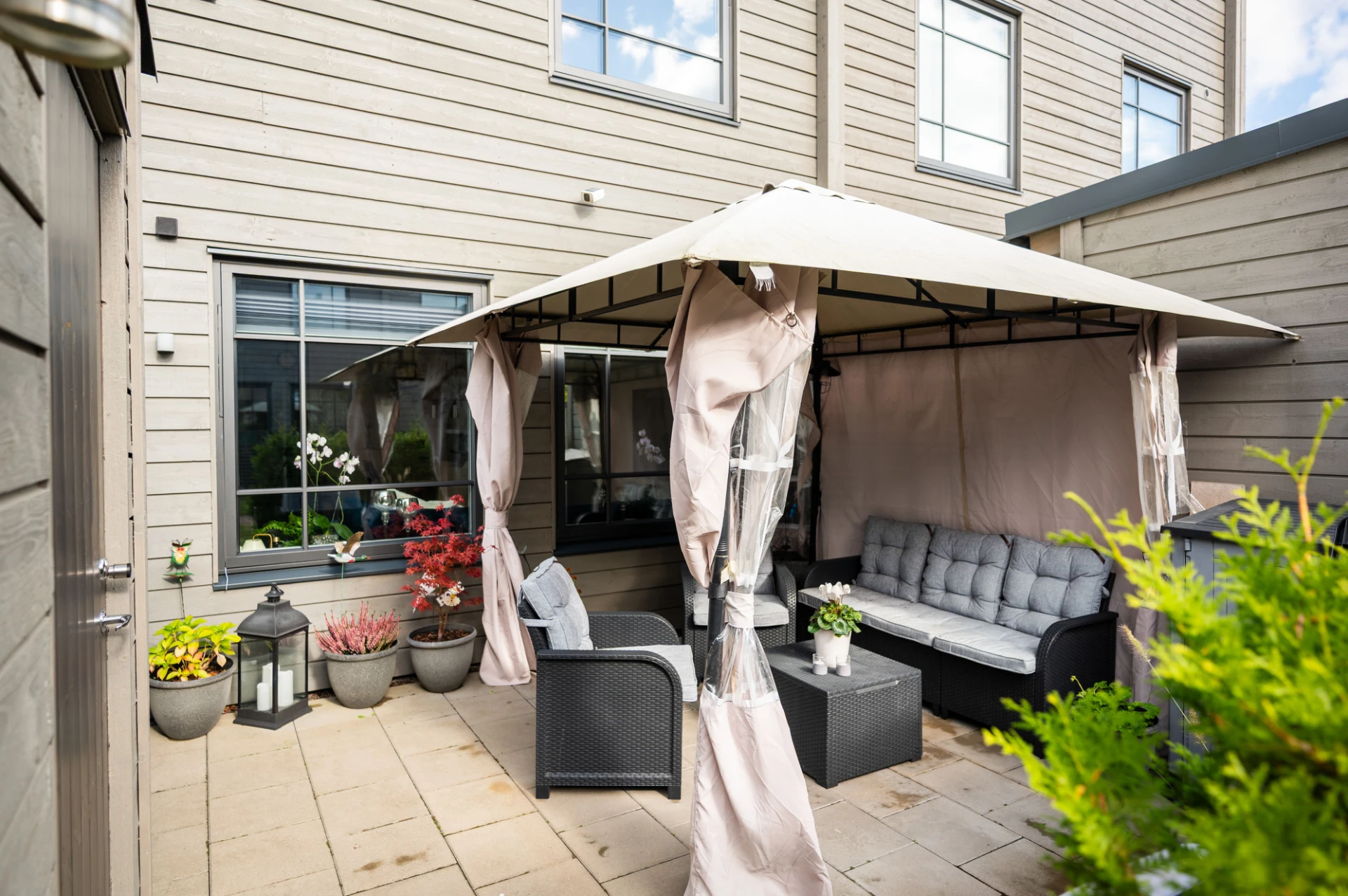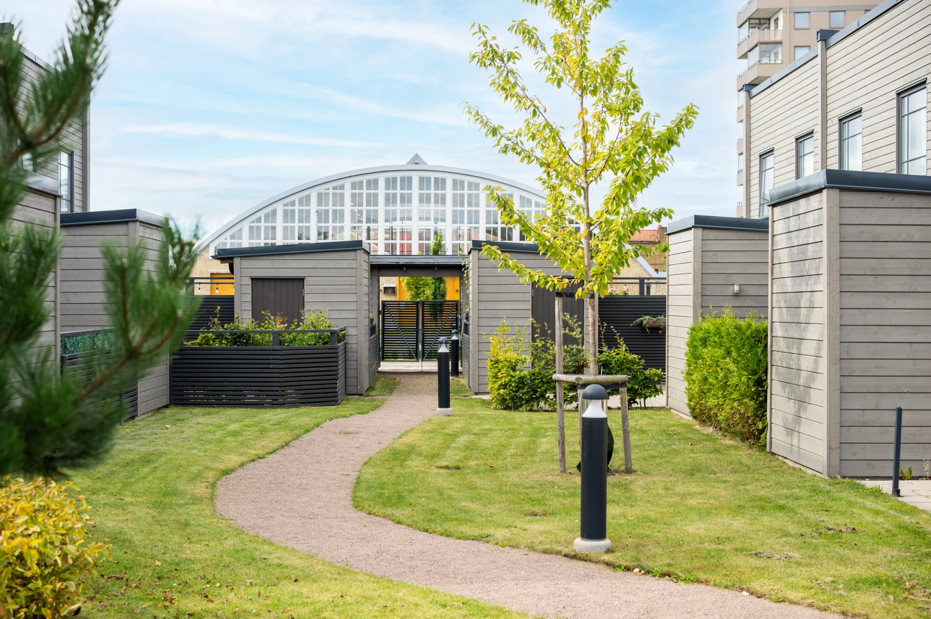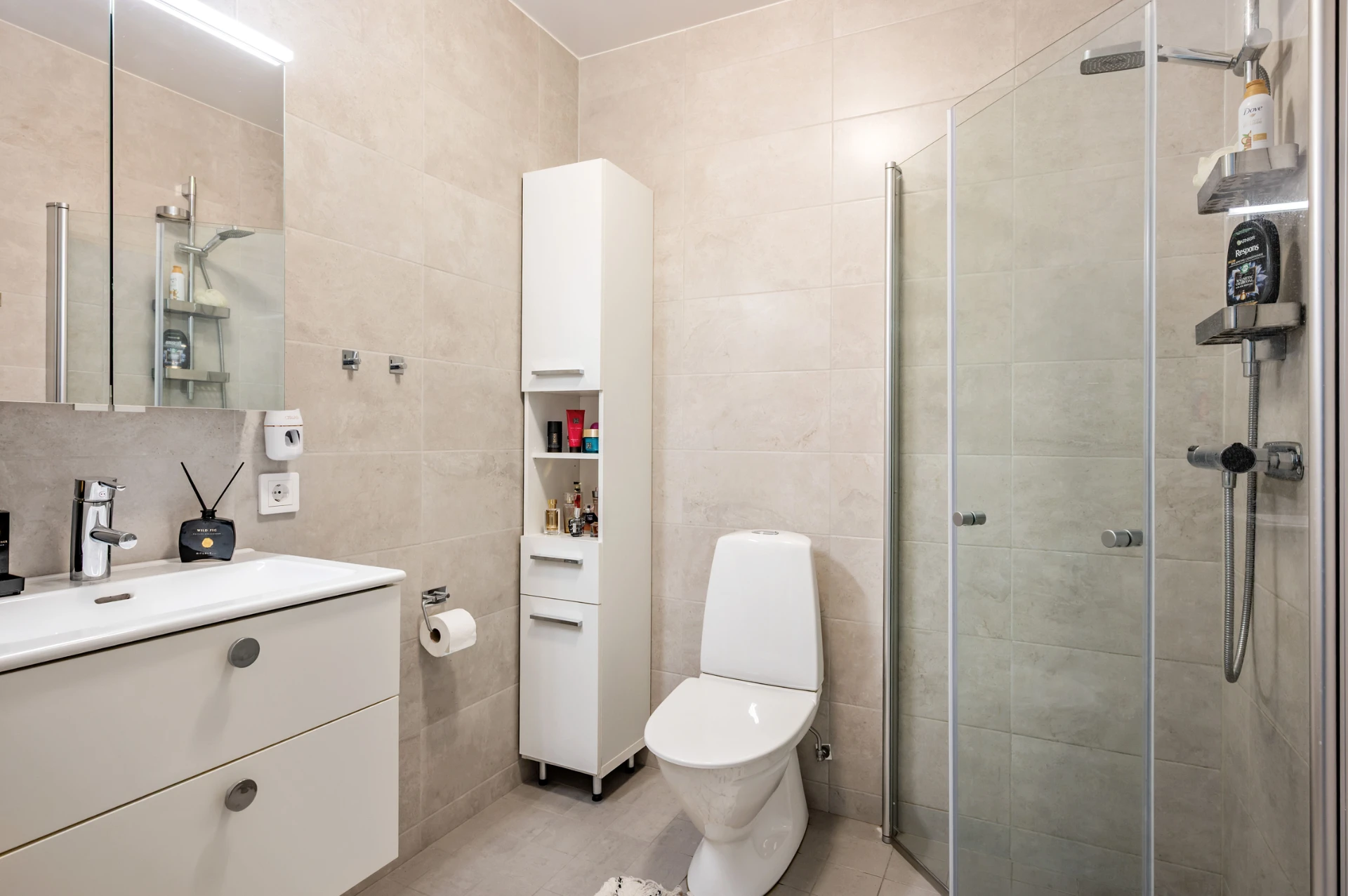 Vitmålade släta väggar. Grått klinkergolv. Garderob. Avhägningsmöjligheter.