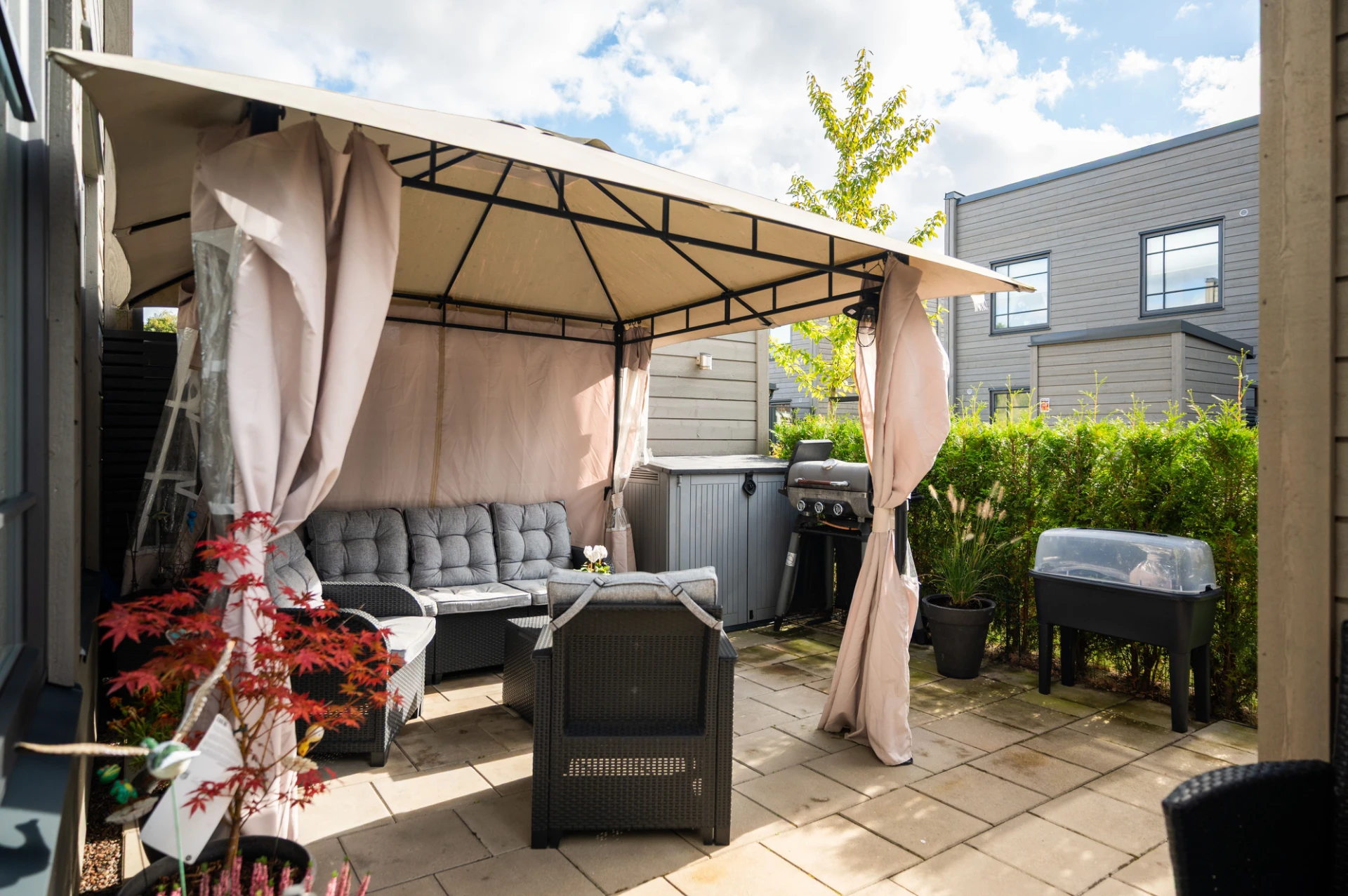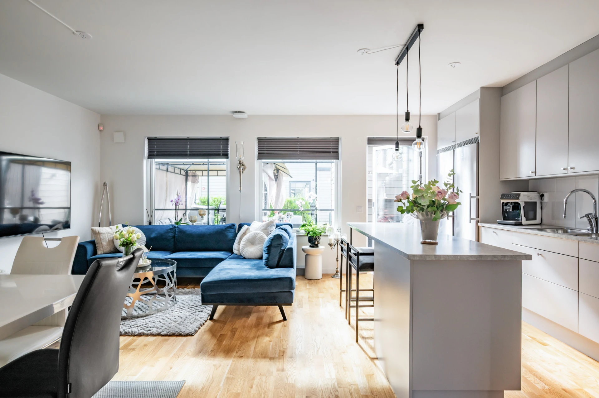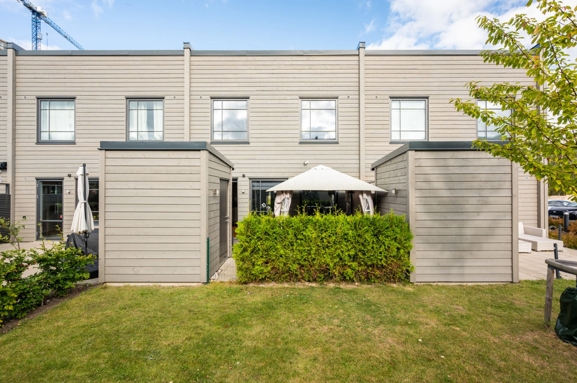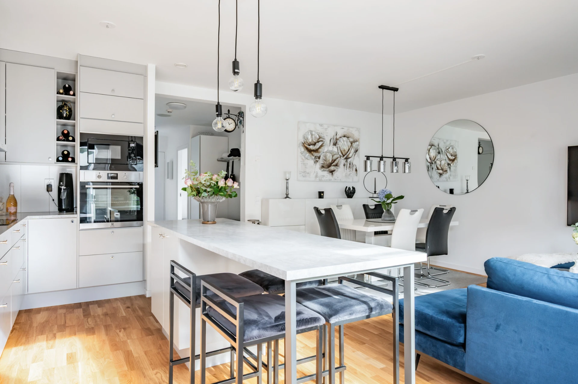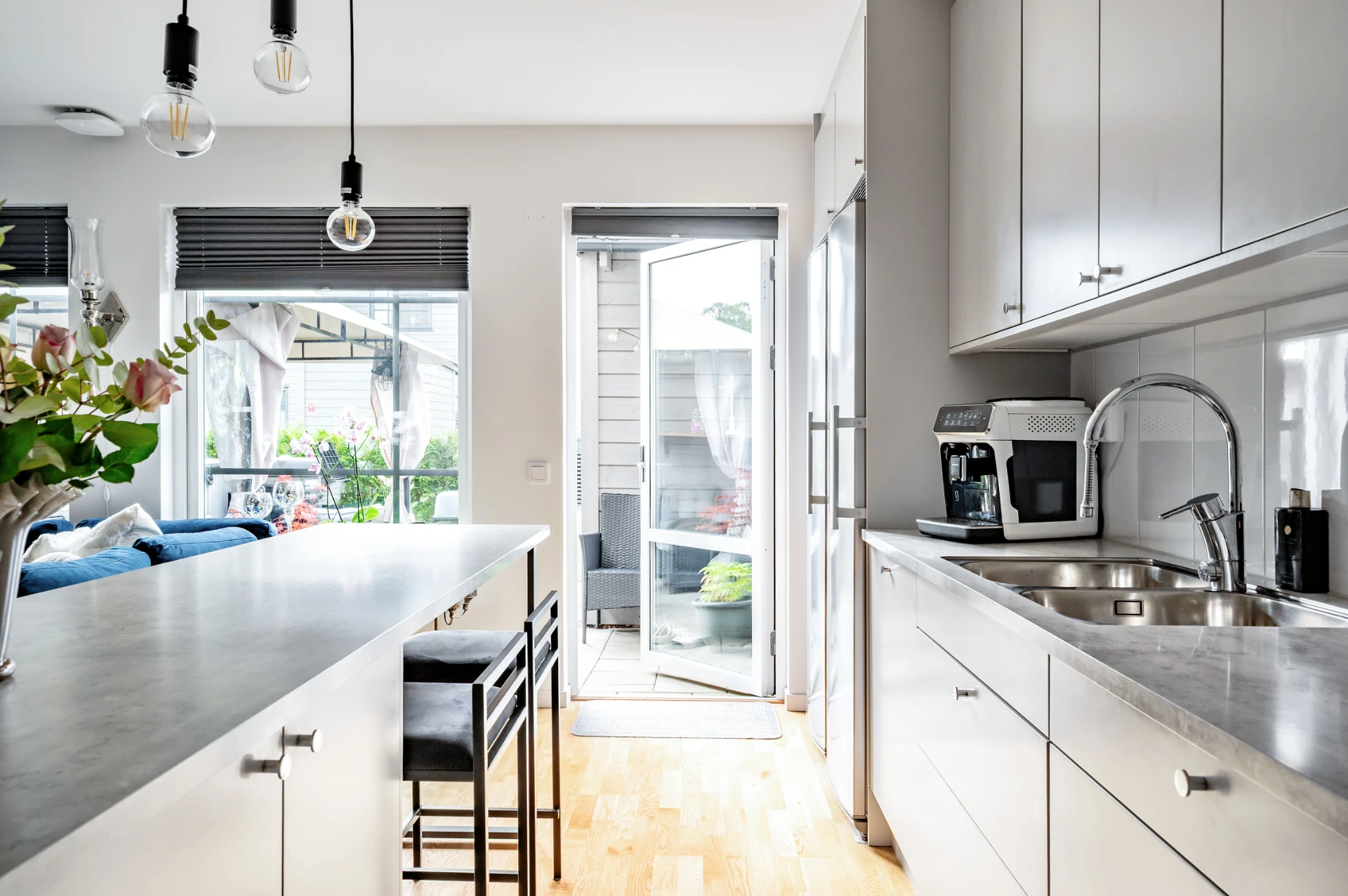 Vitmålade släta väggar. Parkettgolv i ek. Grått kök med grå laminatskiva i betongmönster med knoppar i krom. Vitkaklat stänkskydd. Rostfri kyl, frys, diskmaskin, spishäll, ugn samt microvågsugn från Electrolux.