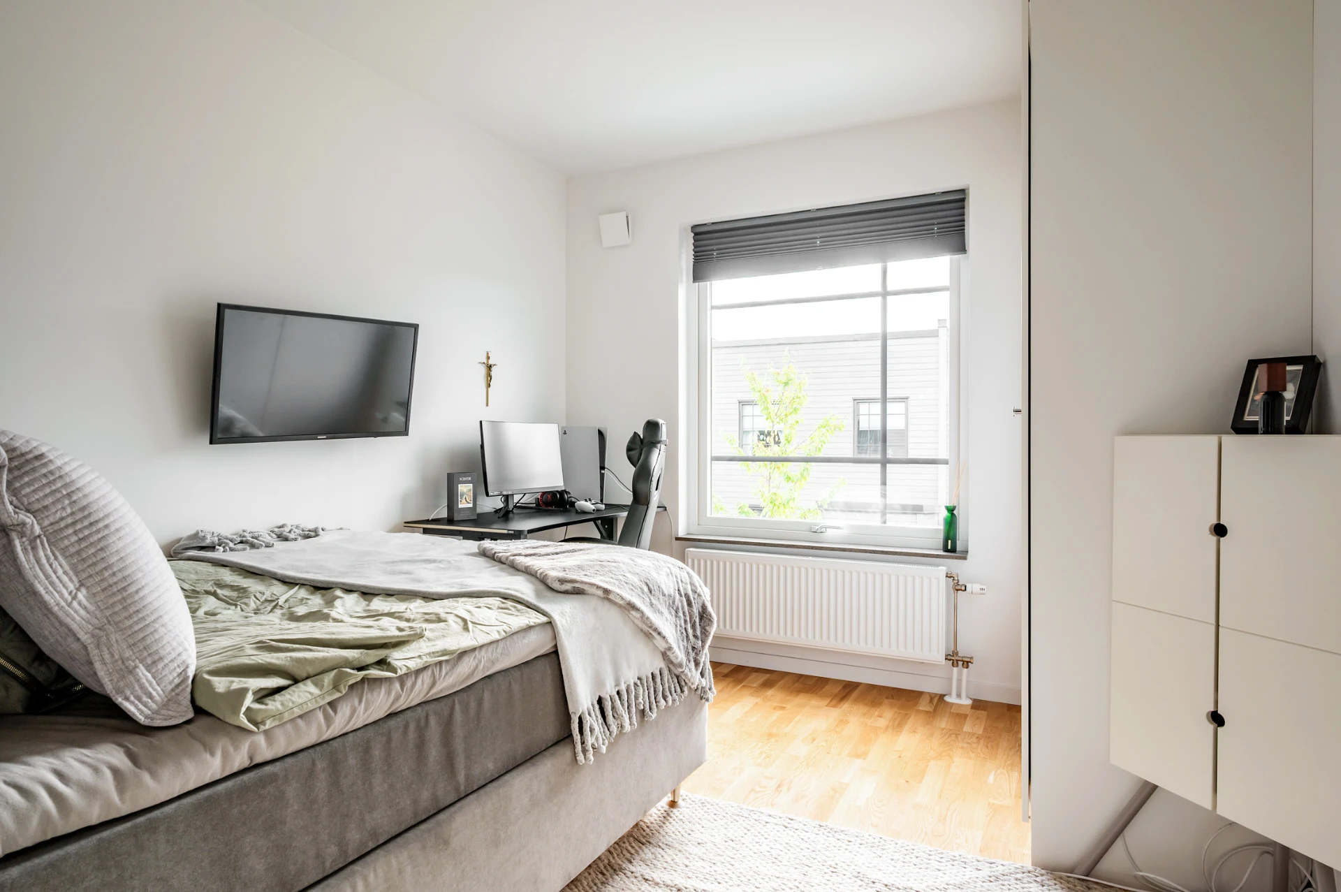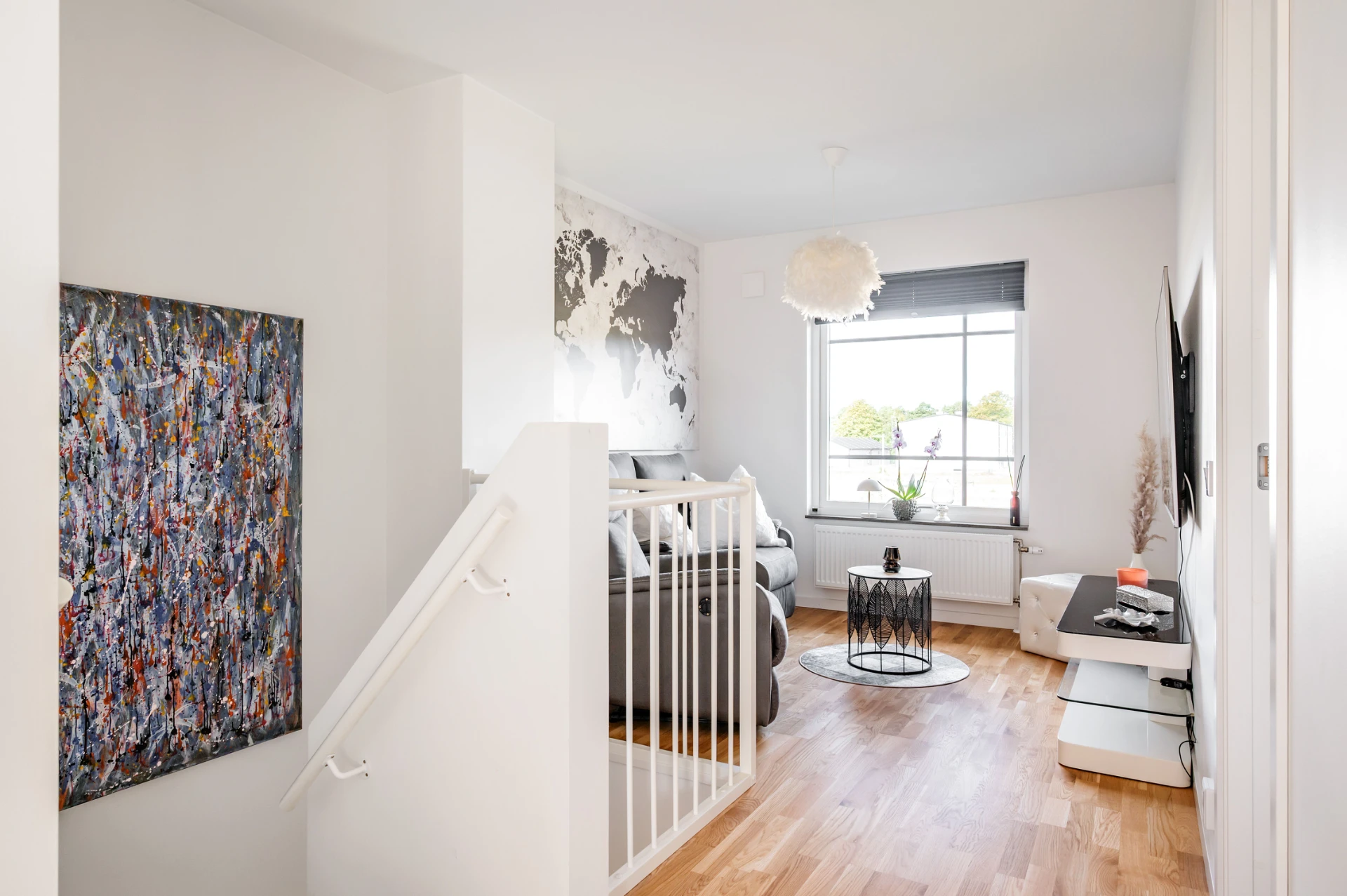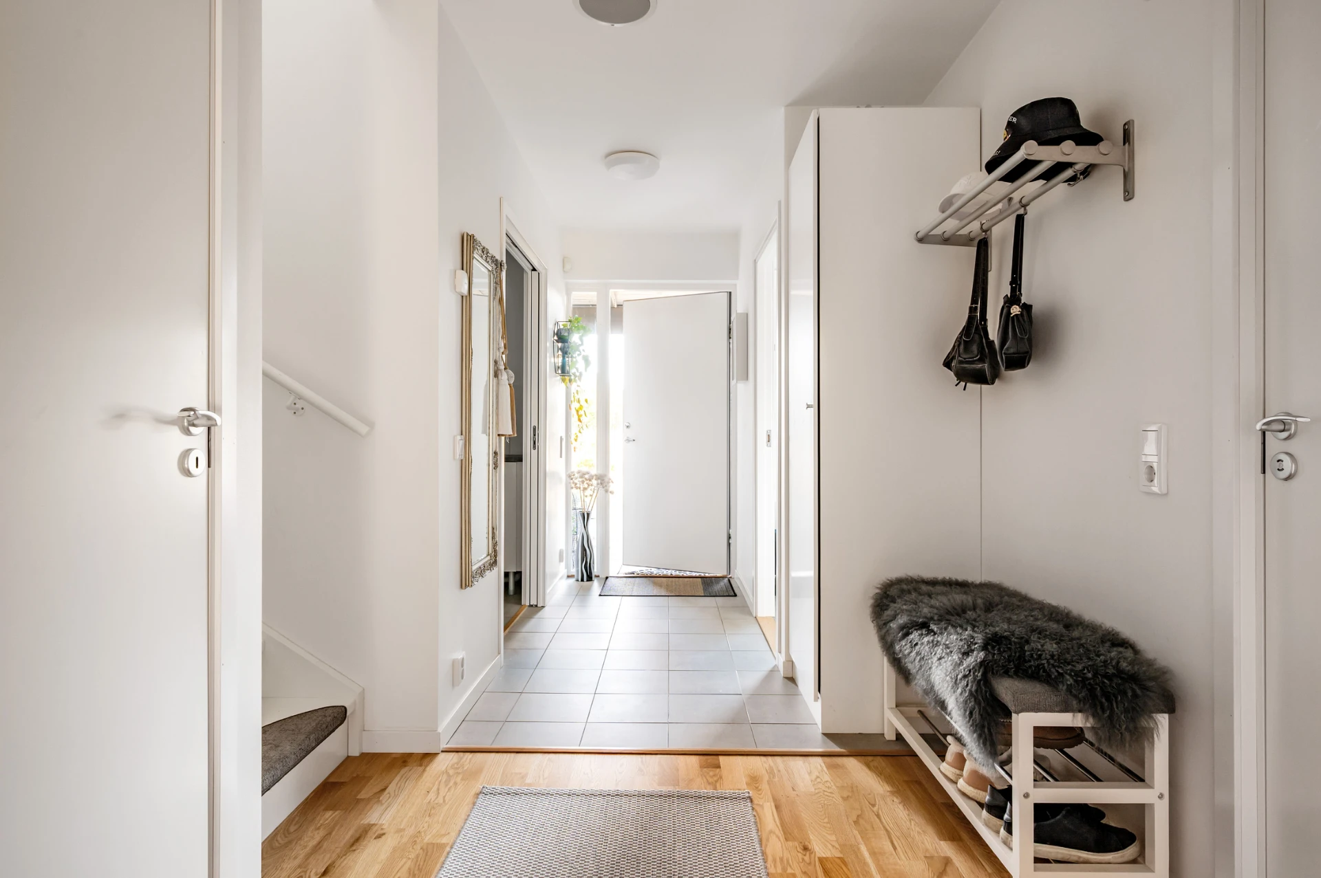 Vitmålade släta väggar. Parkettgolv i ek. Garderober.