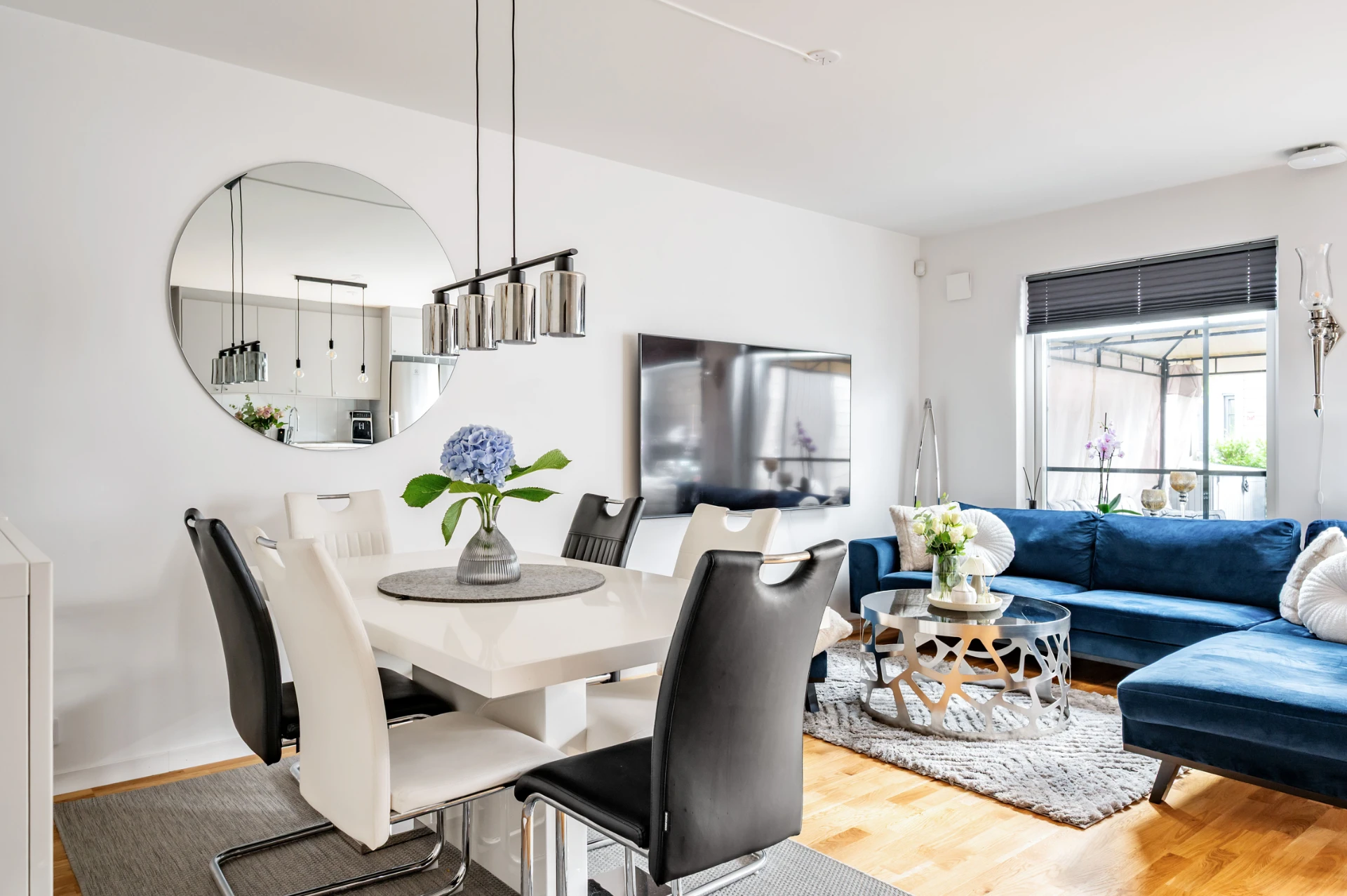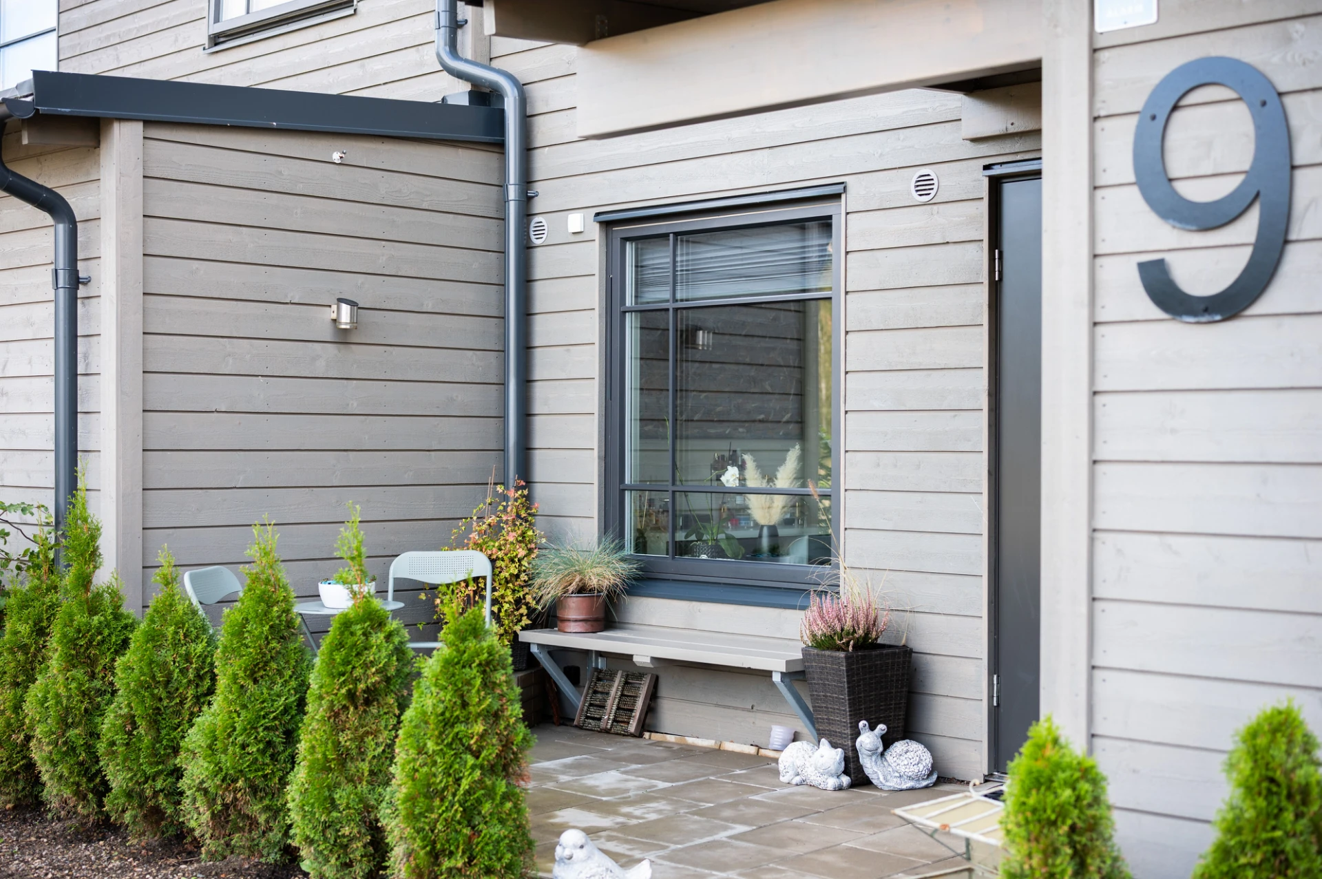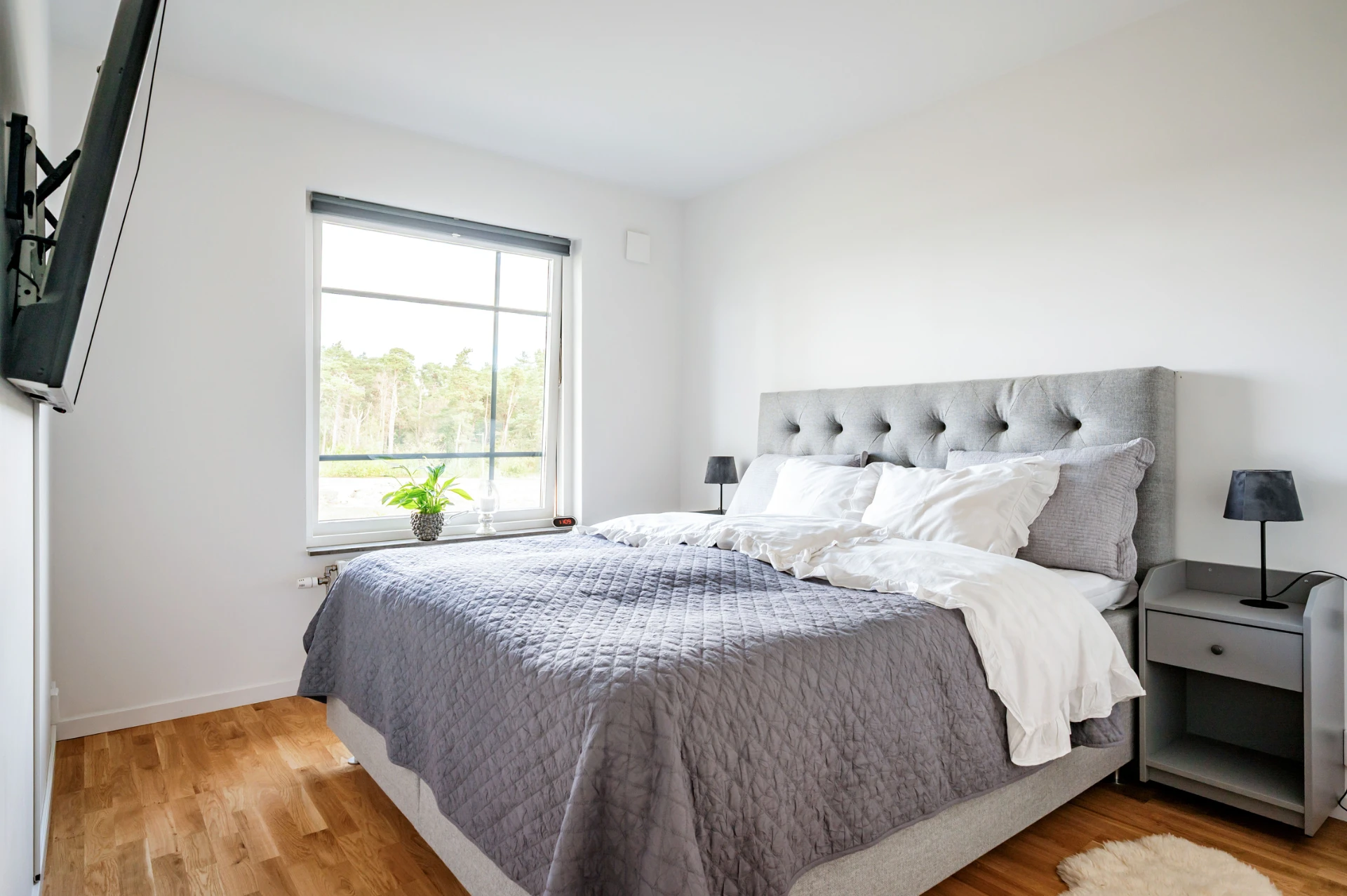 Vitmålade släta väggar. Parkettgolv i ek. Garderober.