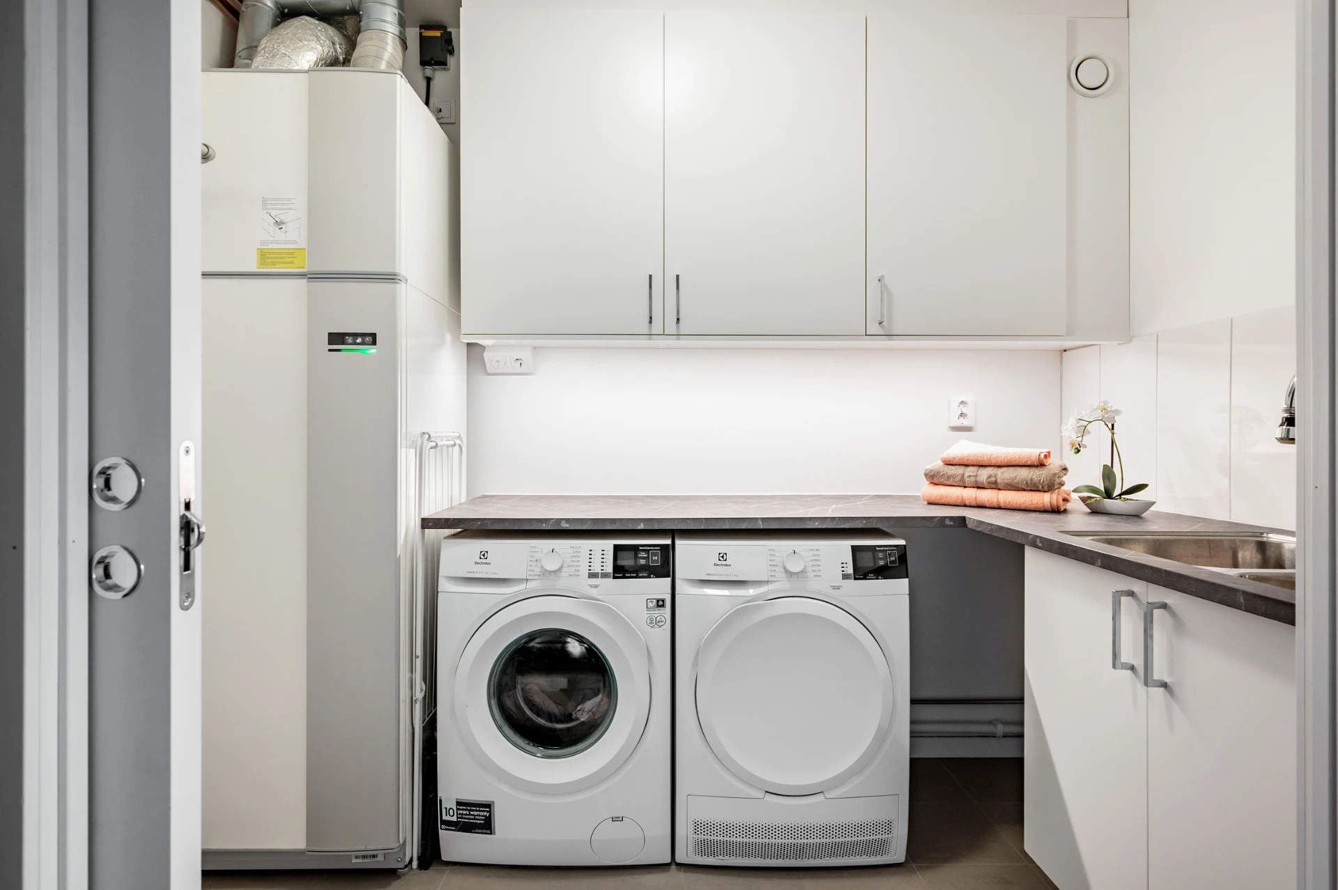 Vitmålade släta väggar. Grått klinkergolv. Svartmönstrad bänkskiva i laminat, vita luckor. Tvättmaskin samt torktumlare. Tvättställ.