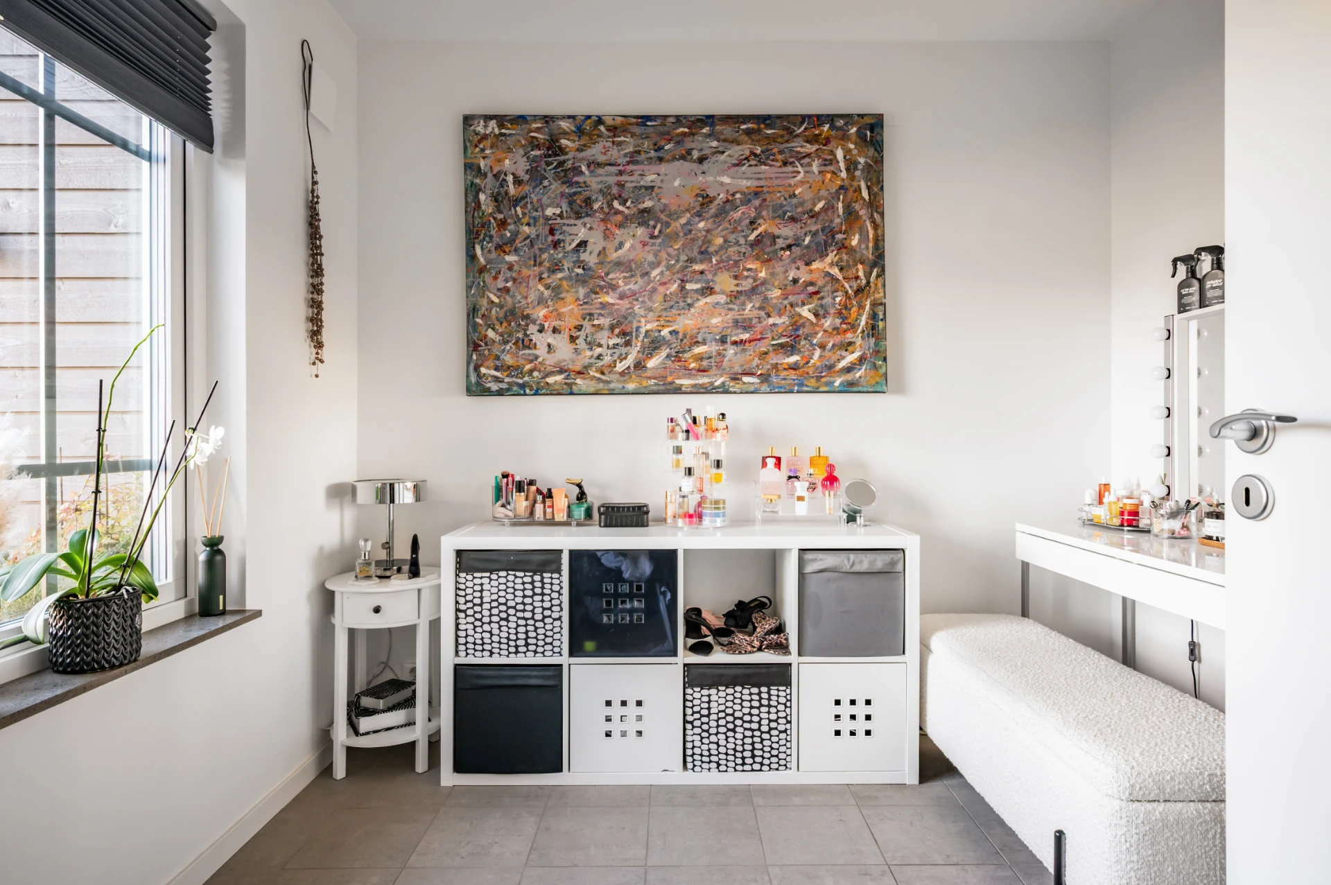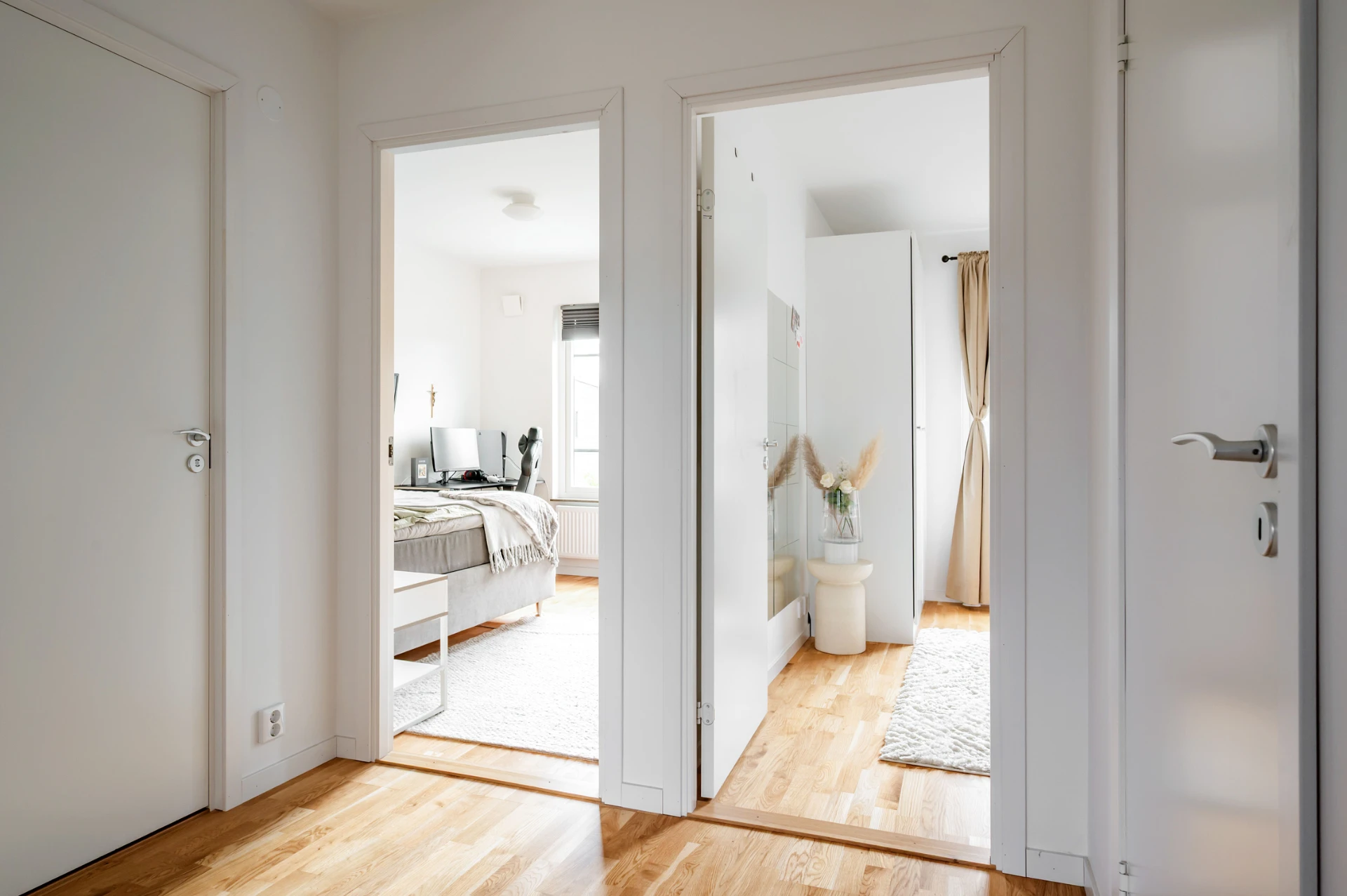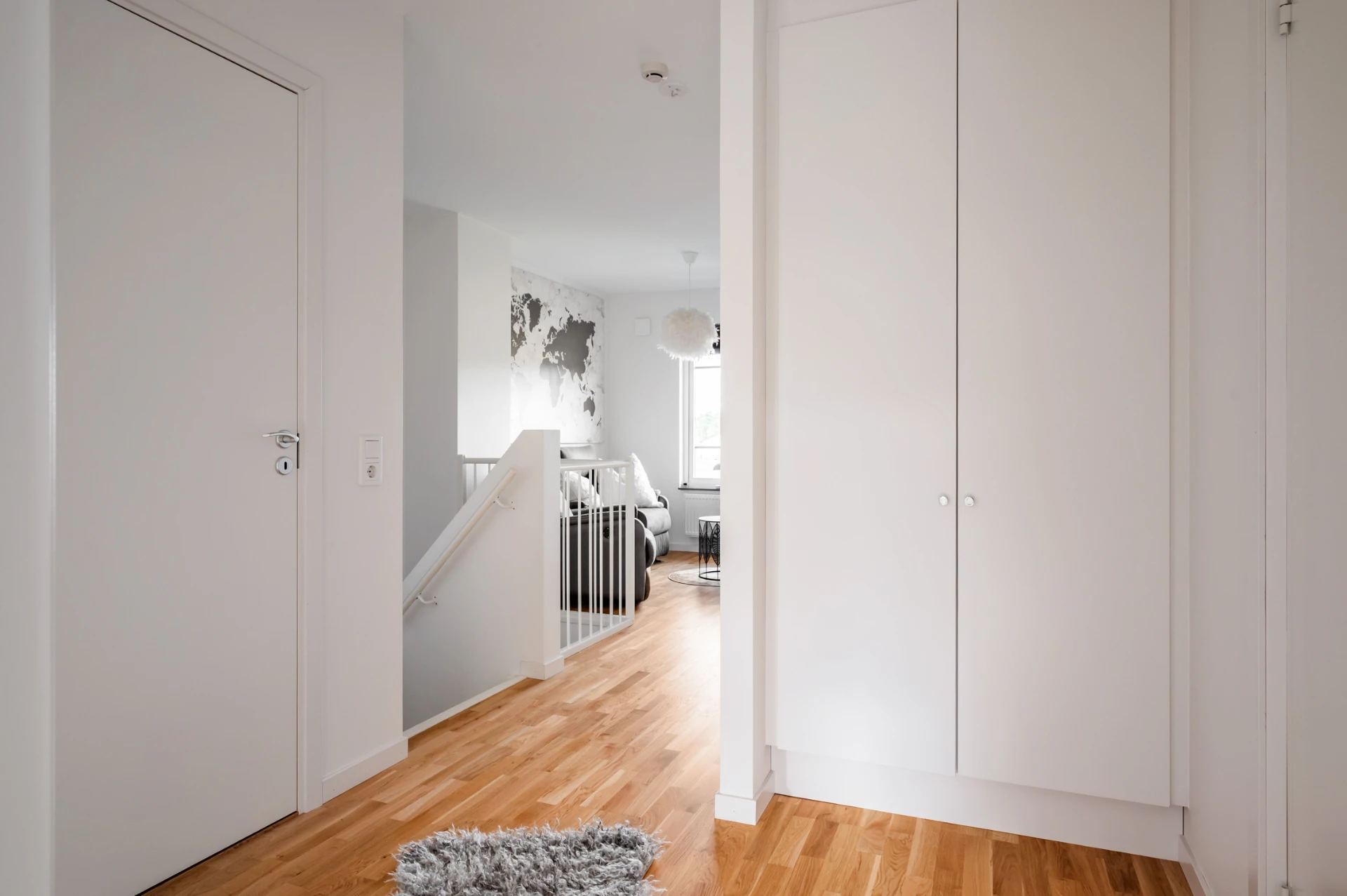 Vitmålade släta väggar. Parkettgolv i ek. Garderober
