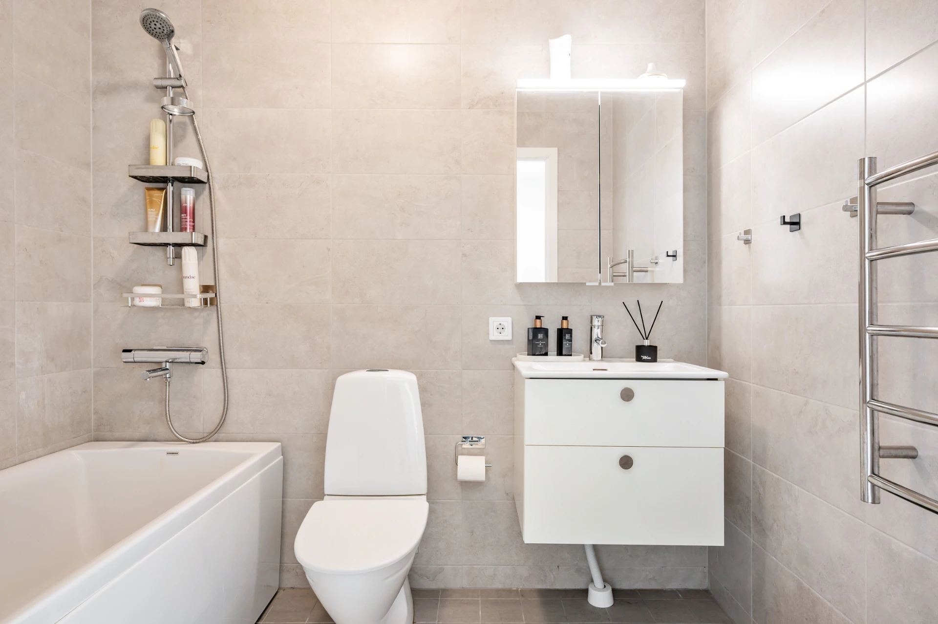 Gråvit kakel med grått klinker, badkar. Tvättställ, kommod, spegelskåp, WC.