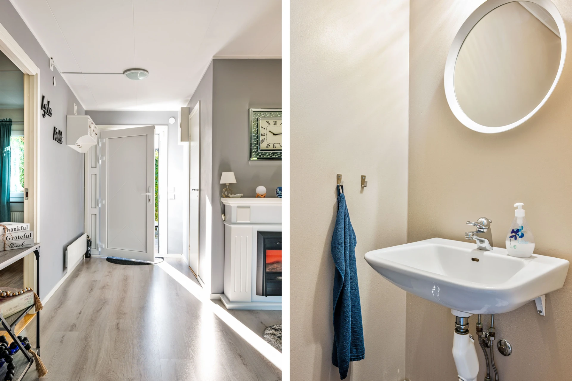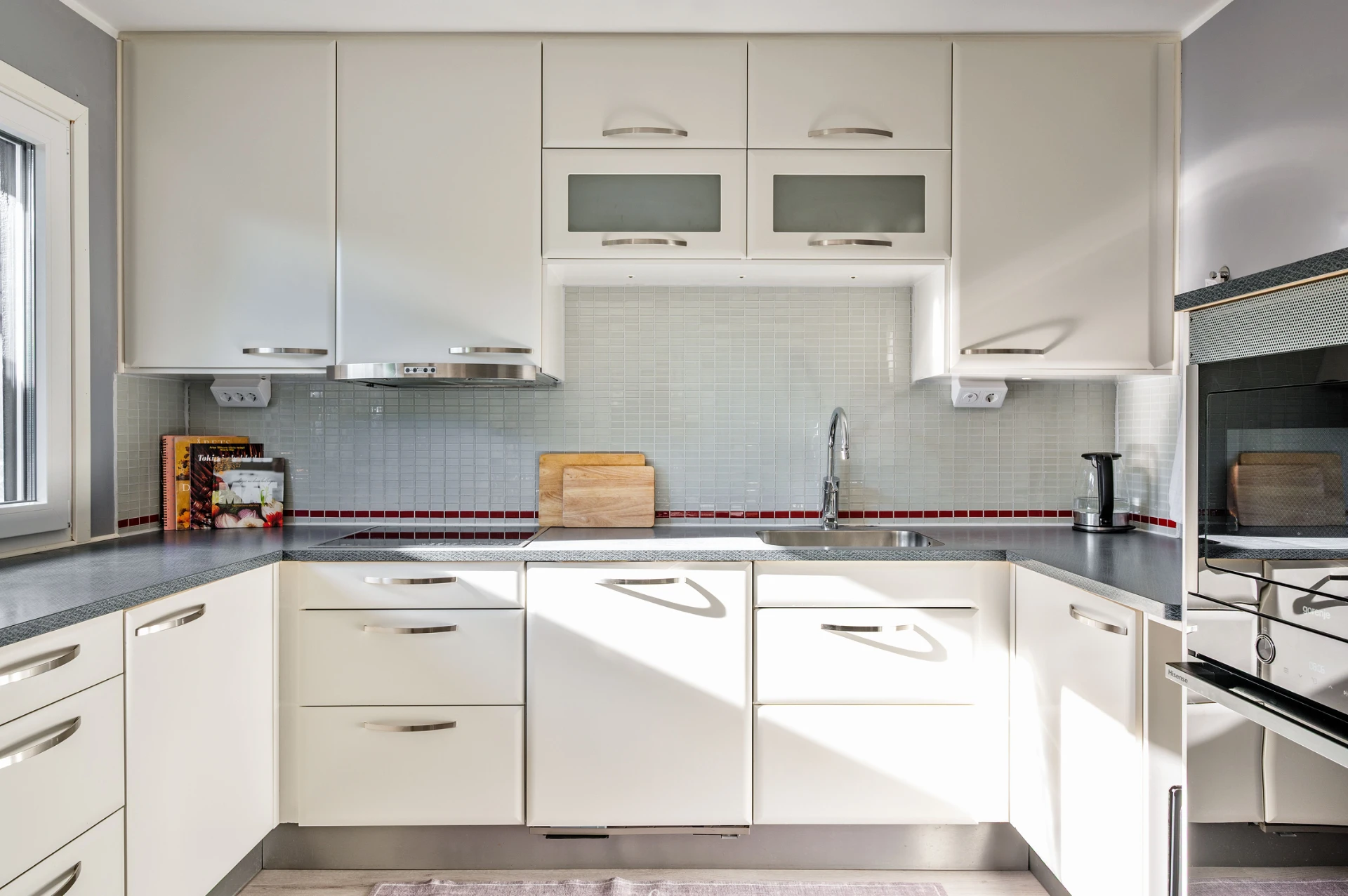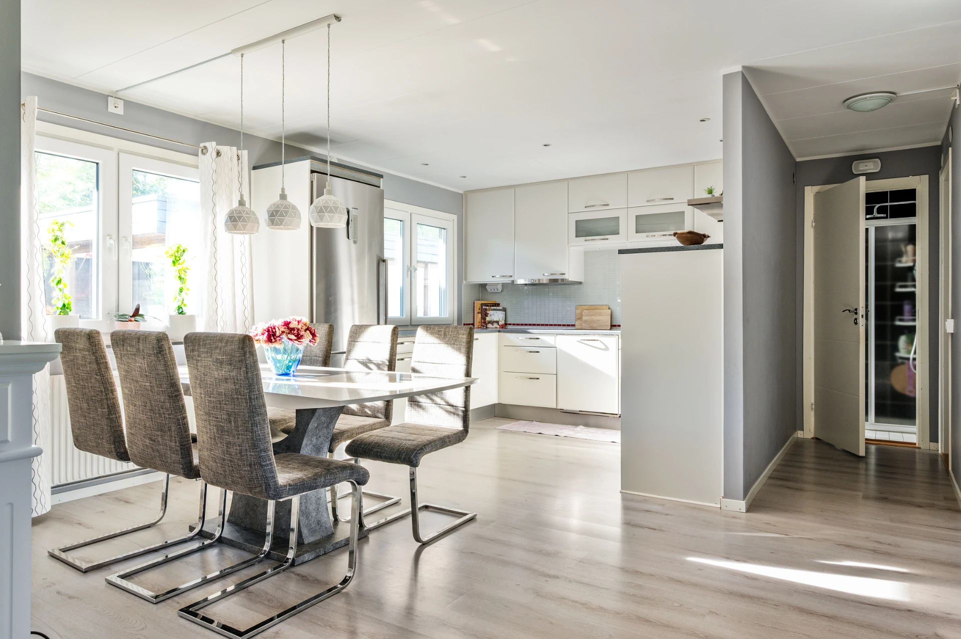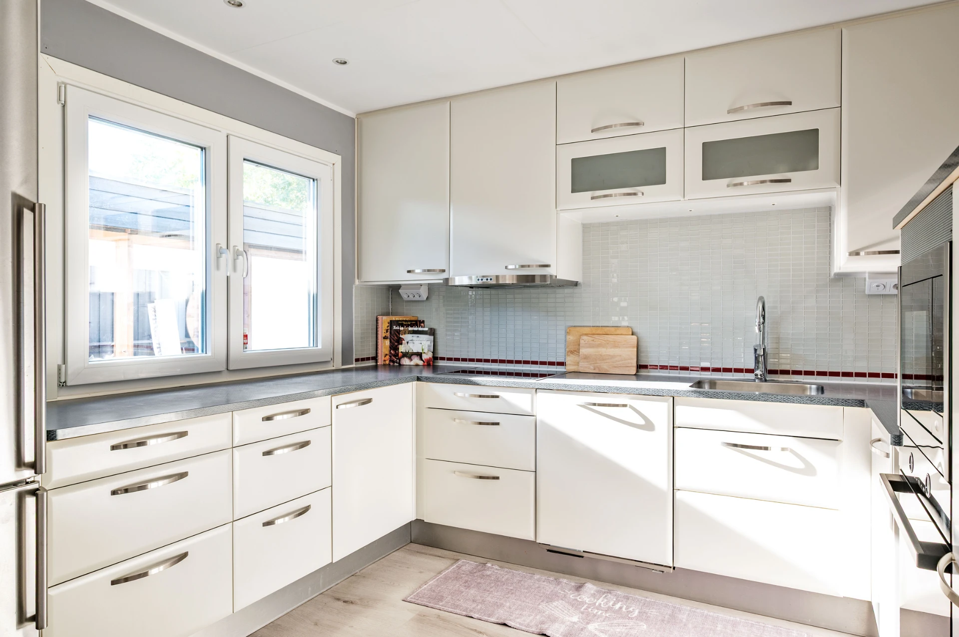 Vita luckor med laminatbänksiva med dubbelfönster ovan, svart häll med rostfri fläkt, ugn och mikro i arbetshöjd och kombinerad kyl/frys. Öppen planlösning till matplats med och vardagsrum med enhetligt ljust laminatgolv och grå väggar. Genomgående ljust av fönster på bägge sidor.