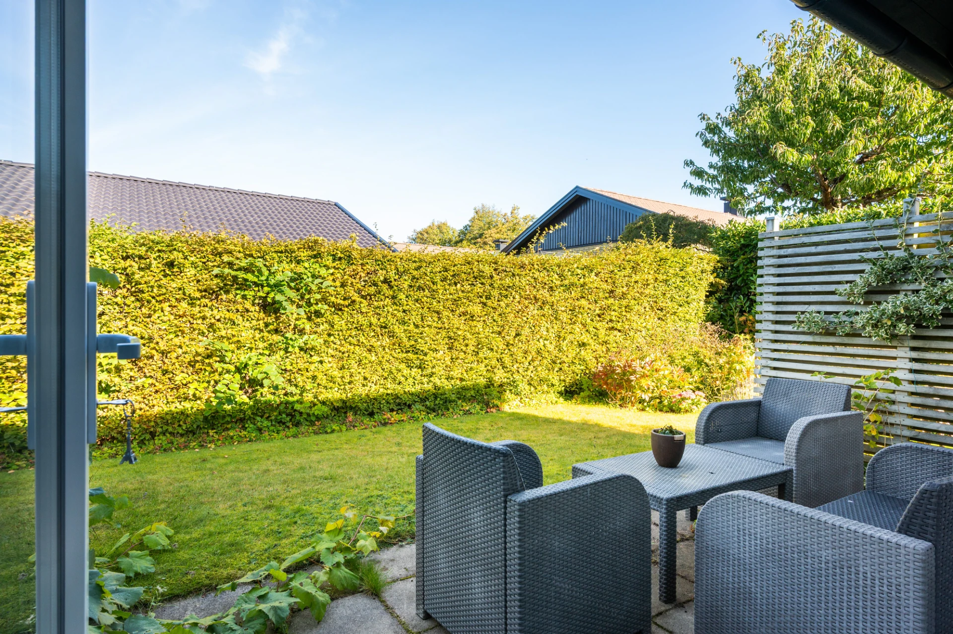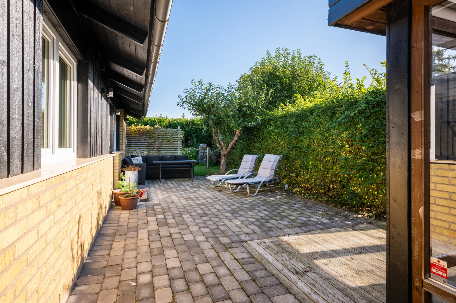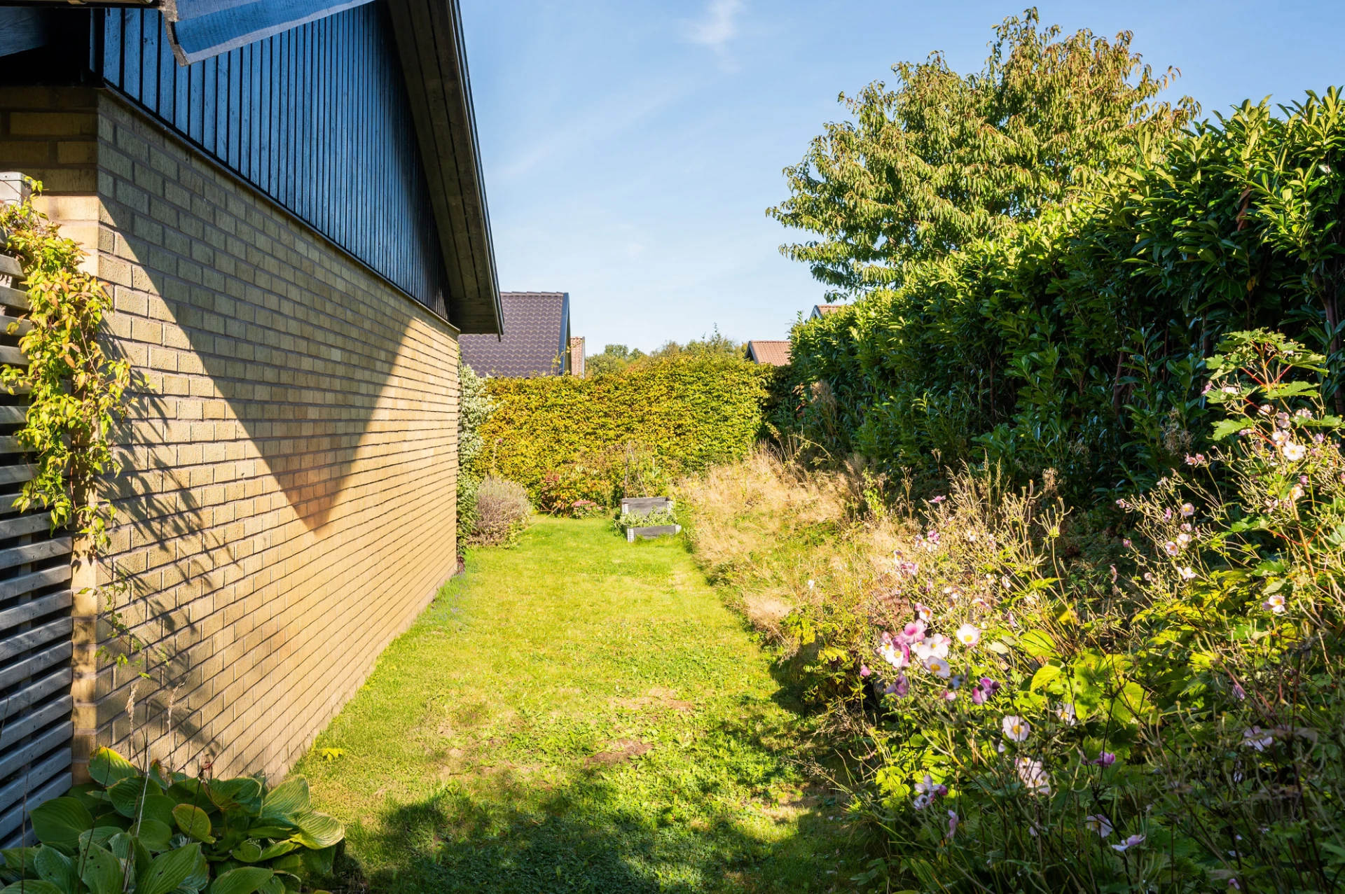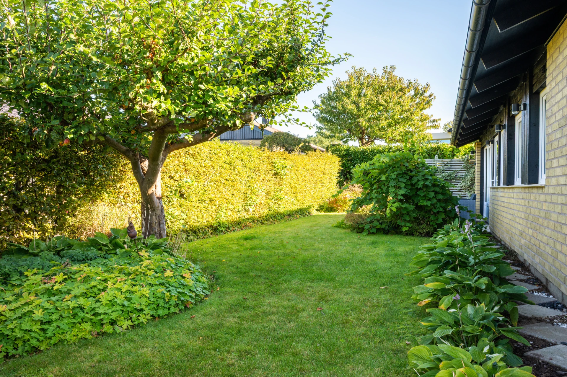 Gräsmatta, insynsskyddande häck, stenlagd uteplats, buskar och träd.