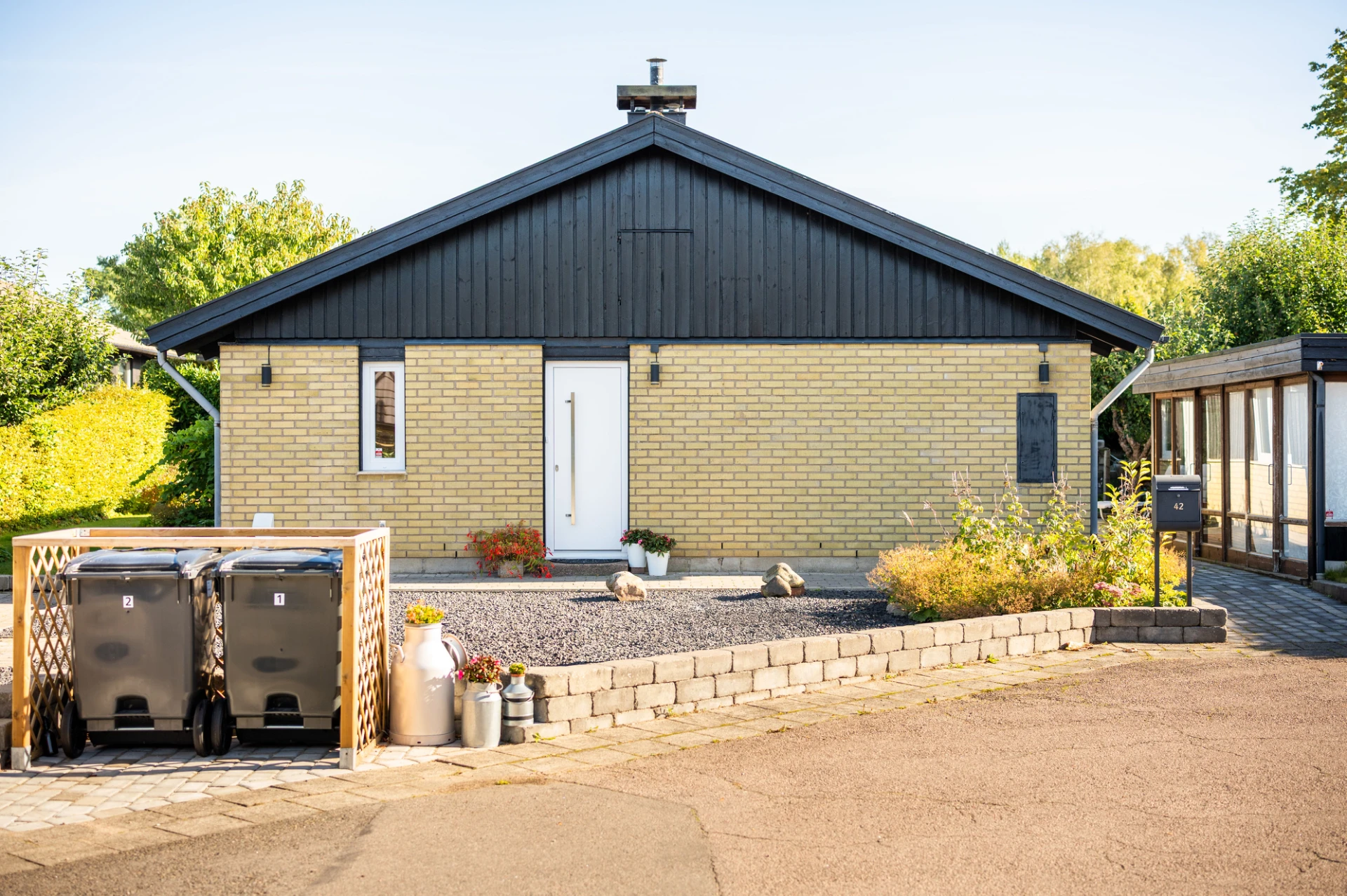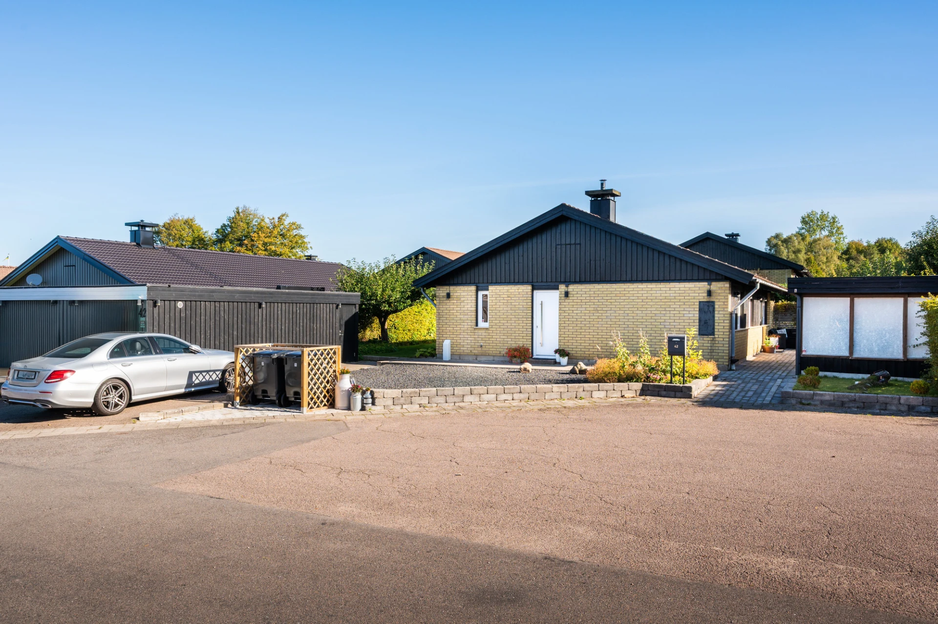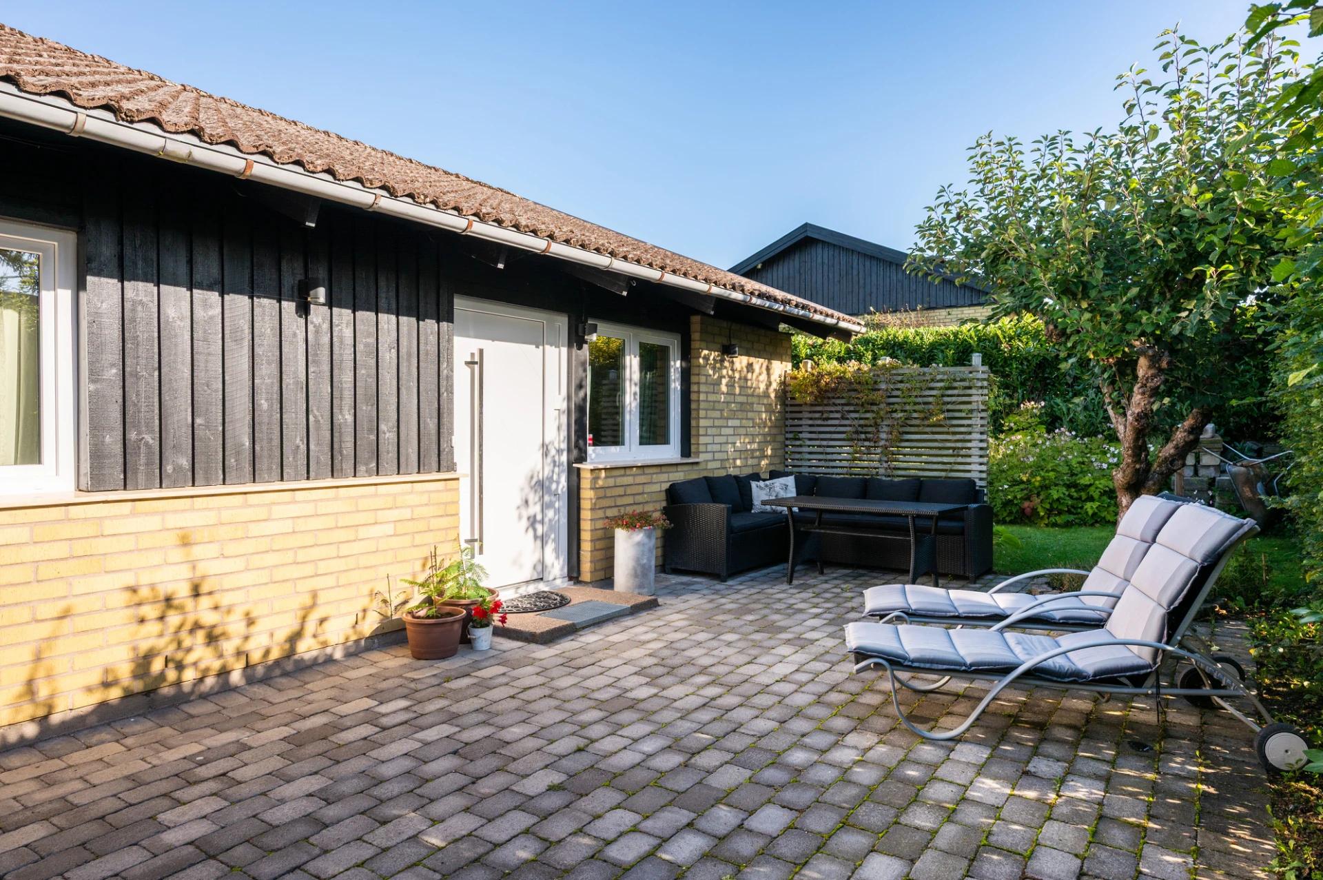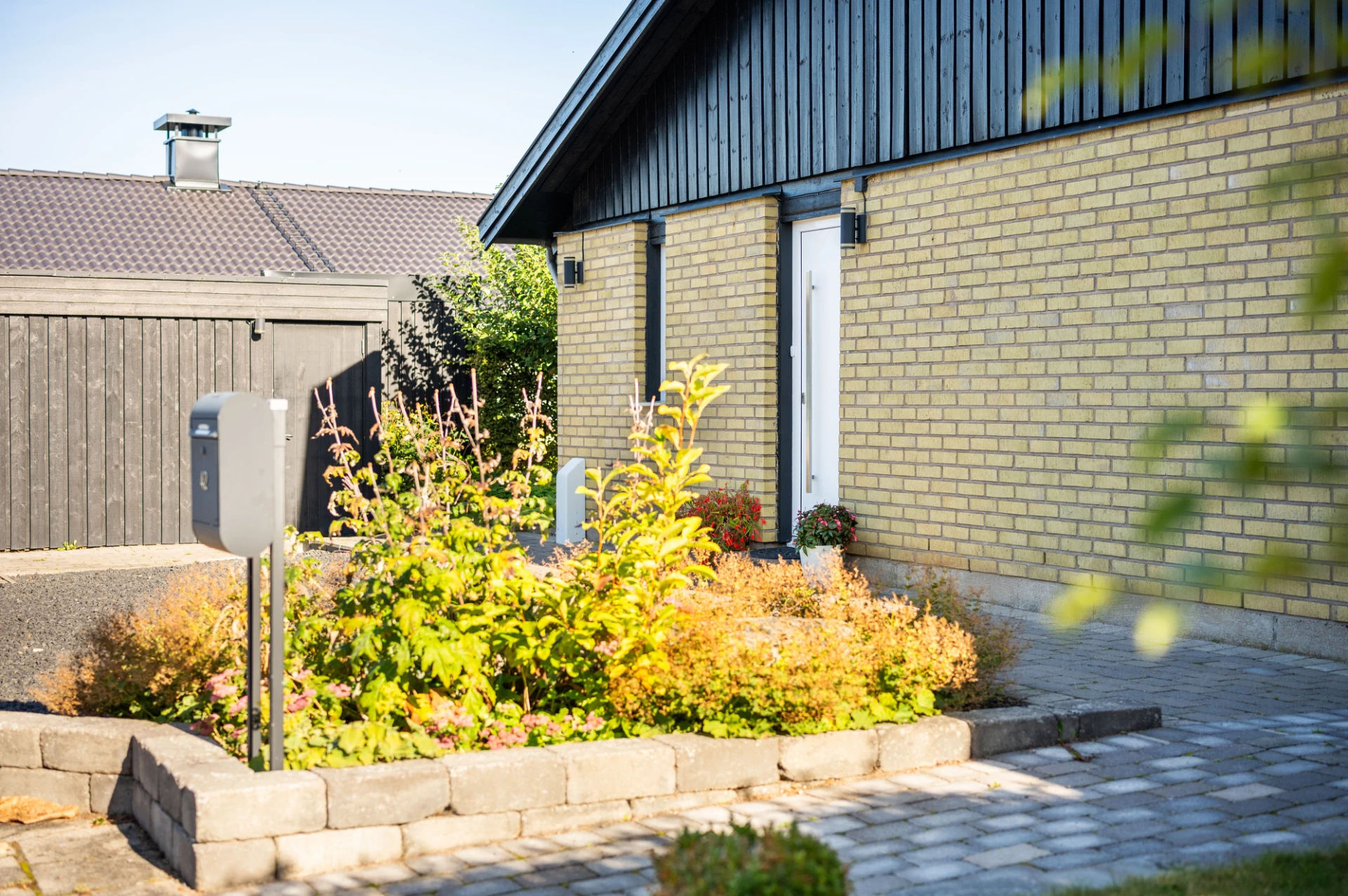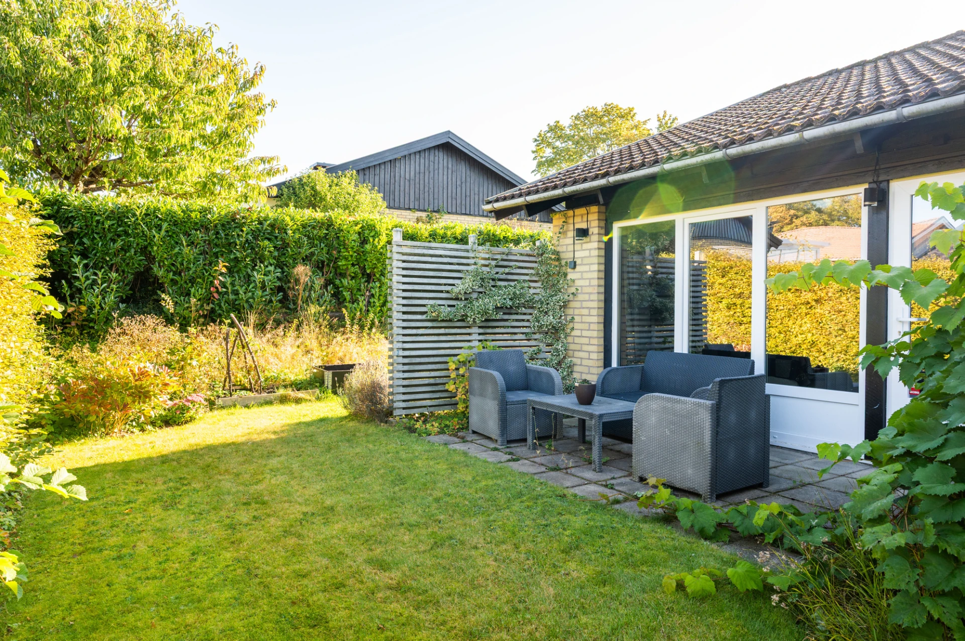 Gräsmatta, insynsskyddande häck, stenlagd uteplats, buskar och träd.